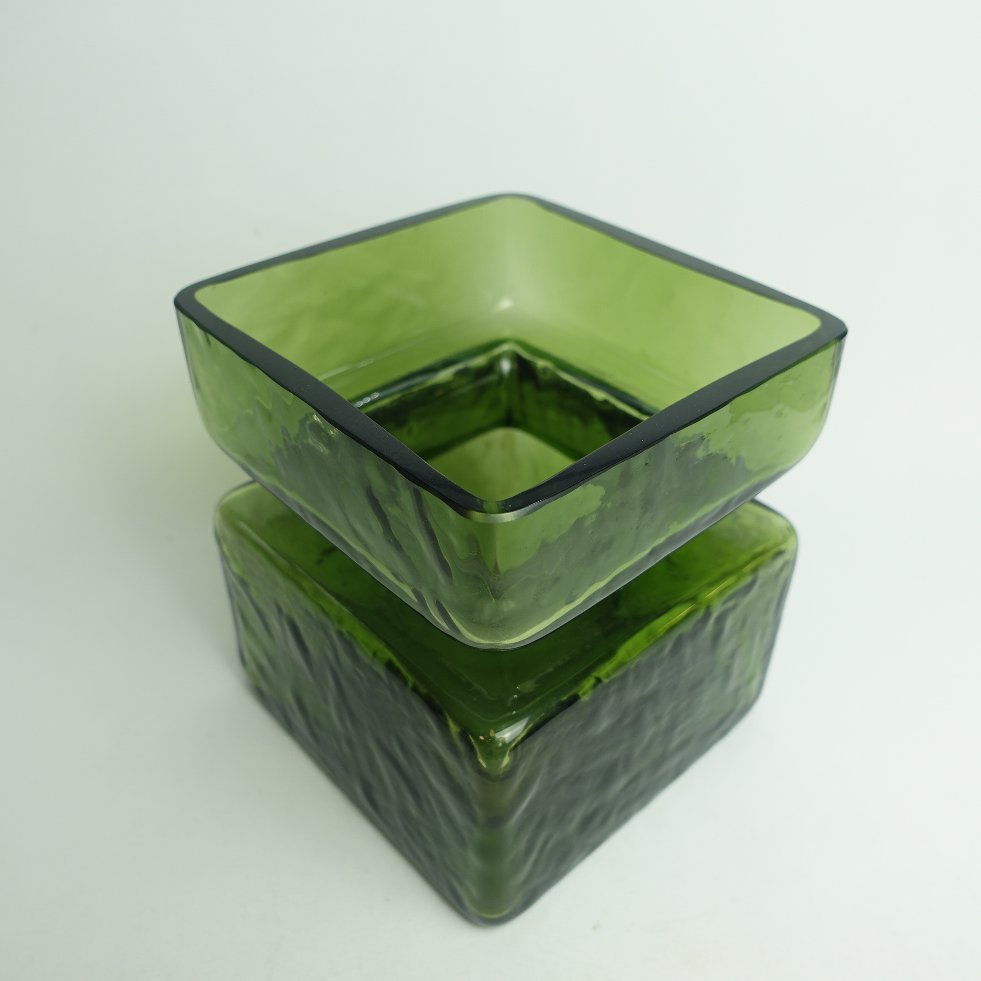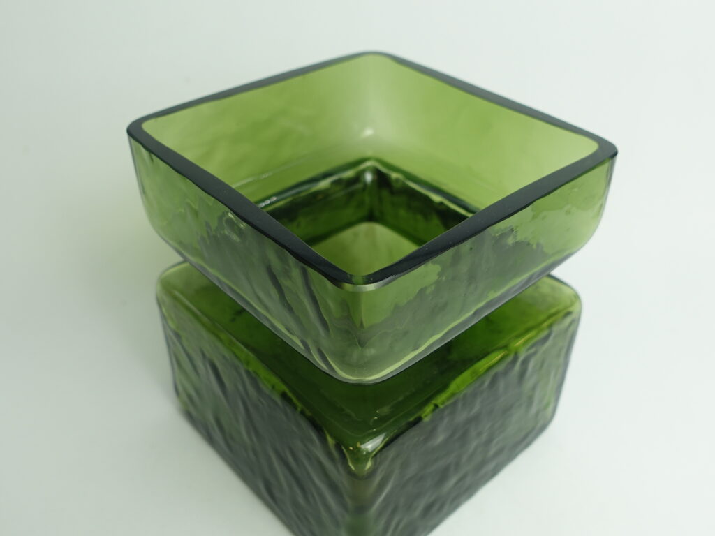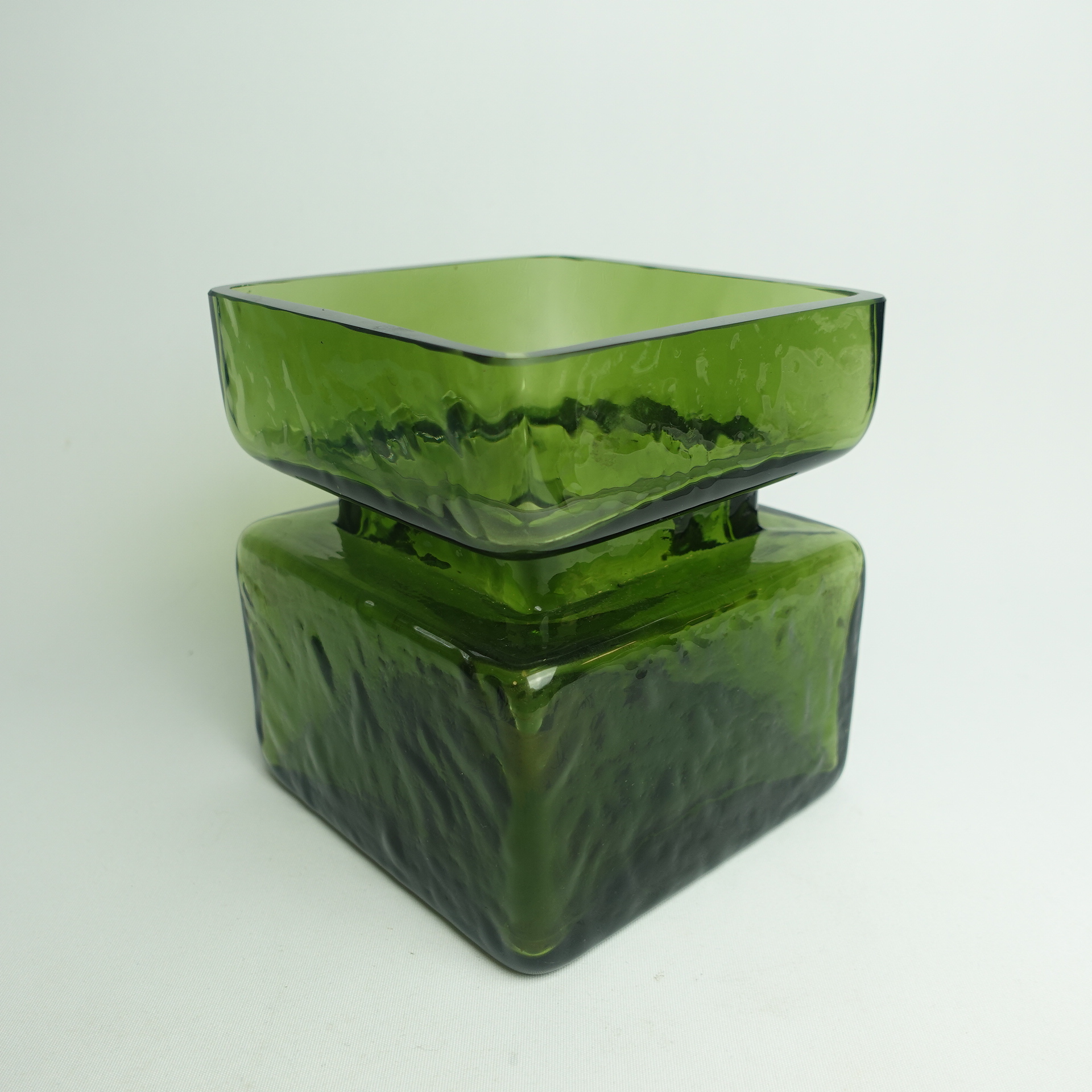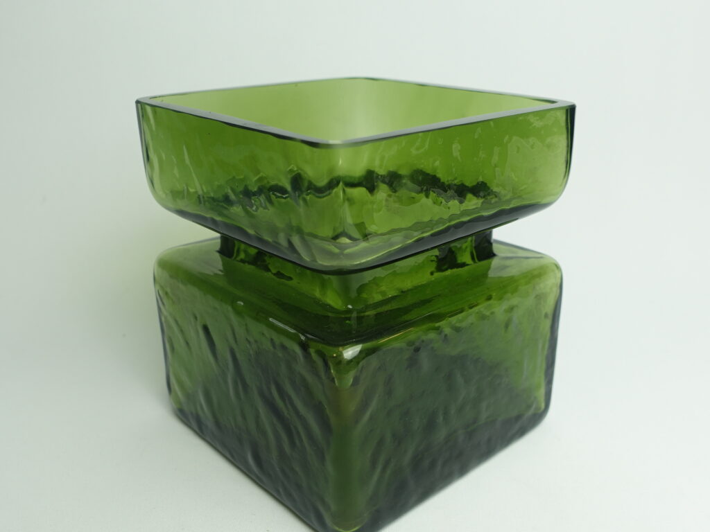Green Pala vase designed by Helena Tynell for Riihimäki glass. The vase is marked 1393. The vase was produced between 1964 and 1974. The vase is a rare 5/6 size, with a height of 13.5 cm and a side length of 12 cm. The vase for sale is intact and otherwise in good condition.