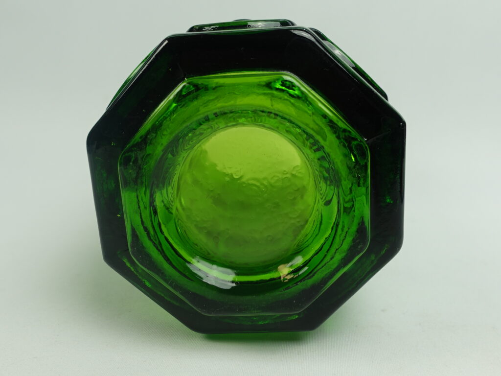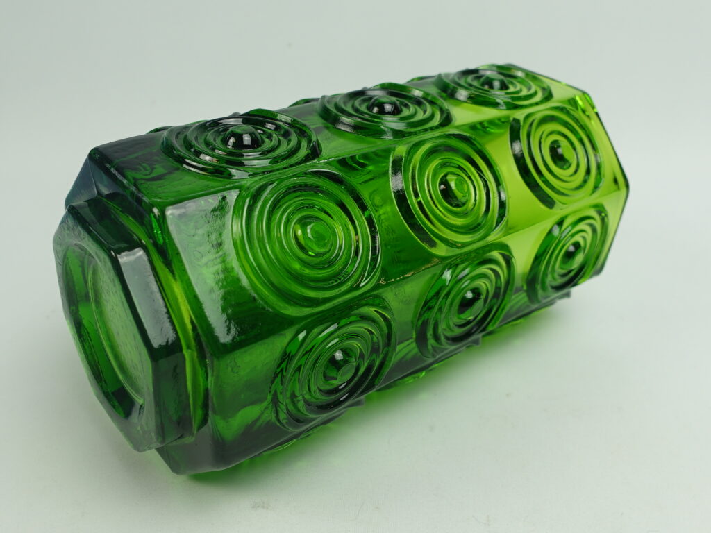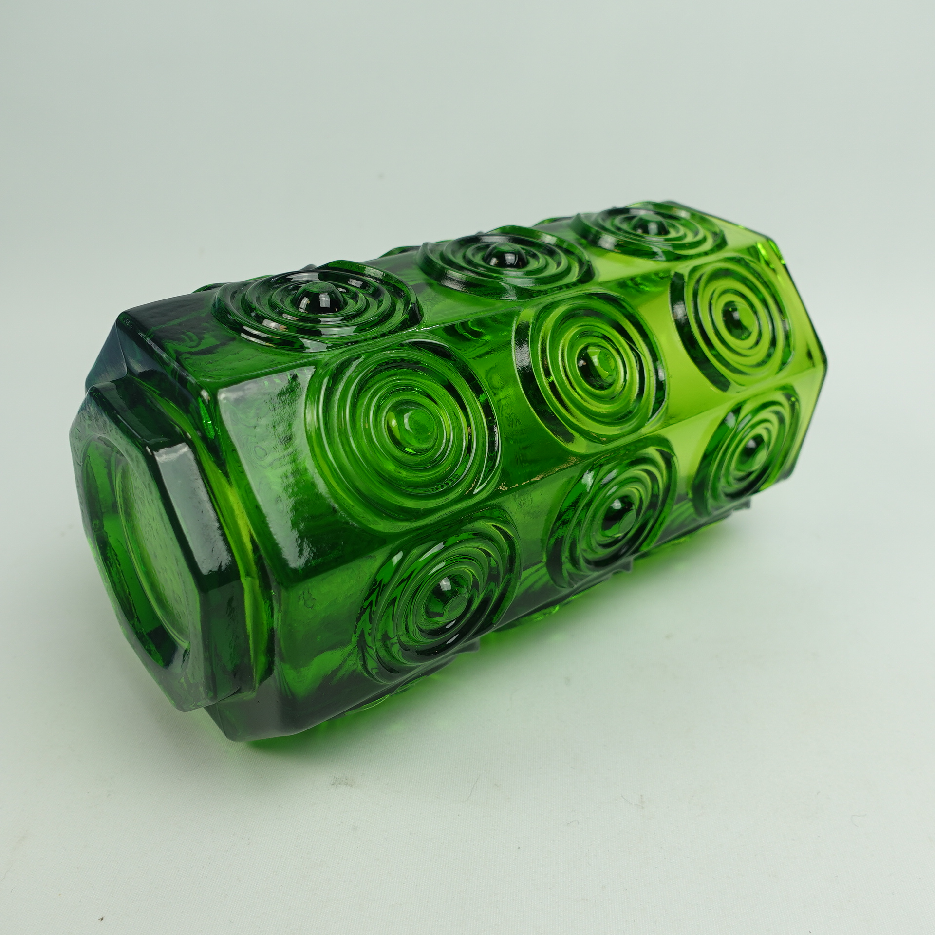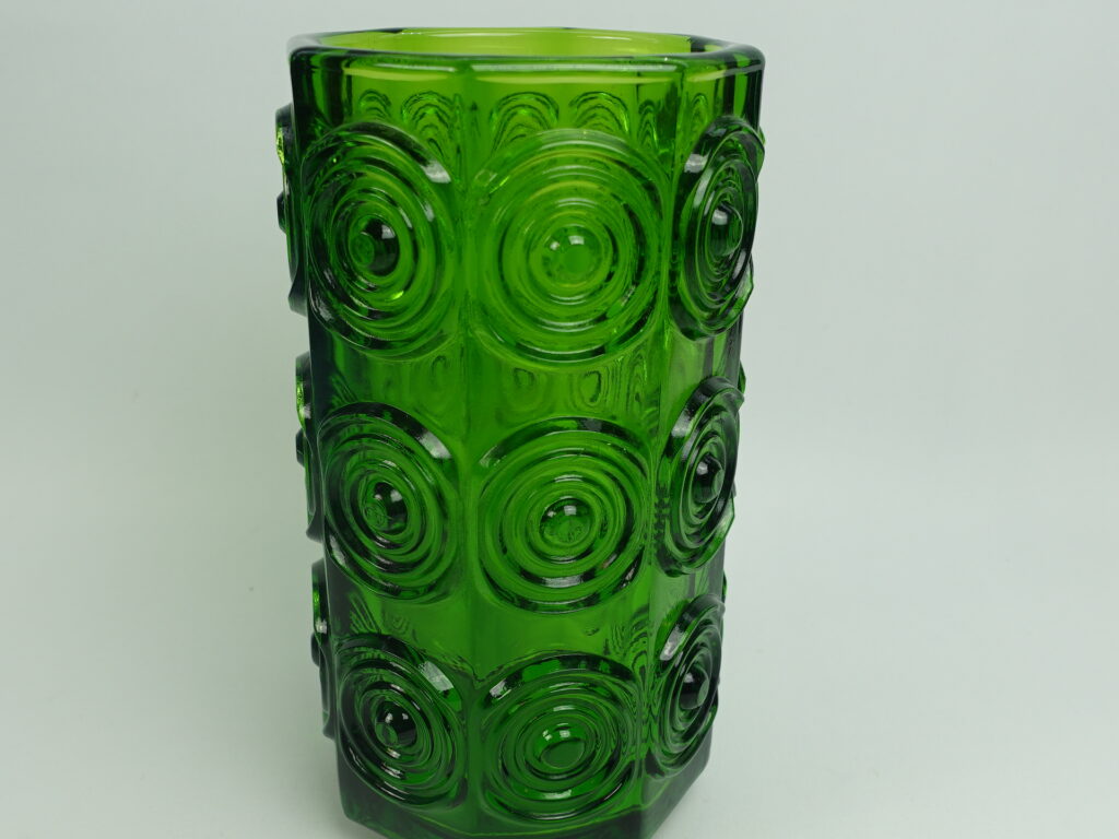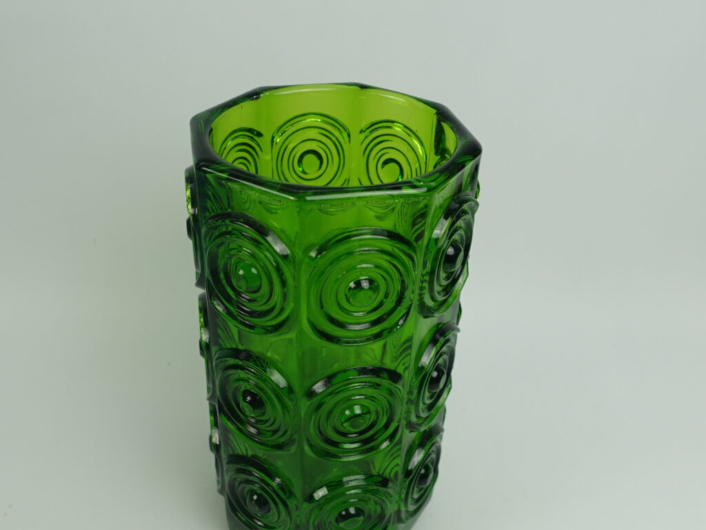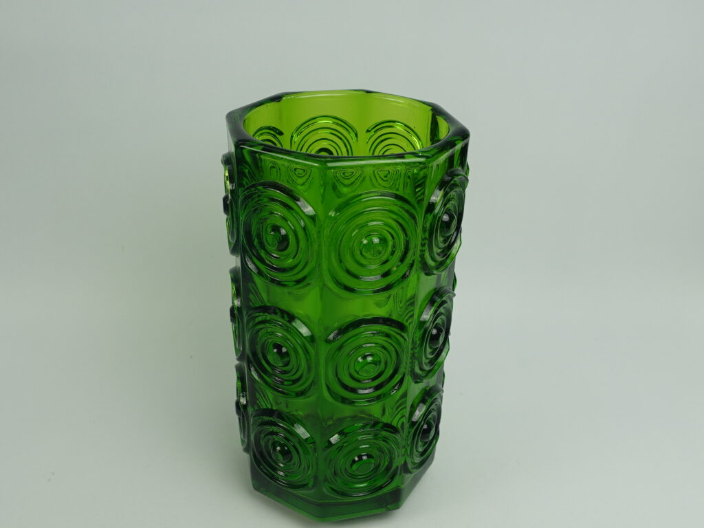 A green vase from Rengas (=the Ring) series designed by Tamara Aladin for Riihimäki Glass. The series was produced in 1972-75. The height of the vase is 20 cm and the diameter is 10 cm. The vase for sale is intact and otherwise in good condition.
