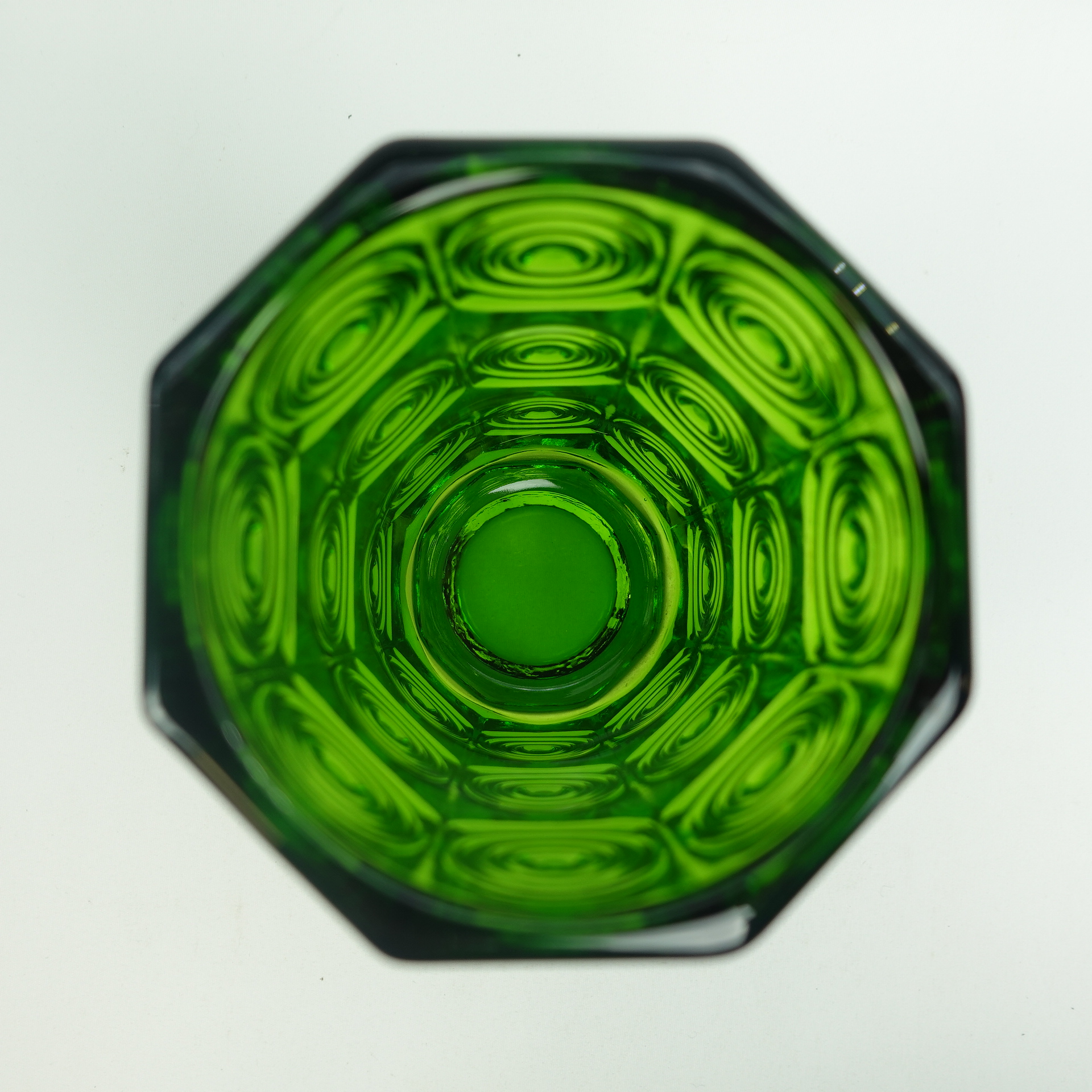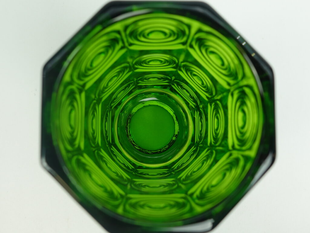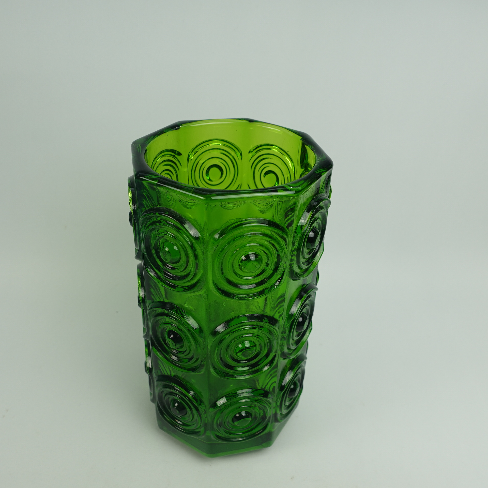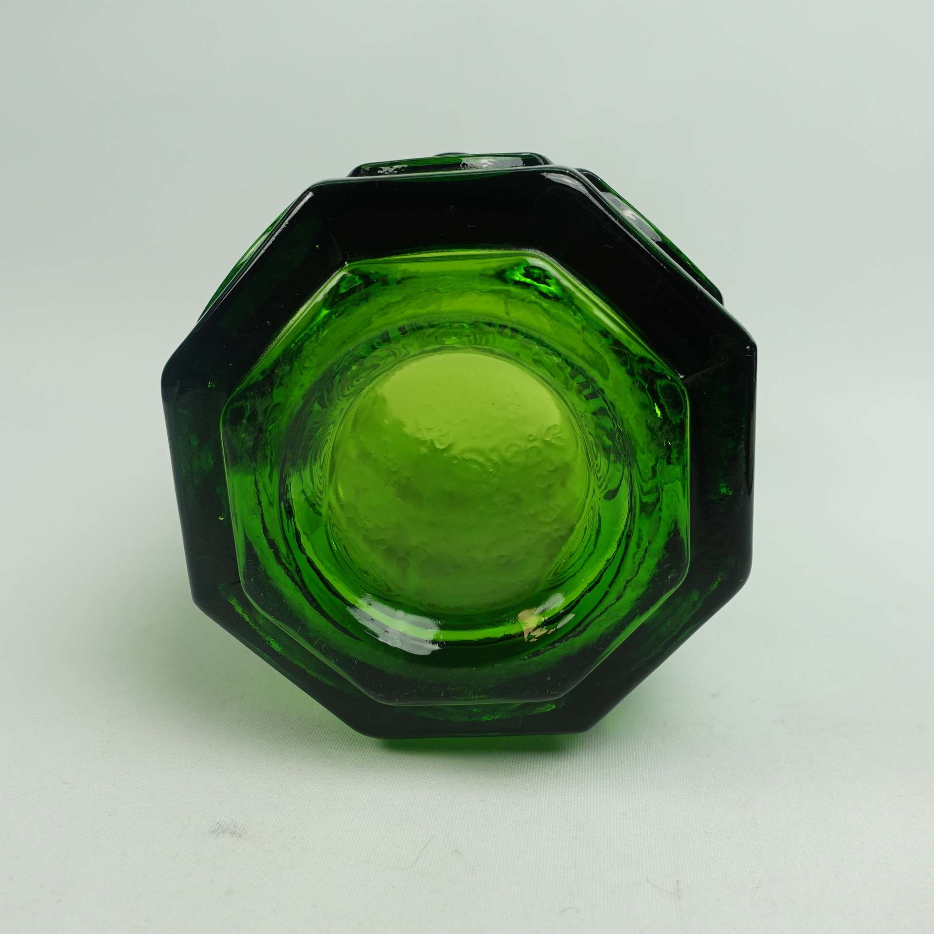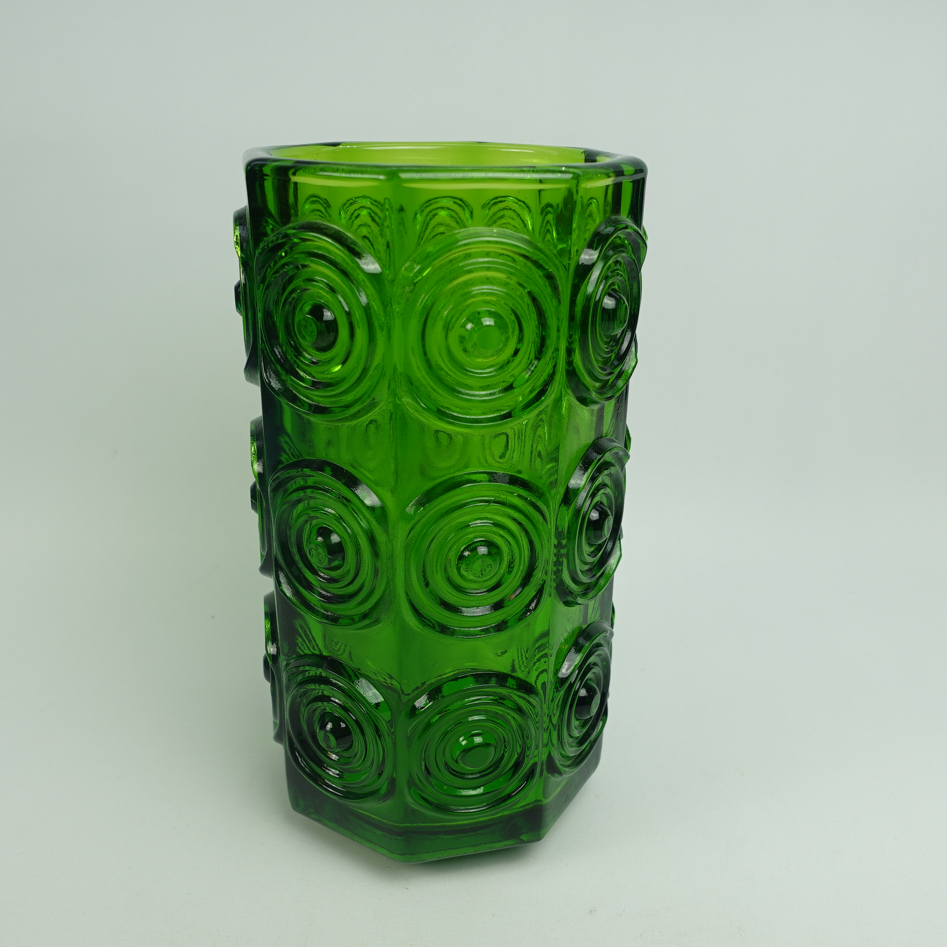 A green vase from Rengas (=the Ring) series designed by Tamara Aladin for Riihimäki Glass. The series was produced in 1972-75. The height of the vase is 20 cm and the diameter is 10 cm. The vase for sale is intact and otherwise in good condition.