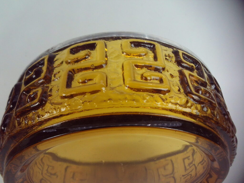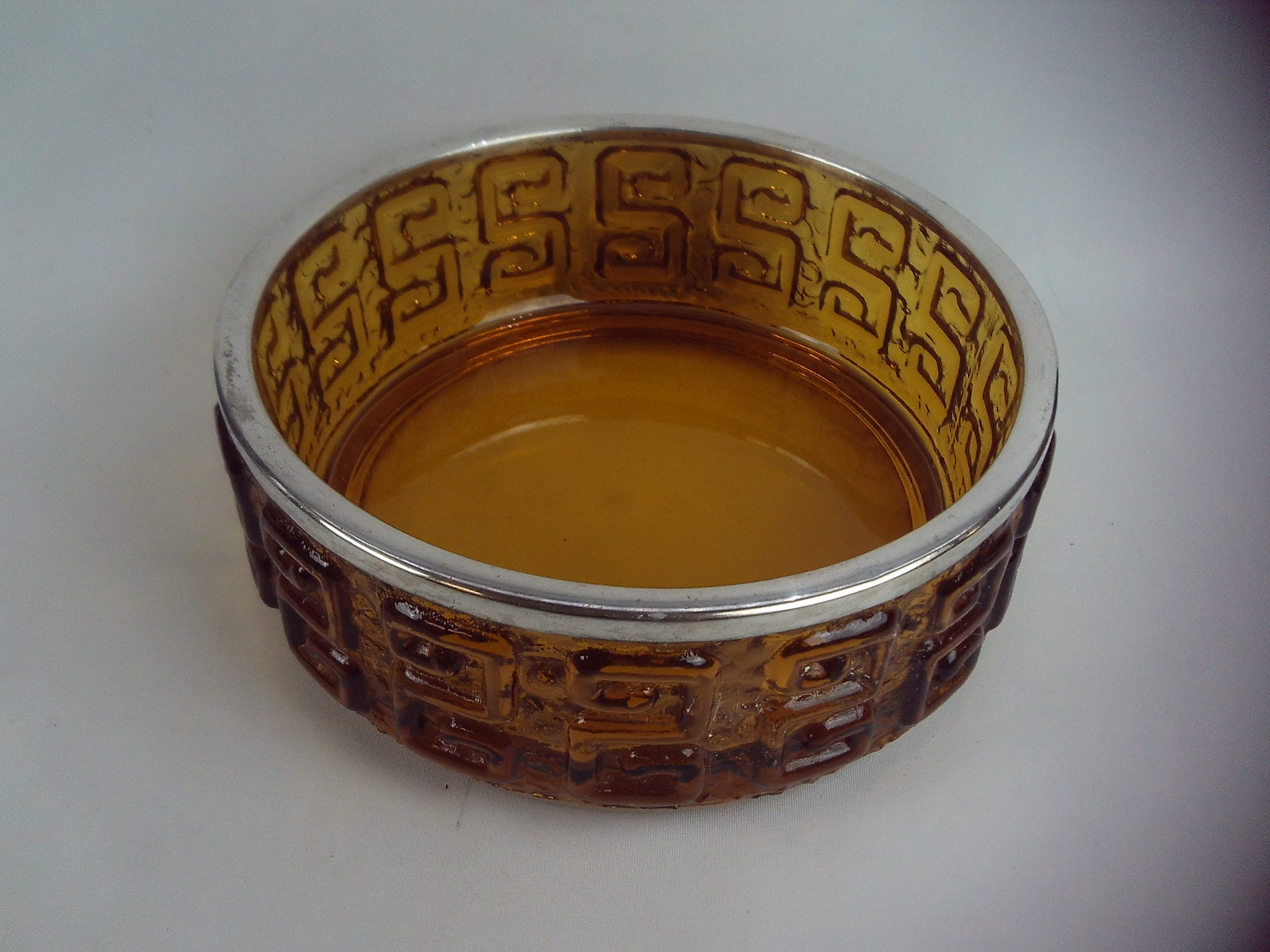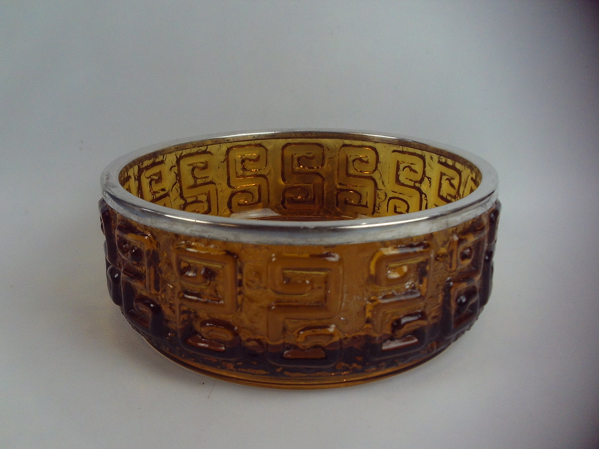 Amber colored serving bowl from the Taalari series designed by Tamara Aladin for Riihimäki Glass with an alpaca rim. The diameter of the bowl is 20 cm and the height is 7.5 cm. The bowl was produced in 1968-75. The bowl for sale is intact and otherwise in good condition.