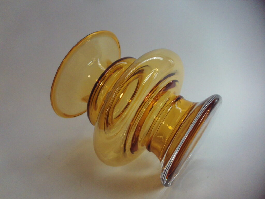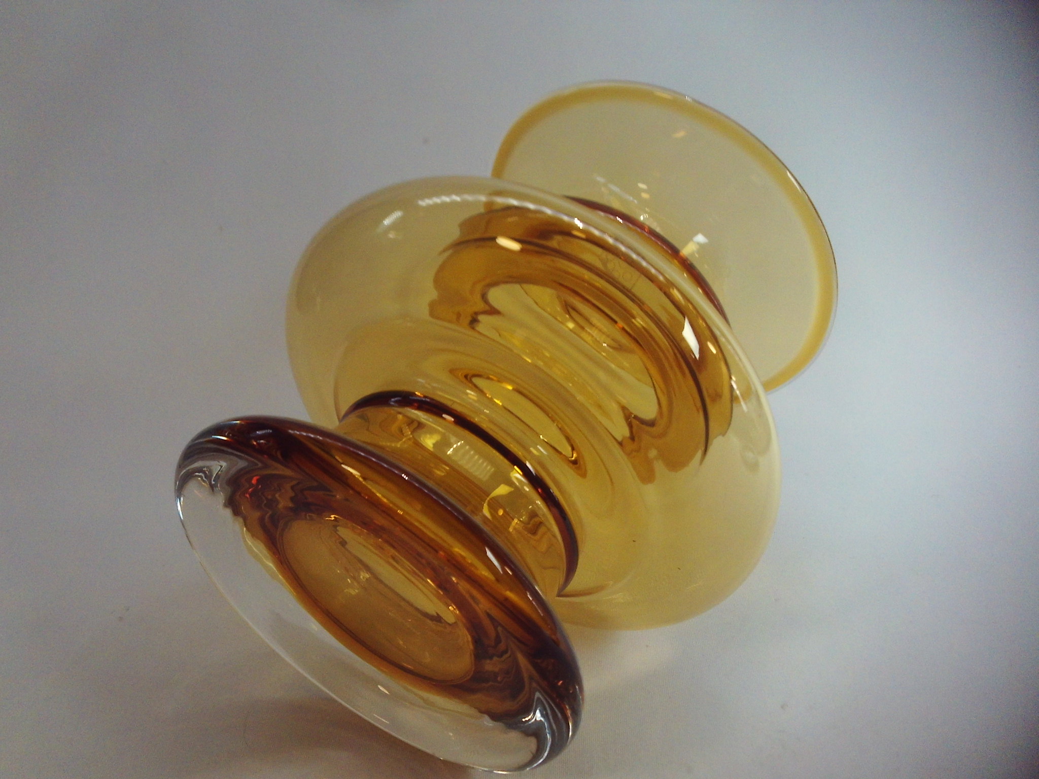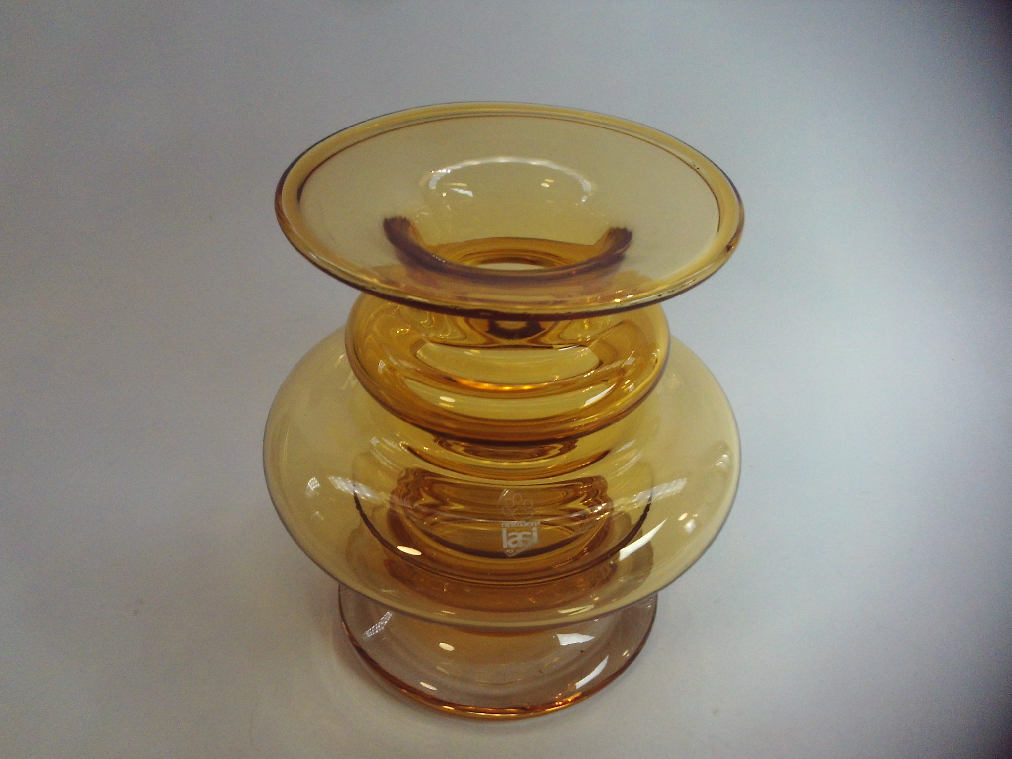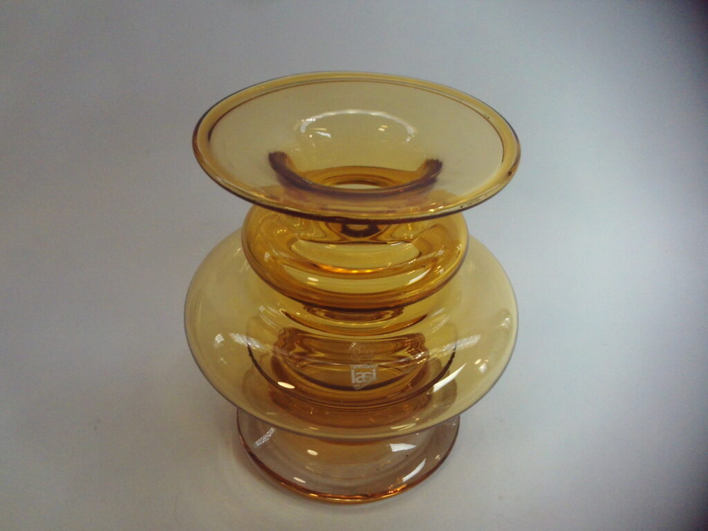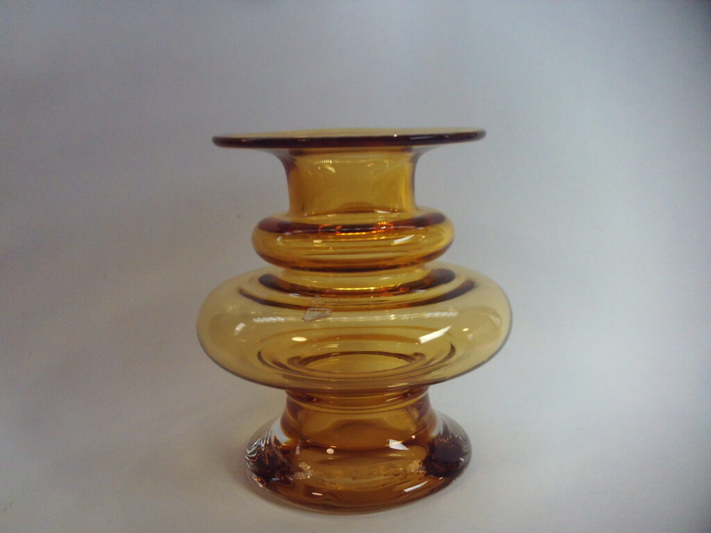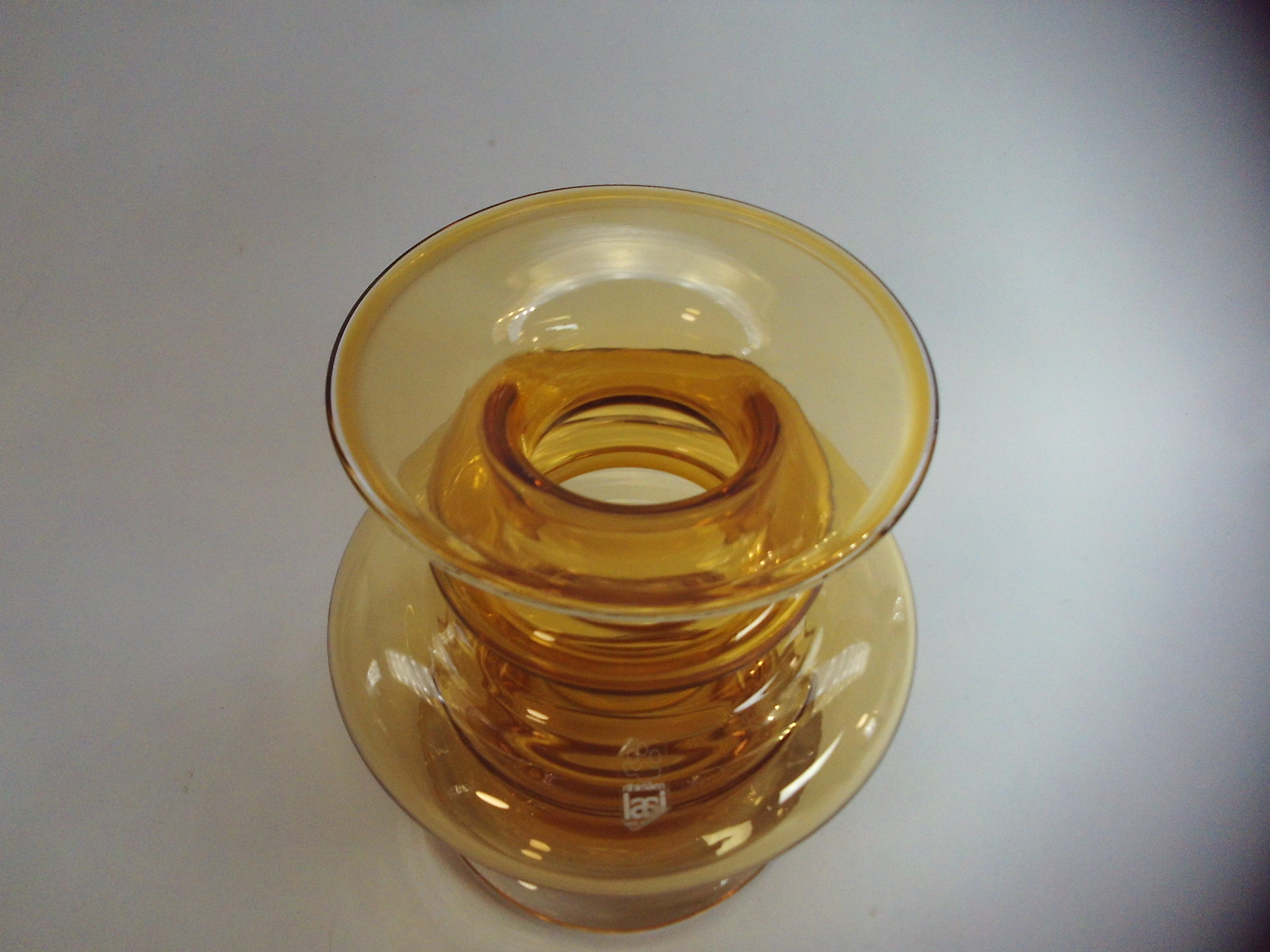 Amber-colored Tornado 1339 vase designed by Tamara Aladin for Riihimäki Glass. The series includes vases of various sizes and shapes, which were produced in addition to amber, also in blue, green and clear. The series was in production from 1970 to 1976. The height of the vase for sale is 16.5 cm and the diameter of the mouth of the vase is 12.5 cm. The vase is intact and otherwise in very good condition.