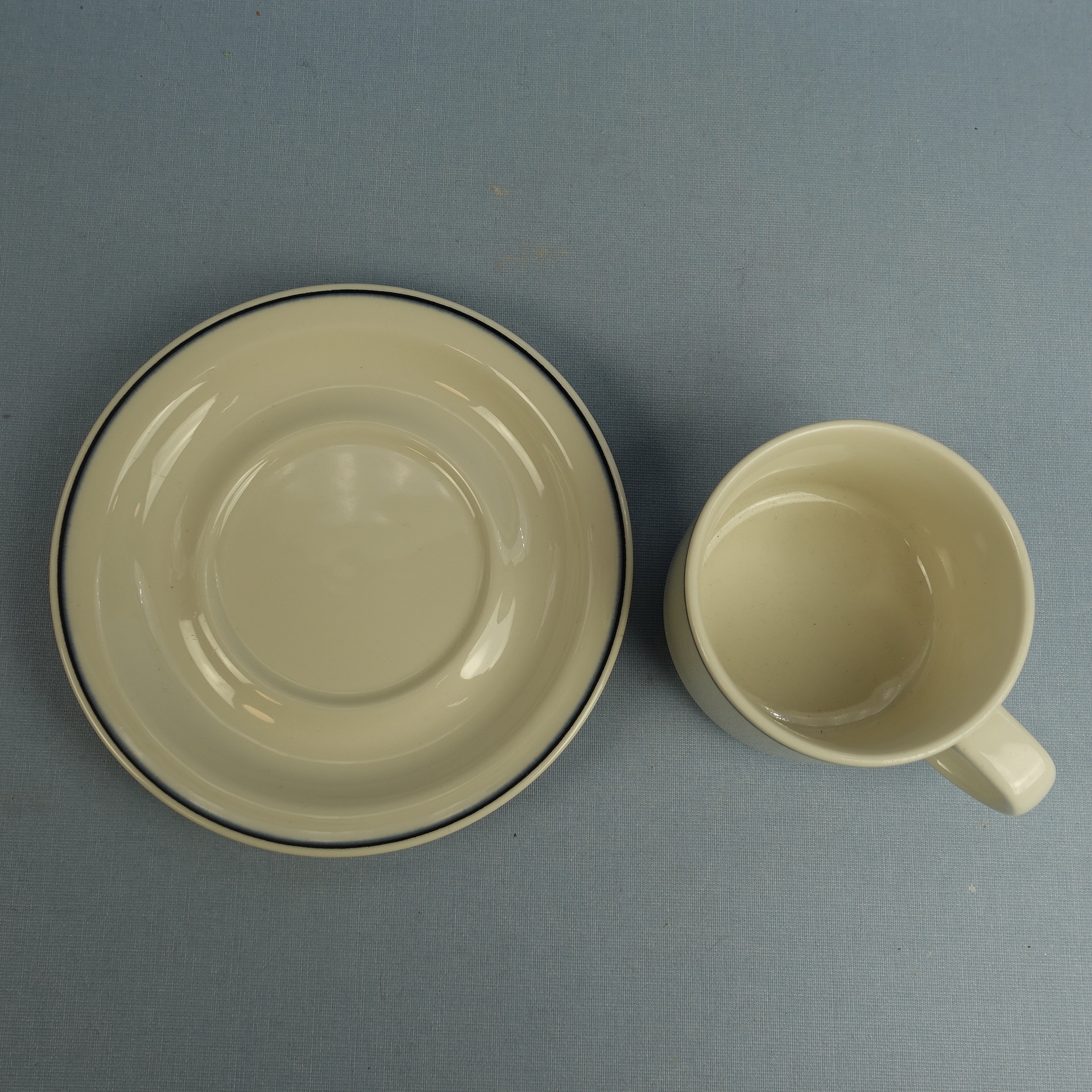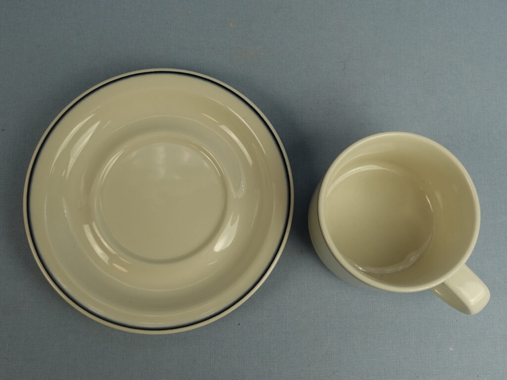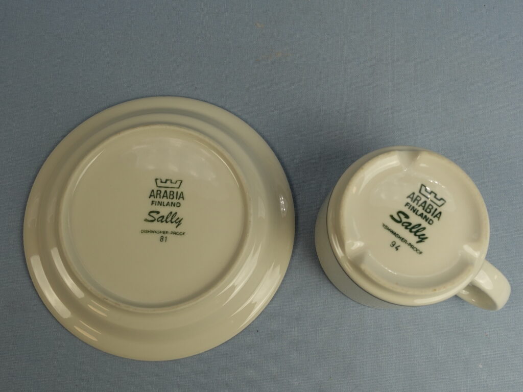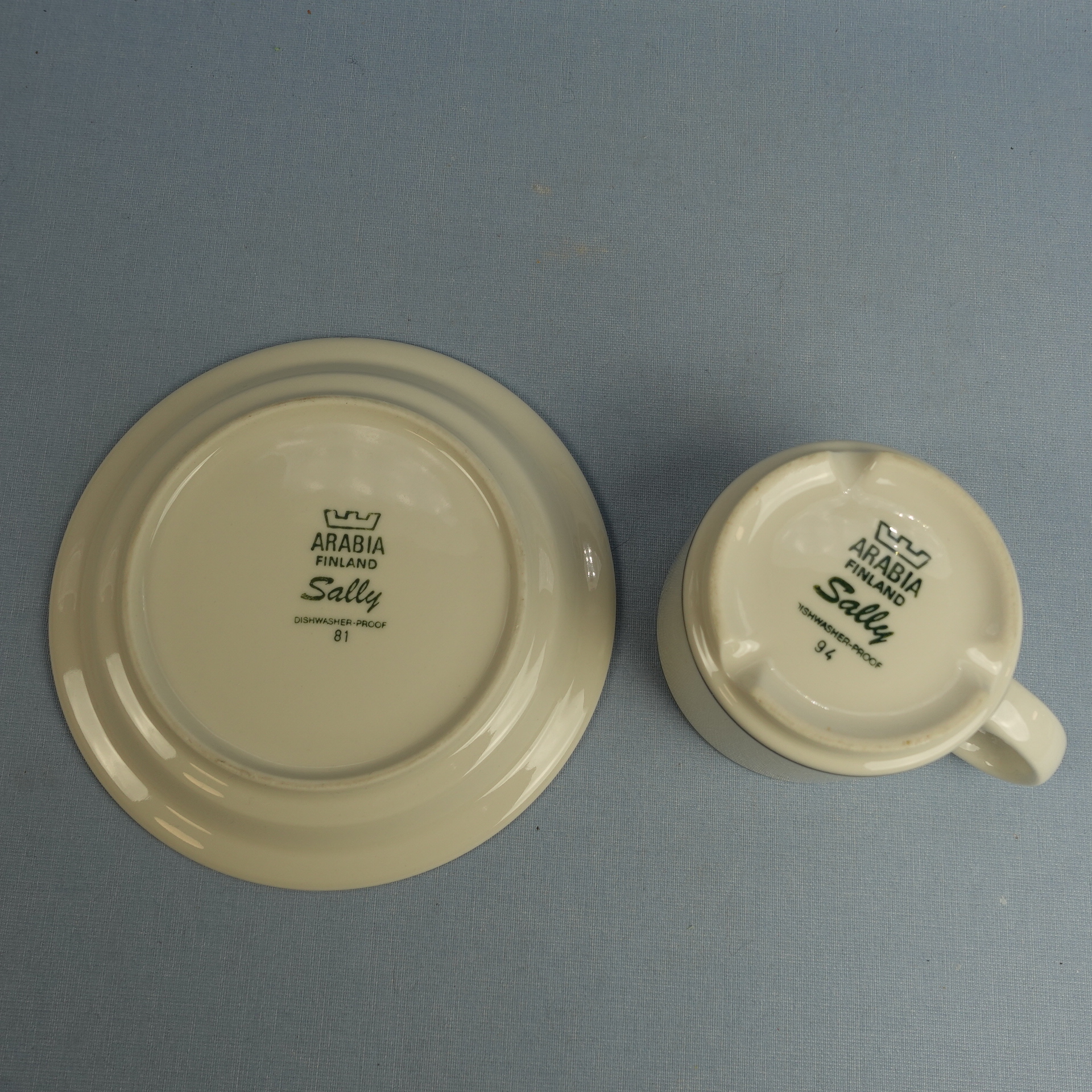 Sally coffee cup made by Arabia, which was a custom order for the Viking Line ship Sally. The cup is 5 cm high, 7.5 cm in diameter and has a capacity of 15 cl. The saucer has a diameter of 14.1 cm. The coffee cup for sale is intact and in good condition.