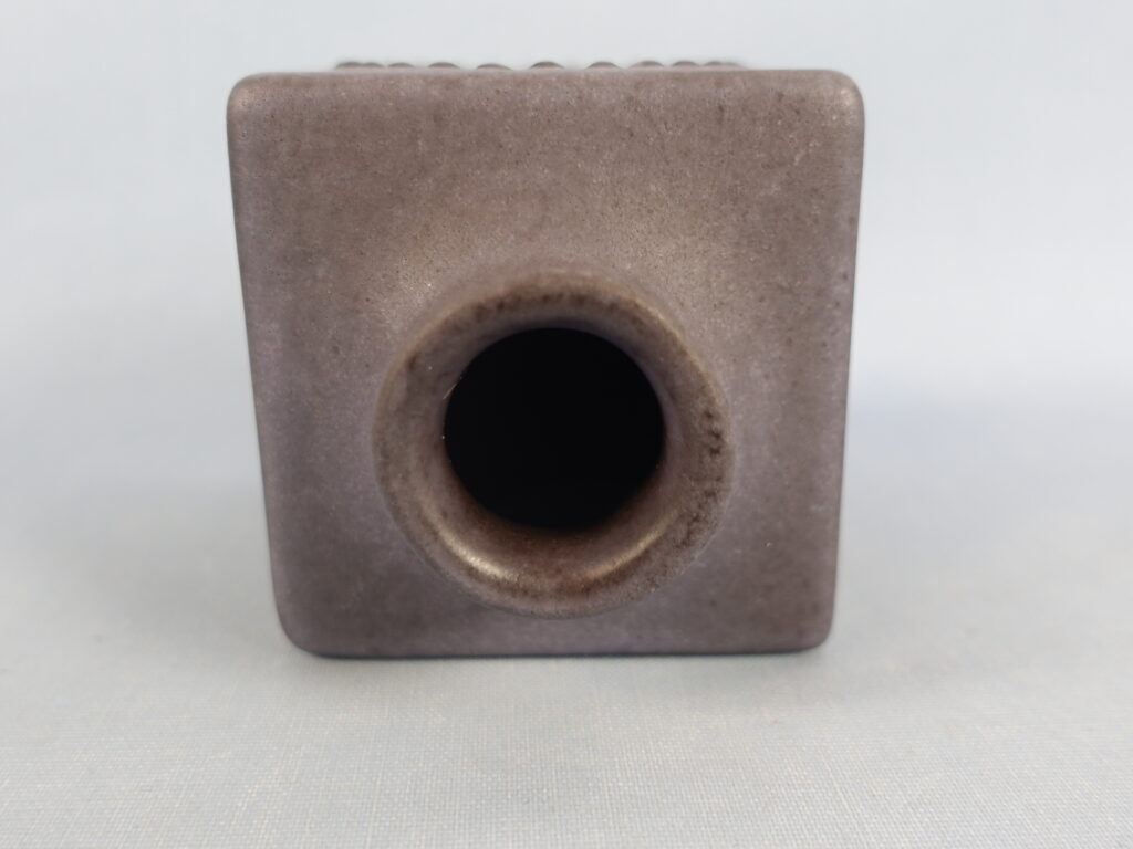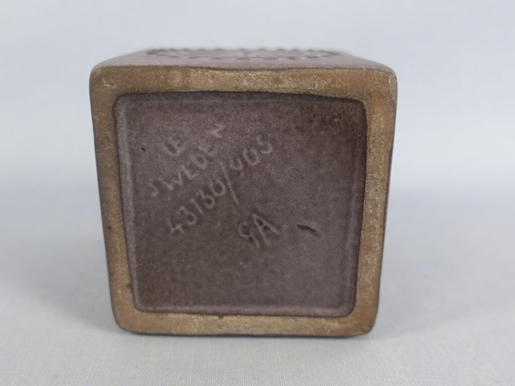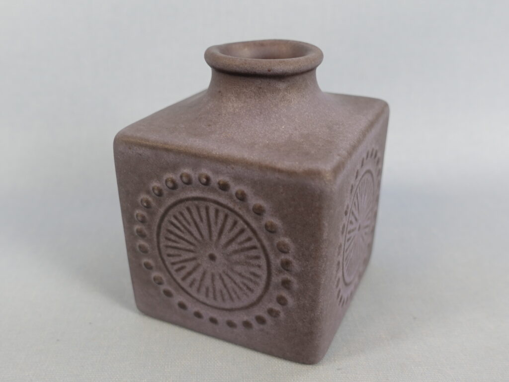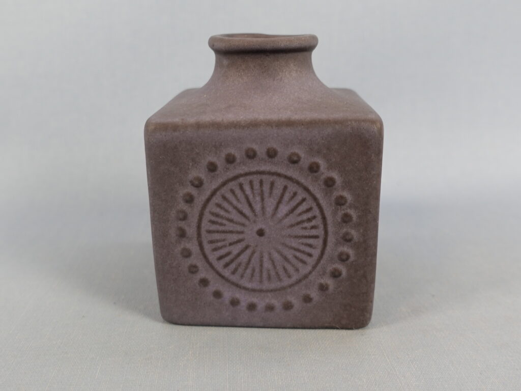 A small cube-shaped vase designed by Göran Andersson for Uppsala-Ekeby. The vase is from the 1960s. The width of the vase is 7 cm and the height is 9 cm. The beautiful lilac-colored vase for sale is intact and otherwise in good condition.