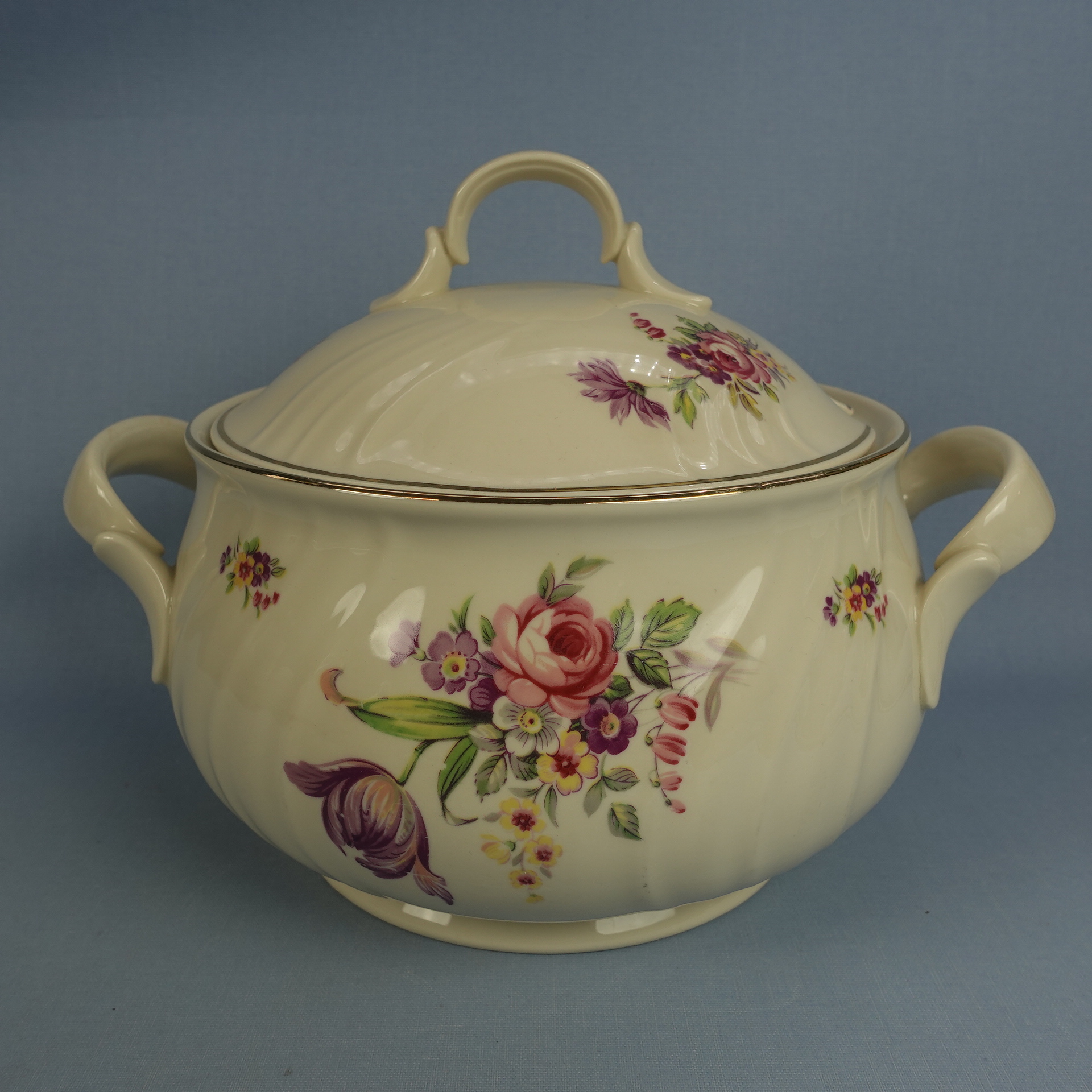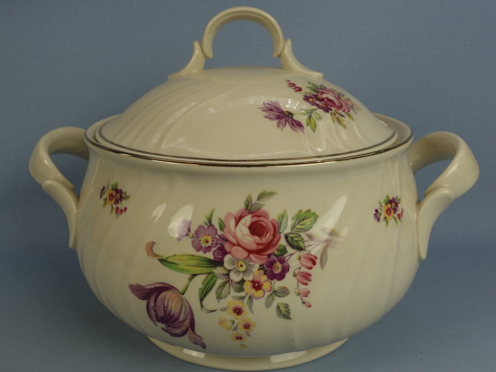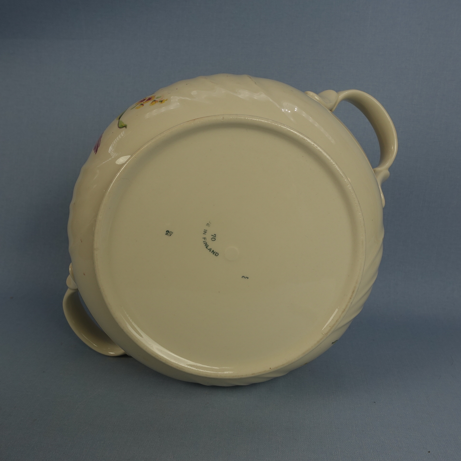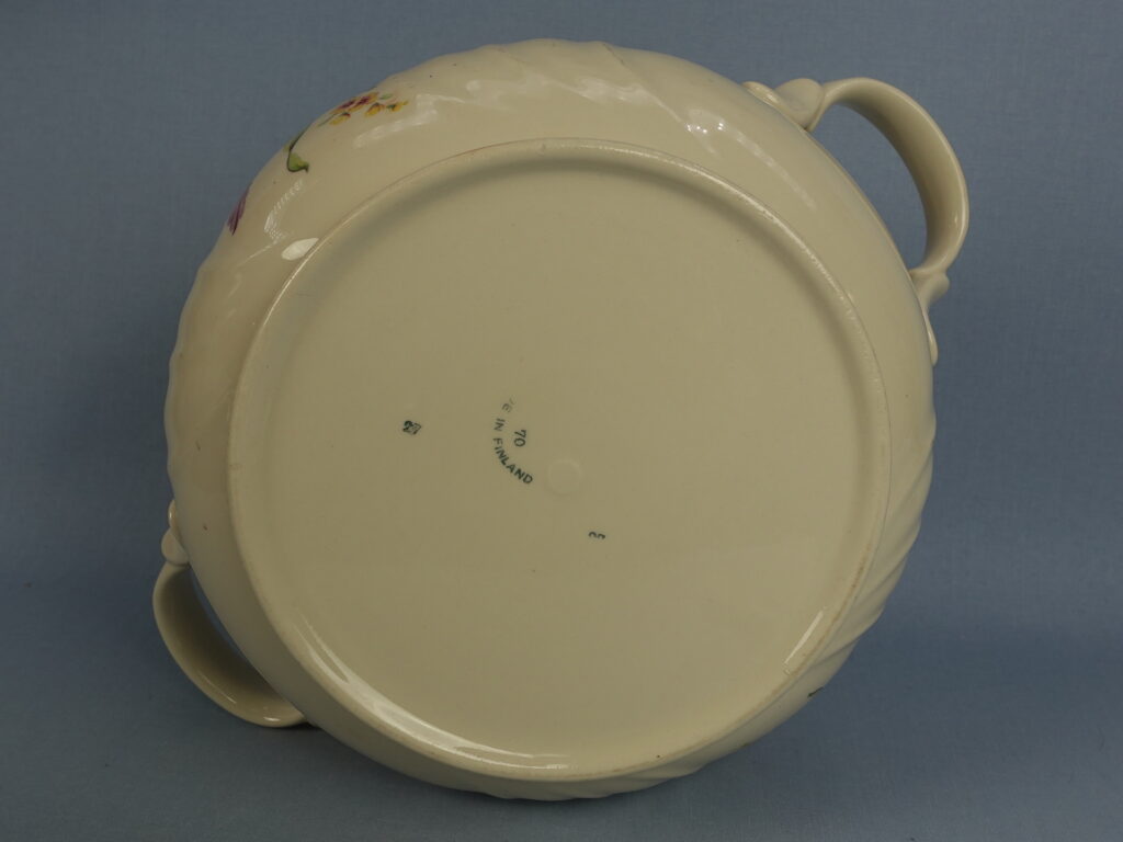 Arabia’s Inga-Liisa series of bowls with lids in various sizes. The transfer decoration is also known as number 4455. The decoration has only been used on second-class dishes, which have been beautifully decorated to make them “saleable”. The larger bowl is 12.6 cm high without the lid, 19 cm in diameter and has a capacity of approx. 2.8 litres. The bowl lid has a “bucket hole”. The smaller bowl is 9.8 cm high without the lid, 17.5 cm in diameter and has a capacity of approx. 1.8 litres. The gilding on the edge of the bowl has minor wear. The bowls for sale are intact and otherwise in good condition.