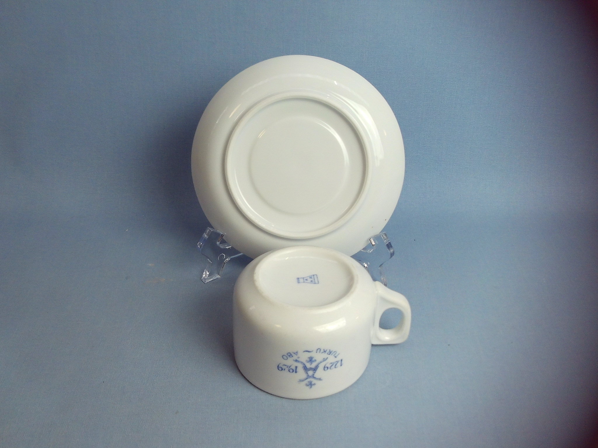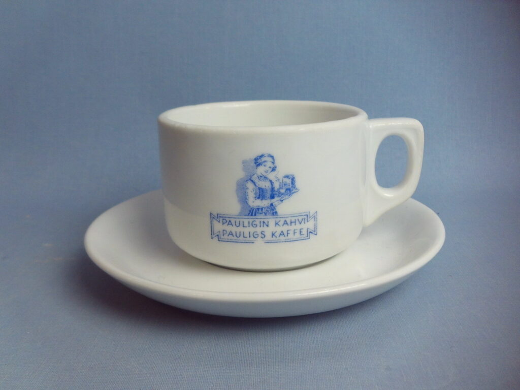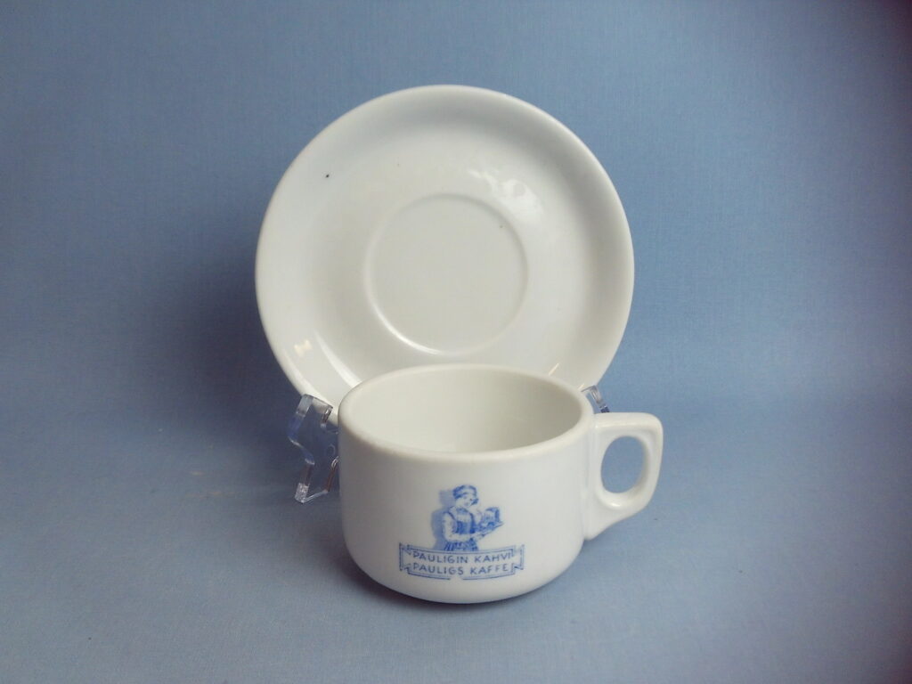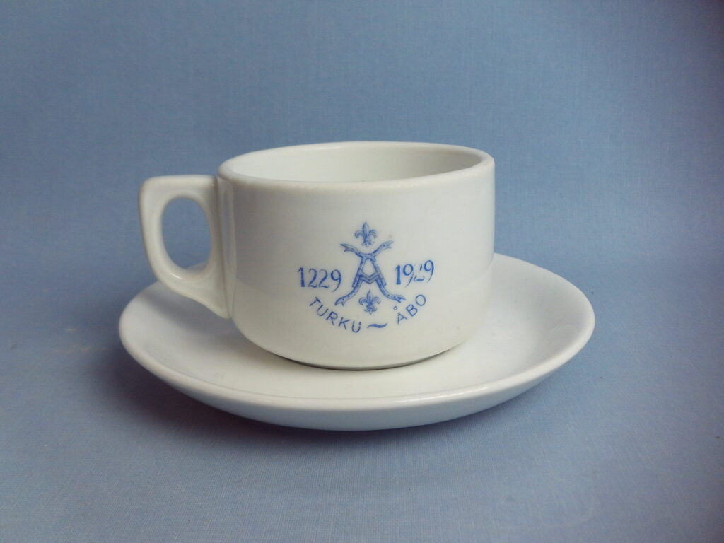 Coffee cup Turku Åbo 1229-1929 made by Arabia in honor of the 700th anniversary of the city. On one side of the cup is an advertisement for Paulig coffee. The cup has the AAA tower stamp and is an XX model. The height of the cup is 5.4 cm, diameter 8 cm and volume 17 cl. The diameter of the saucer is 14.5 cm. The cup for sale is intact and otherwise in good condition for its age.