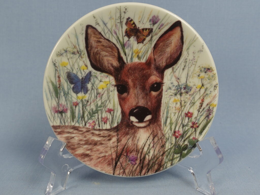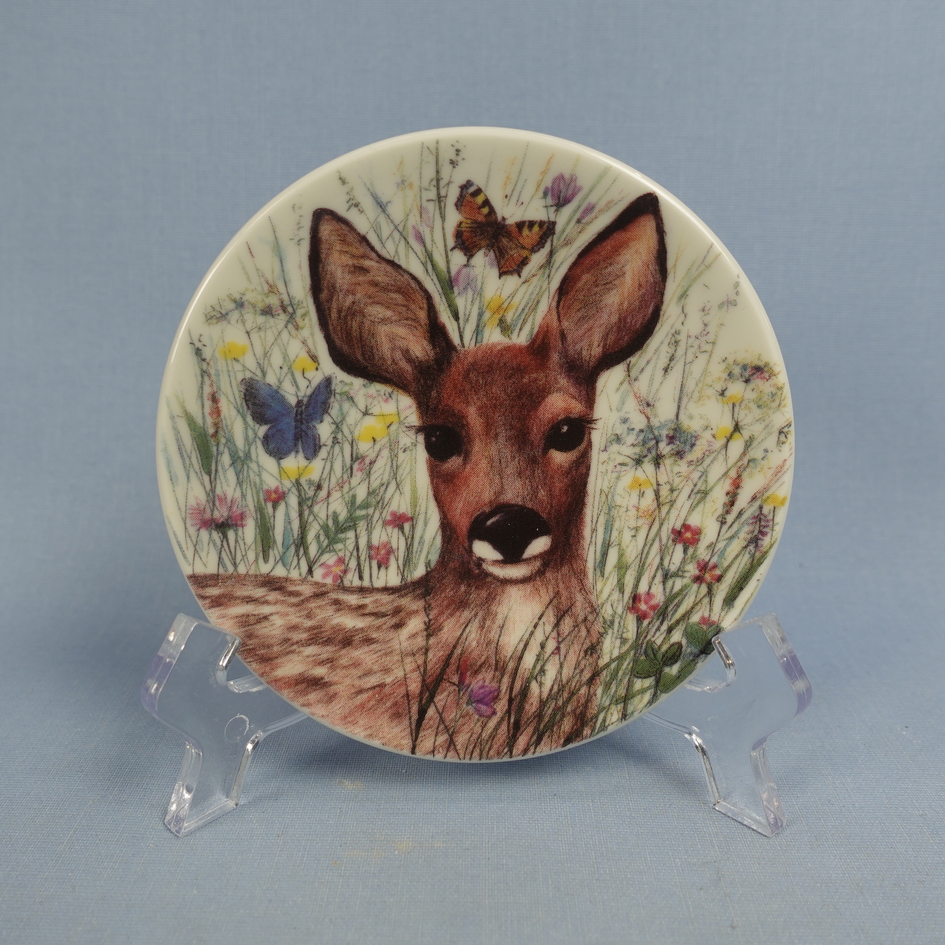 Deer wall plate from the Fauna-series designed for Arabia by Tuula Lappalainen. The four-piece series was designed in 1994 and, in addition to the Deer, includes Fox, Rabbit and Ringed Seal. Plates were produced in two different sizes. The diameter of the plate for sale is 12 cm. The plate is intact and otherwise in good condition.