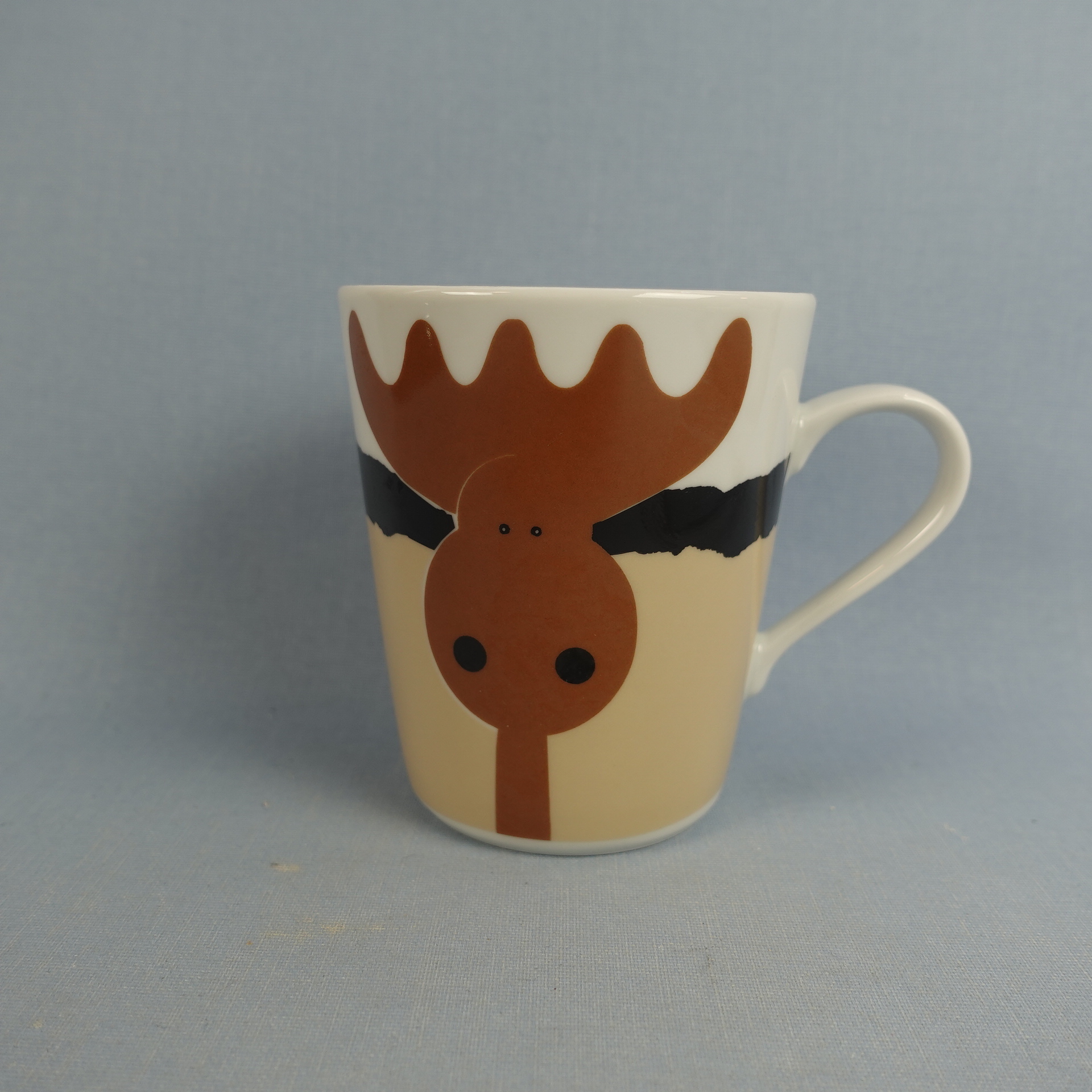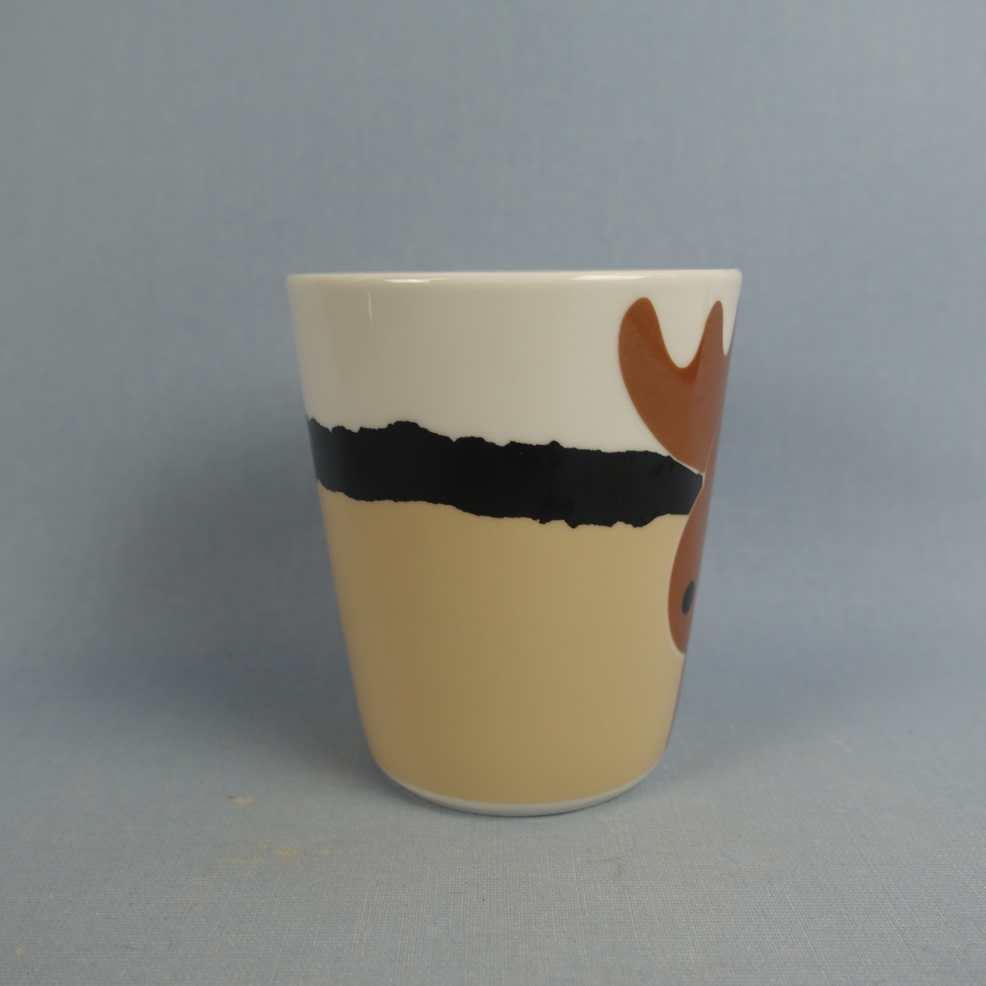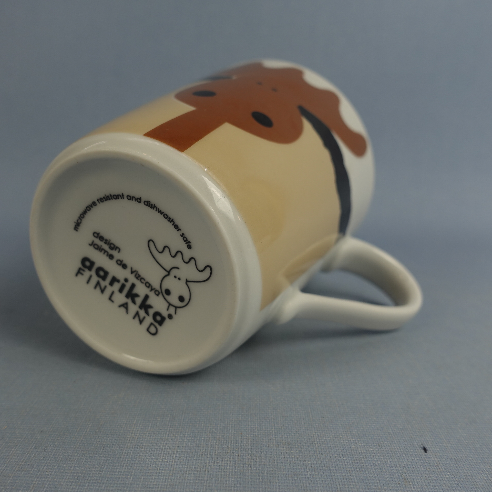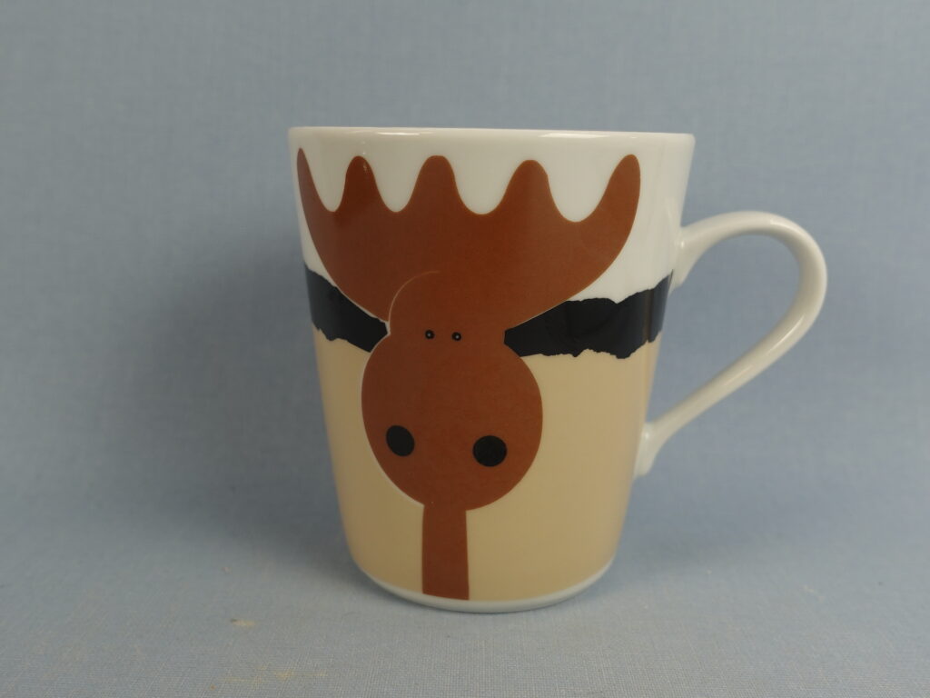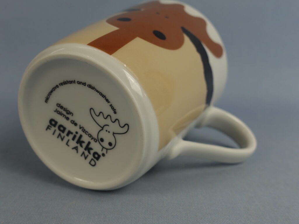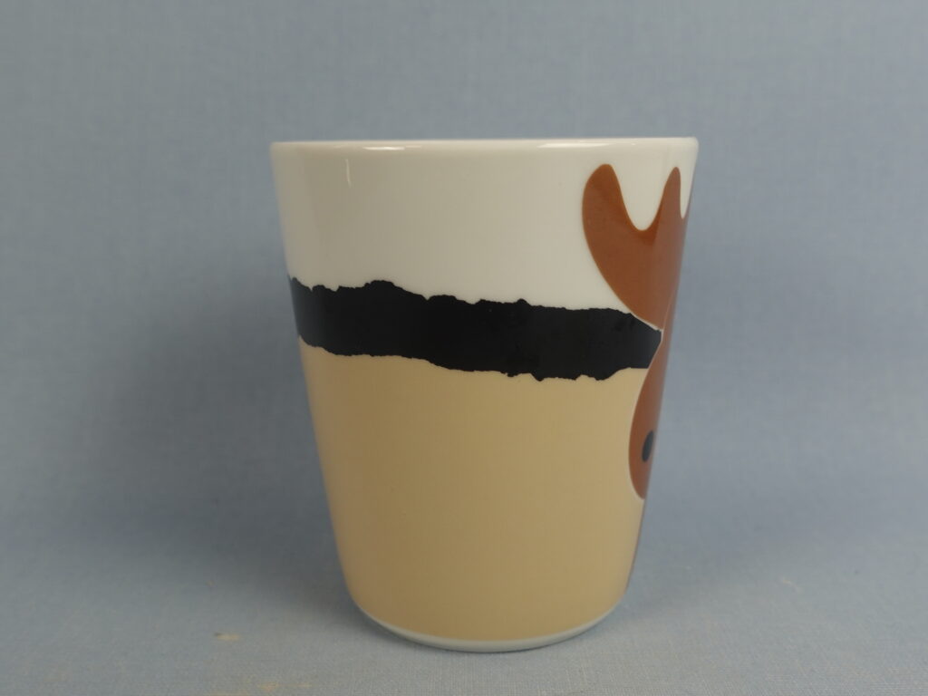 Aarikan valmistama Hirvonen muki ruskealla hirven kuvalla. Mukin korkeus on 9,5 cm, halkaisija 8,2 cm ja tilavuus 26 cl. Myynnissä oleva muki on ehjä ja muutenkin hyväkuntoinen.
