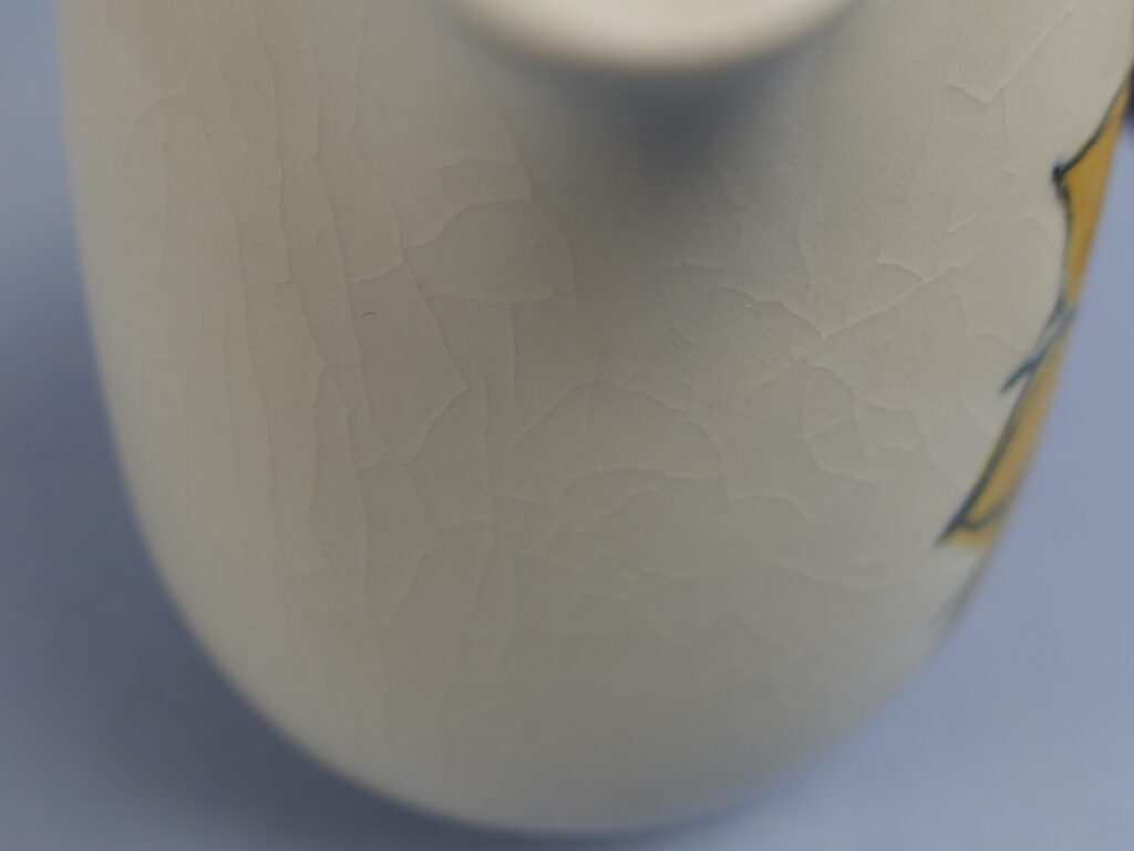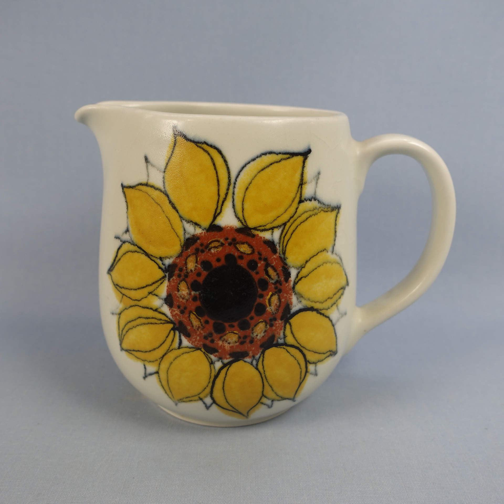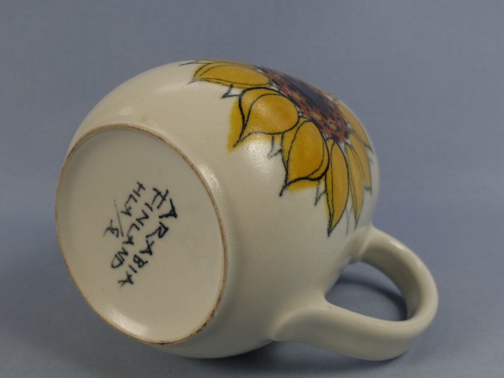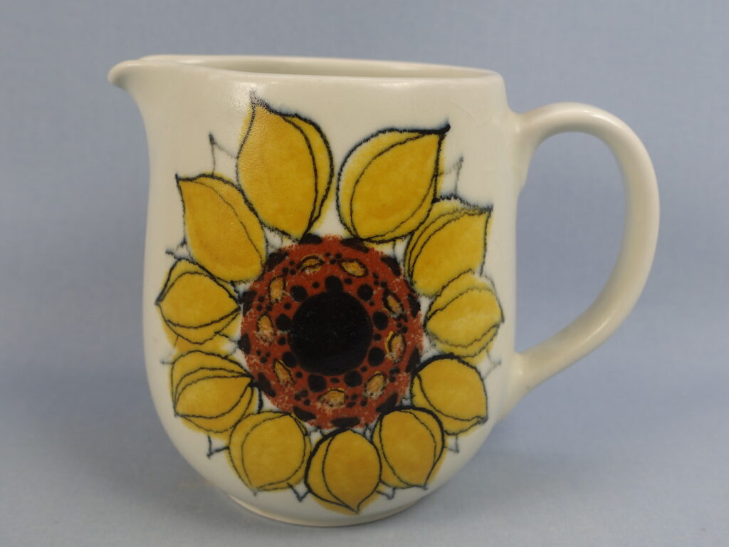 Hilkka-Liisa Aholan Arabiale suunnitteleman Aurinkoruusu-sarjan kaadin. Käsinmaalattu koriste oli tuotannossa v. 1960-75. Kaatimen korkeus on 14,5 cm ja tilavuus 1,3 litraa. Myynnissä oleva kaadin on ehjä. Siitä ei puutu paloja, eikä siinä ole säröjä, mutta lasite on krakeloitunut sekä ulko- että sisäpuolelta.