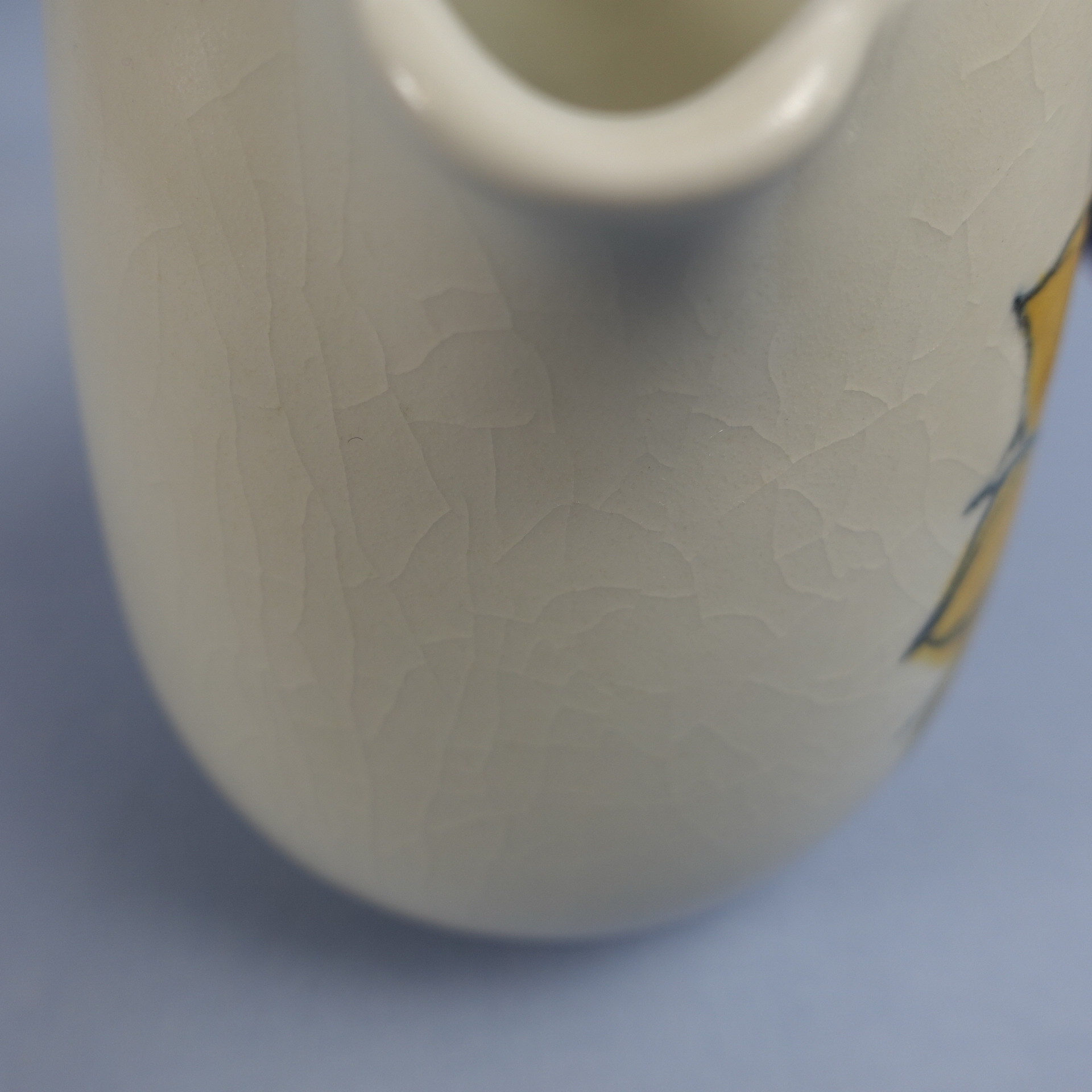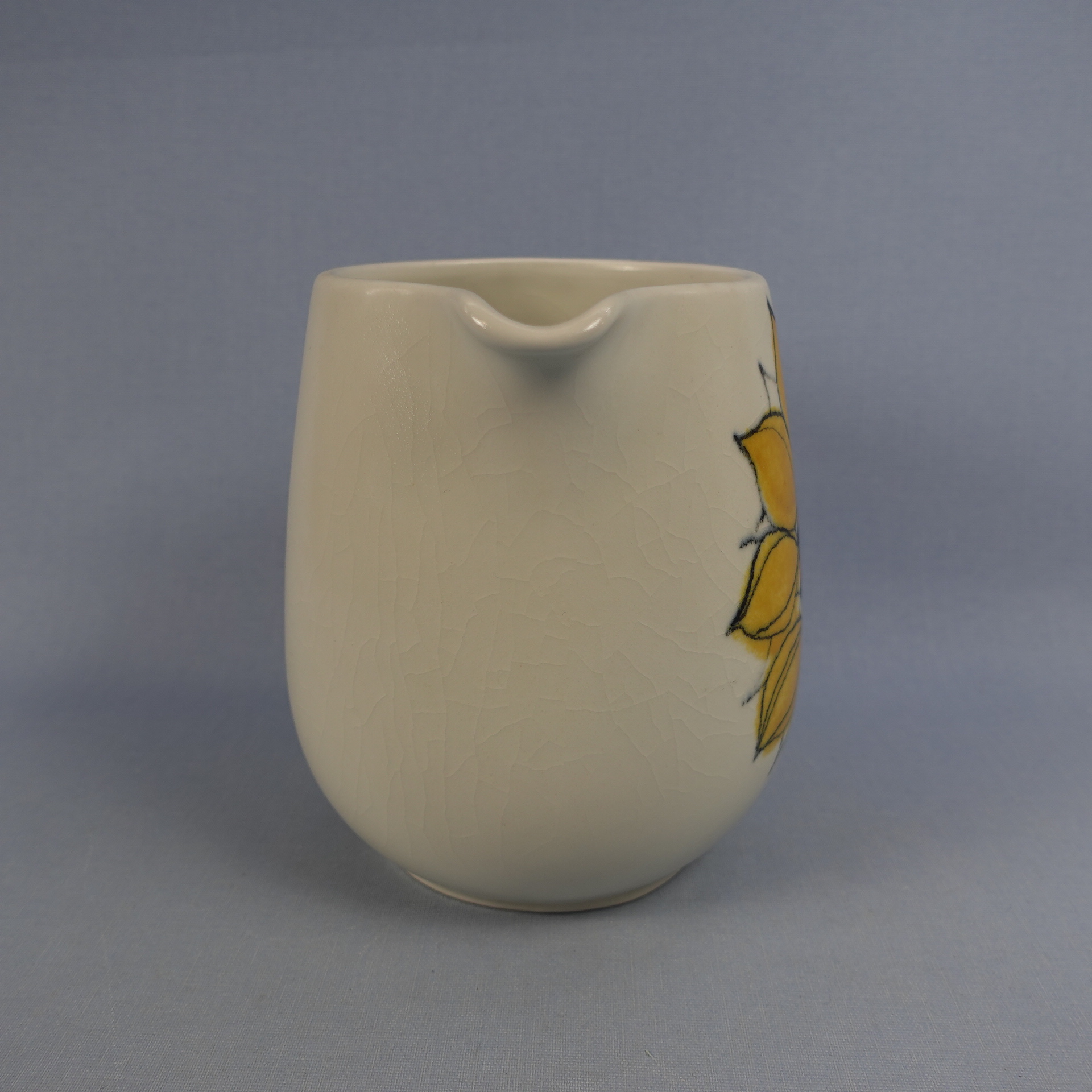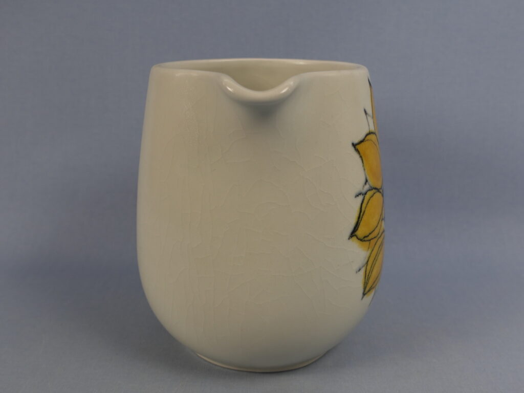 Hilkka-Liisa Aholan Arabiale suunnitteleman Aurinkoruusu-sarjan kaadin. Käsinmaalattu koriste oli tuotannossa v. 1960-75. Kaatimen korkeus on 14,5 cm ja tilavuus 1,3 litraa. Myynnissä oleva kaadin on ehjä. Siitä ei puutu paloja, eikä siinä ole säröjä, mutta lasite on krakeloitunut sekä ulko- että sisäpuolelta.