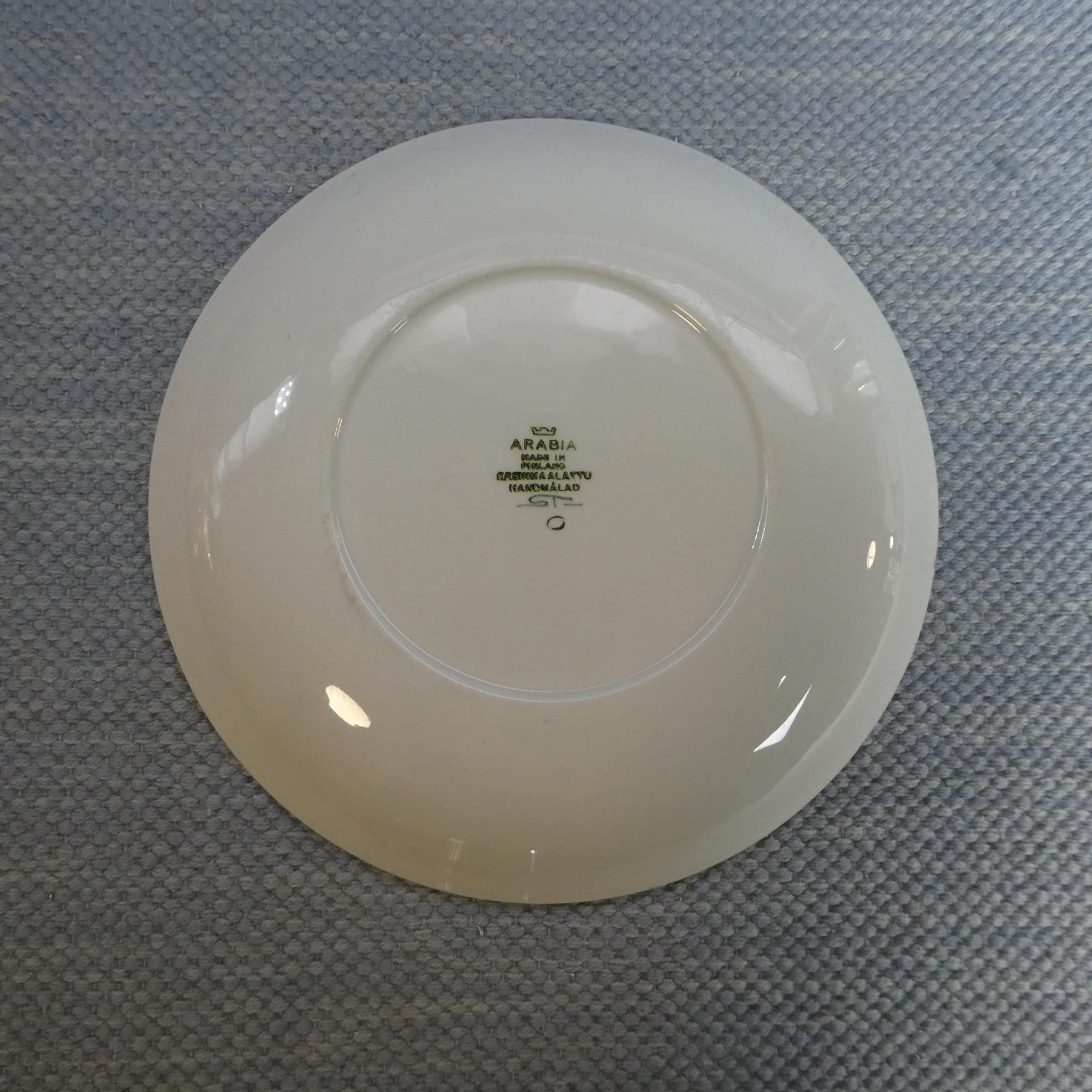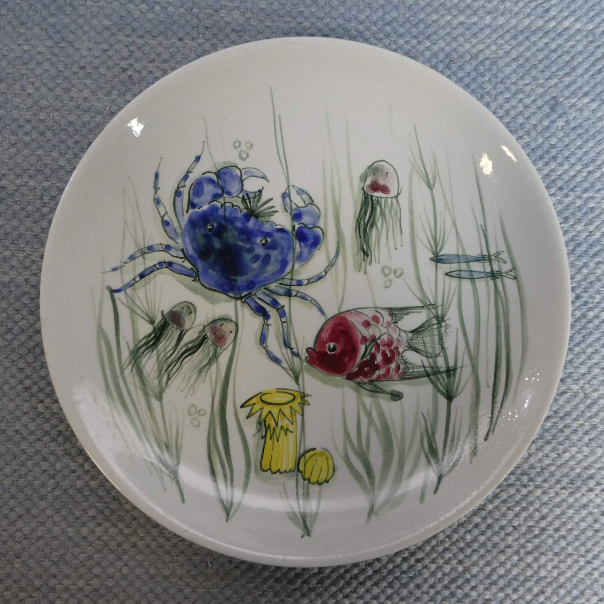 Anja Juurikkalan Arabialle suunnittelema leikkisin vedenalaisilla kuvioin koristeltu Crayfish lautanen. Käsinmaalattu koriste oli tuotannossa v. 1953-61. Myynnissä oleva lautanen on ehjä ja hyväkuntoinen, mutta vähäistä käytöstä tullutta jälkeä on nähtävissä.