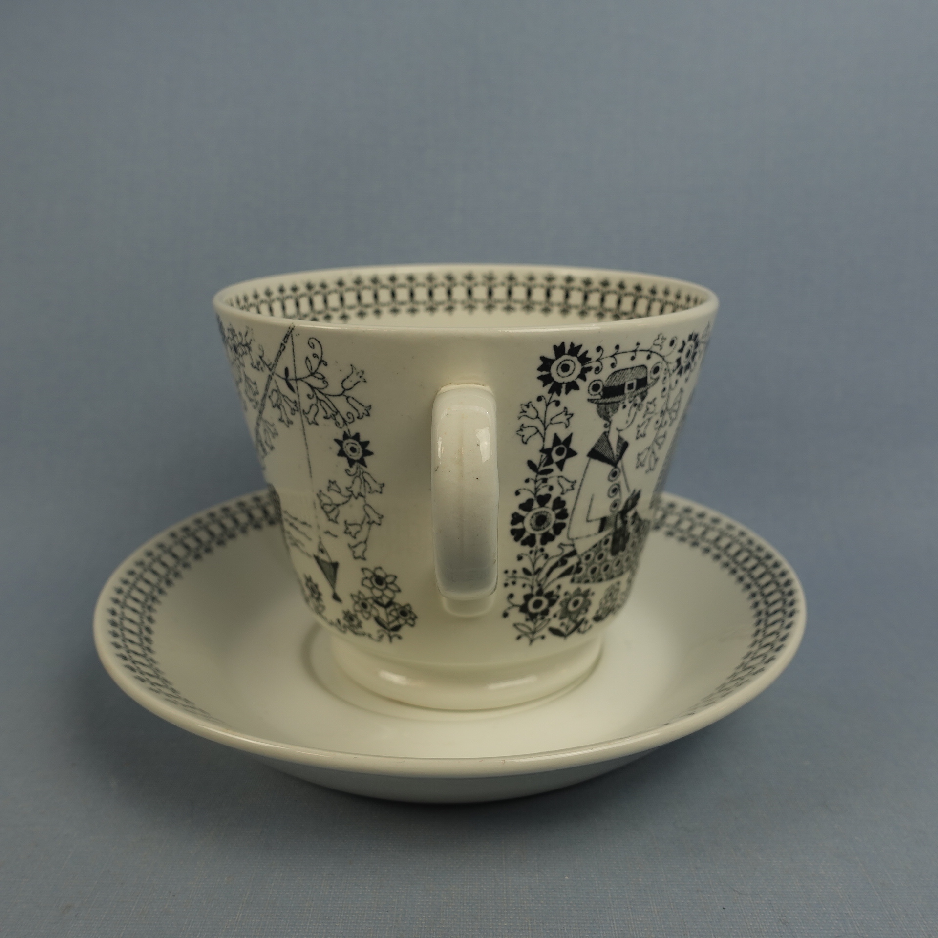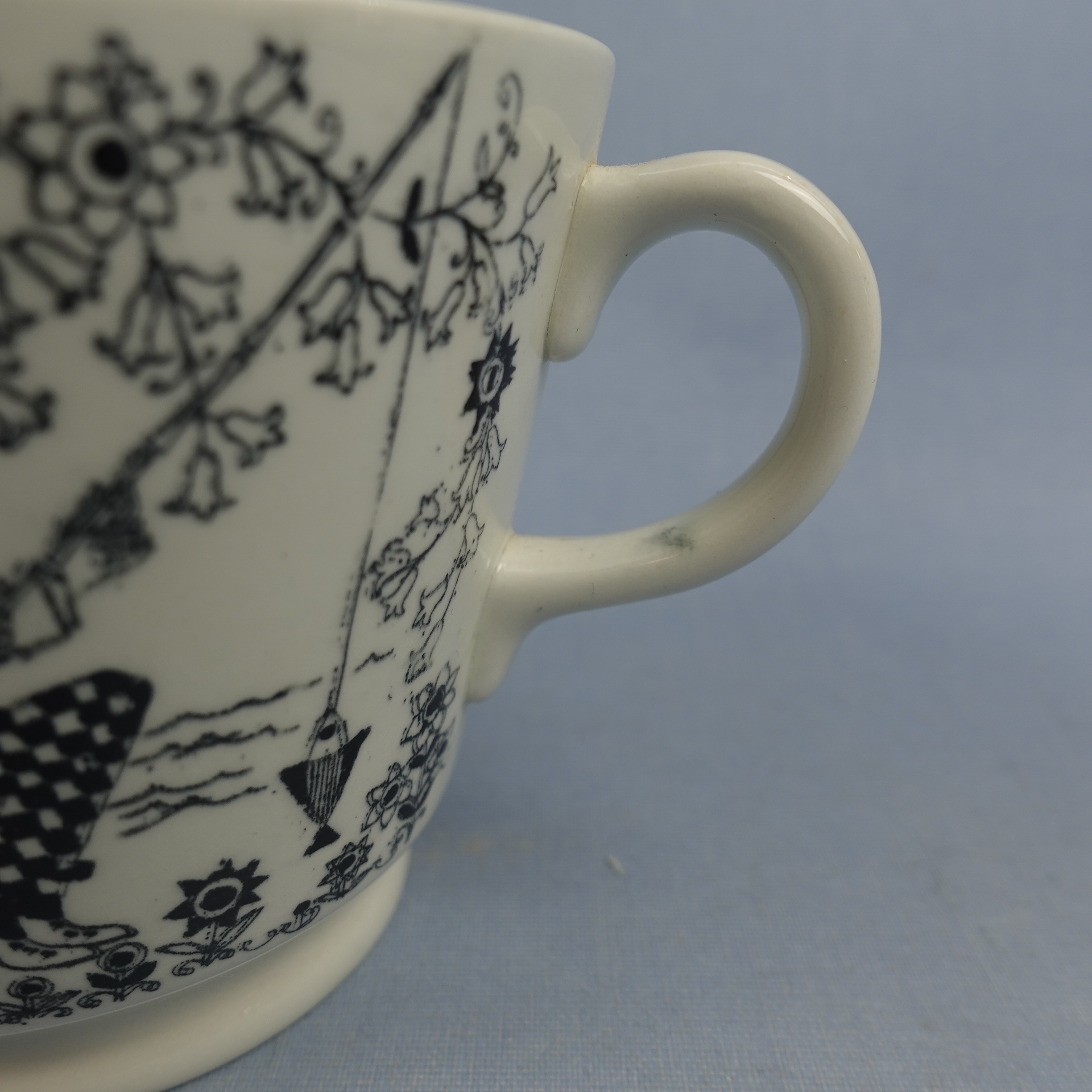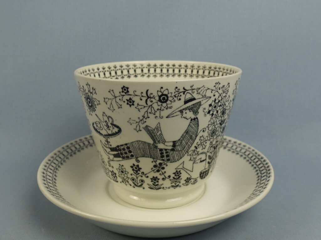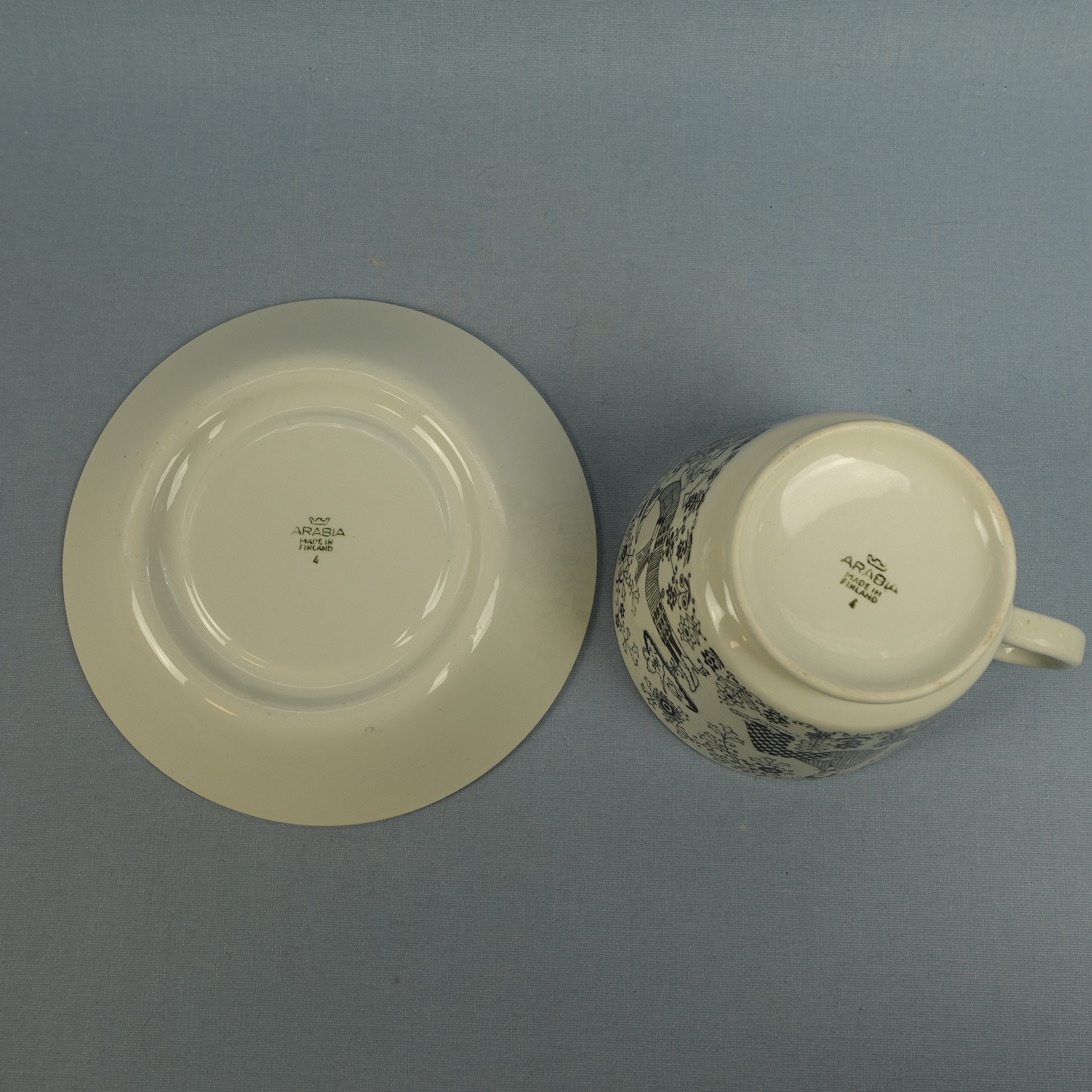 Raija Uosikkisen Arabialle suunnitteleman Emilia-sarjan isokokoinen kahvikuppi. Koriste oli tuotannossa Kaj Franckin suunnittelemassa XB-mallin kupissa v. 1958-66. Kupin korkeus on 9,2 cm, halkaisija 11,5 cm ja tilavuus 50 cl. Lautasen halkaisija on 17 cm ja korkeus 3 cm. Myynnissä oleva harvinainen kuppi on ehjä ja muutenkin hyväkuntoinen. Siinää ei ole juurikaan käytöstä tulleita jälkiä, eikä myöskään krakeloitumia. Kupin korvassa on pieni tuotannon aikainen väritahra kts. kuva.
