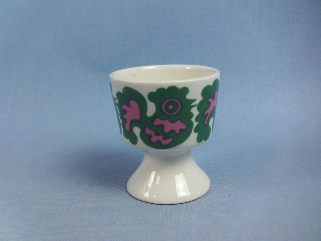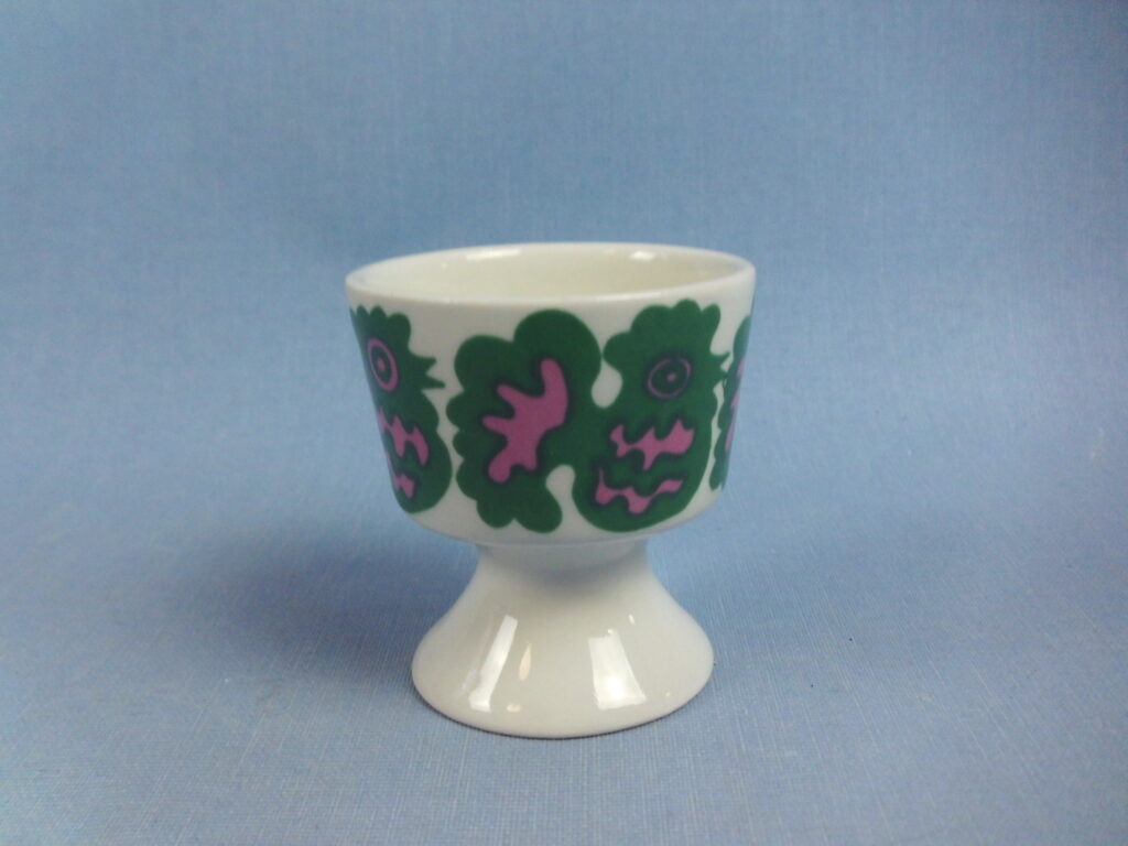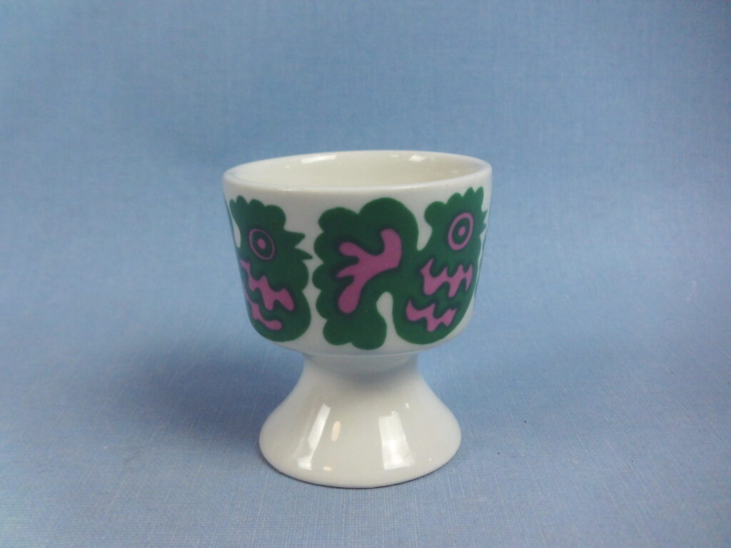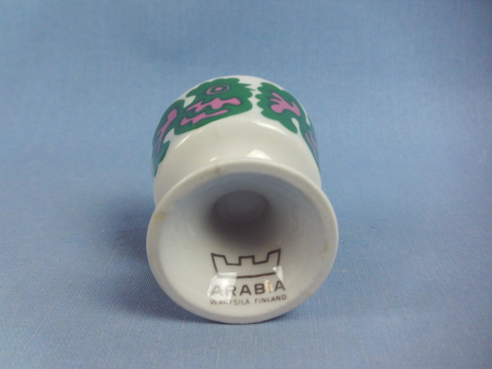 Gunvor Olin-Grönqvistin Arabialle suunnittelema vihreä Emma munakuppi. Koriste oli tuotannossa Kaarina Ahon suunnittelemissa HN-mallin munakupeissa 1970-luvun alussa. Munakupin korkeus on 5,4 cm ja halkaisija 4,8 cm. Myynnissä oleva munakuppi on ehjä ja muutenkin hyväkuntoinen.