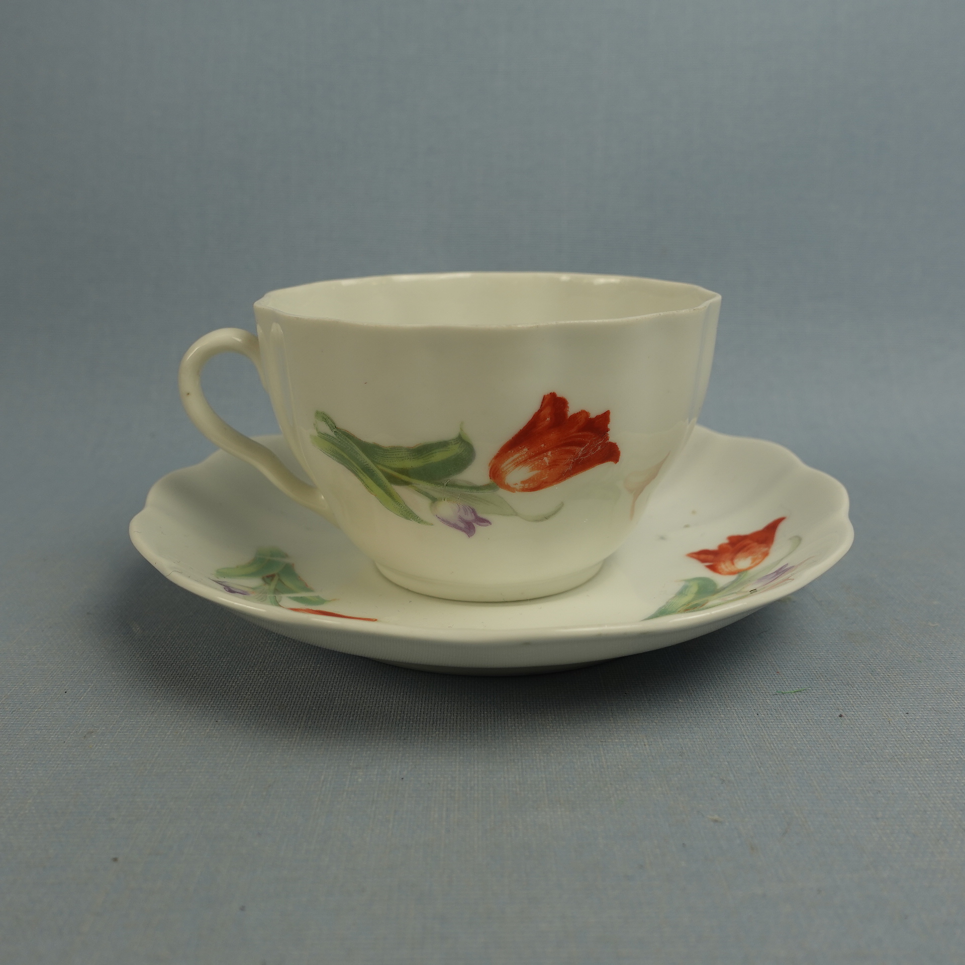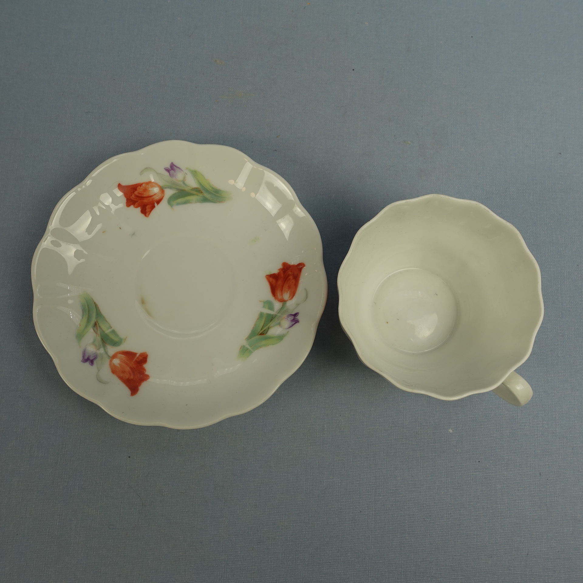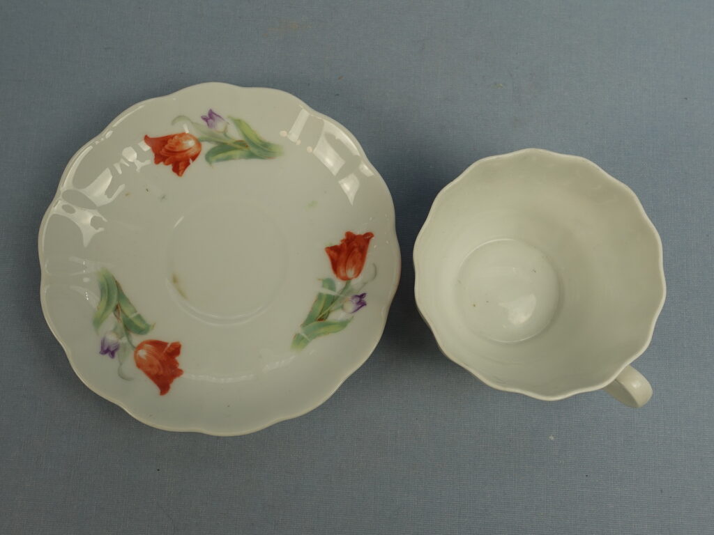 Arabian valmistama kahvikuppi oranssilla tulppaani koristeella. Kuppi on kakkoslaatua. Kupin korkeus on 5,2 cm, halkaisija 9 cm ja tilavuus 14 cl. Lautasen halkaisija on 13,4 cm. Myynnissä oleva kuppi on ehjä ja muutenkin hyväkuntoinen.
