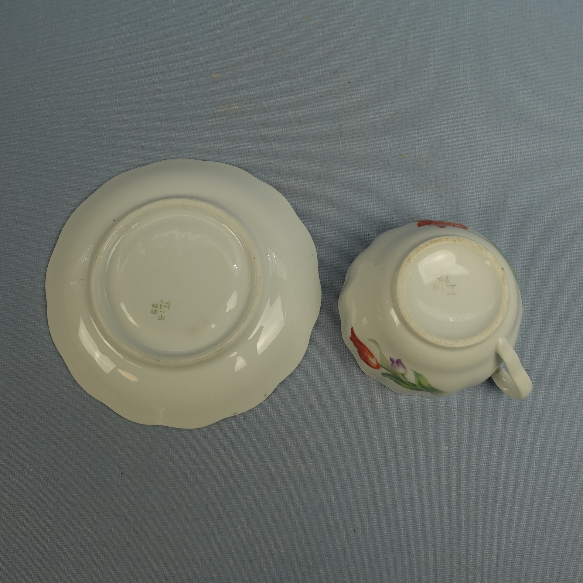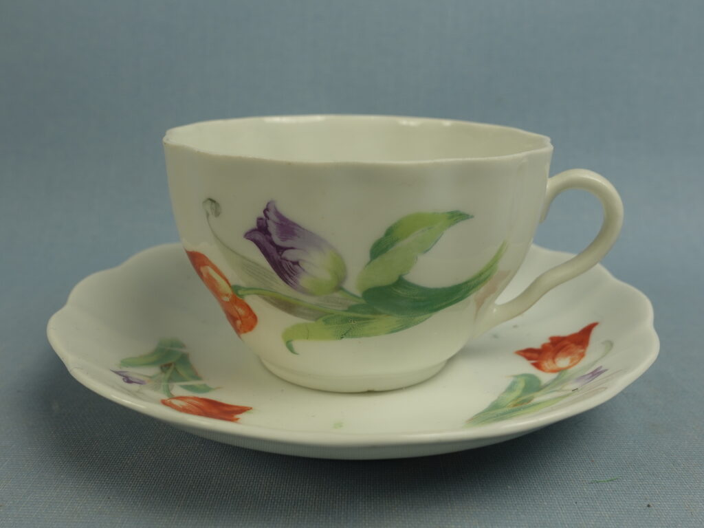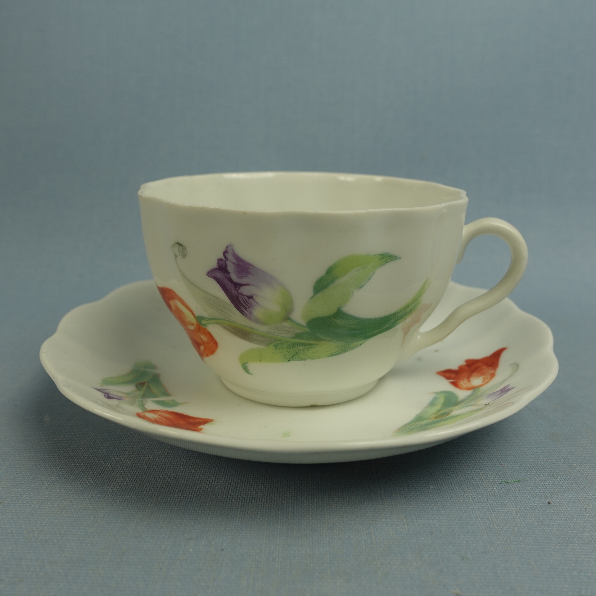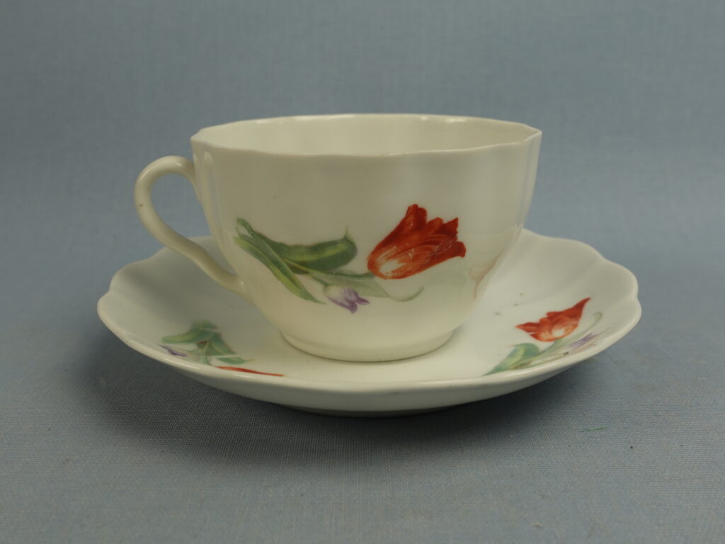 Arabian valmistama kahvikuppi oranssilla tulppaani koristeella. Kuppi on kakkoslaatua. Kupin korkeus on 5,2 cm, halkaisija 9 cm ja tilavuus 14 cl. Lautasen halkaisija on 13,4 cm. Myynnissä oleva kuppi on ehjä ja muutenkin hyväkuntoinen.