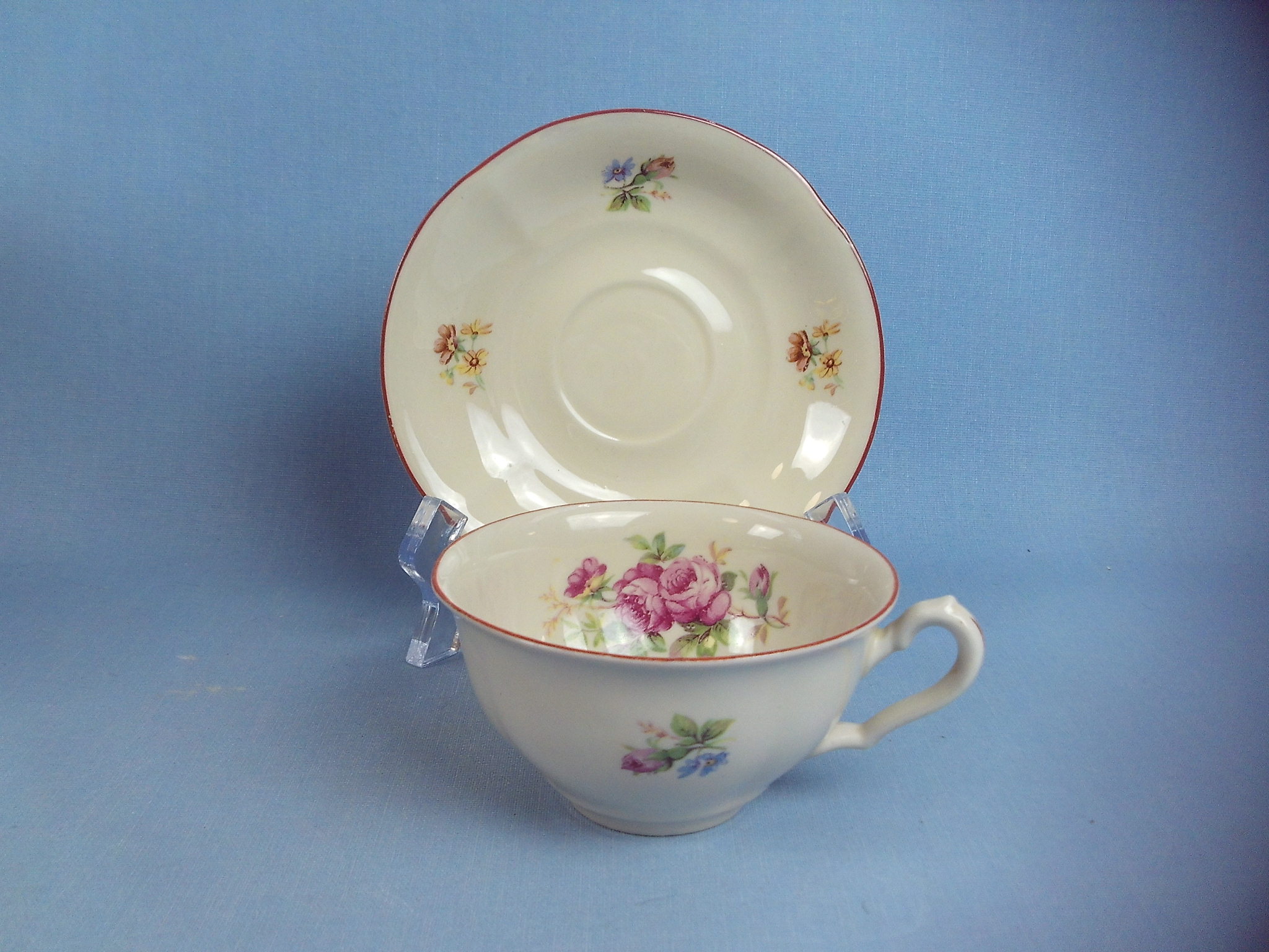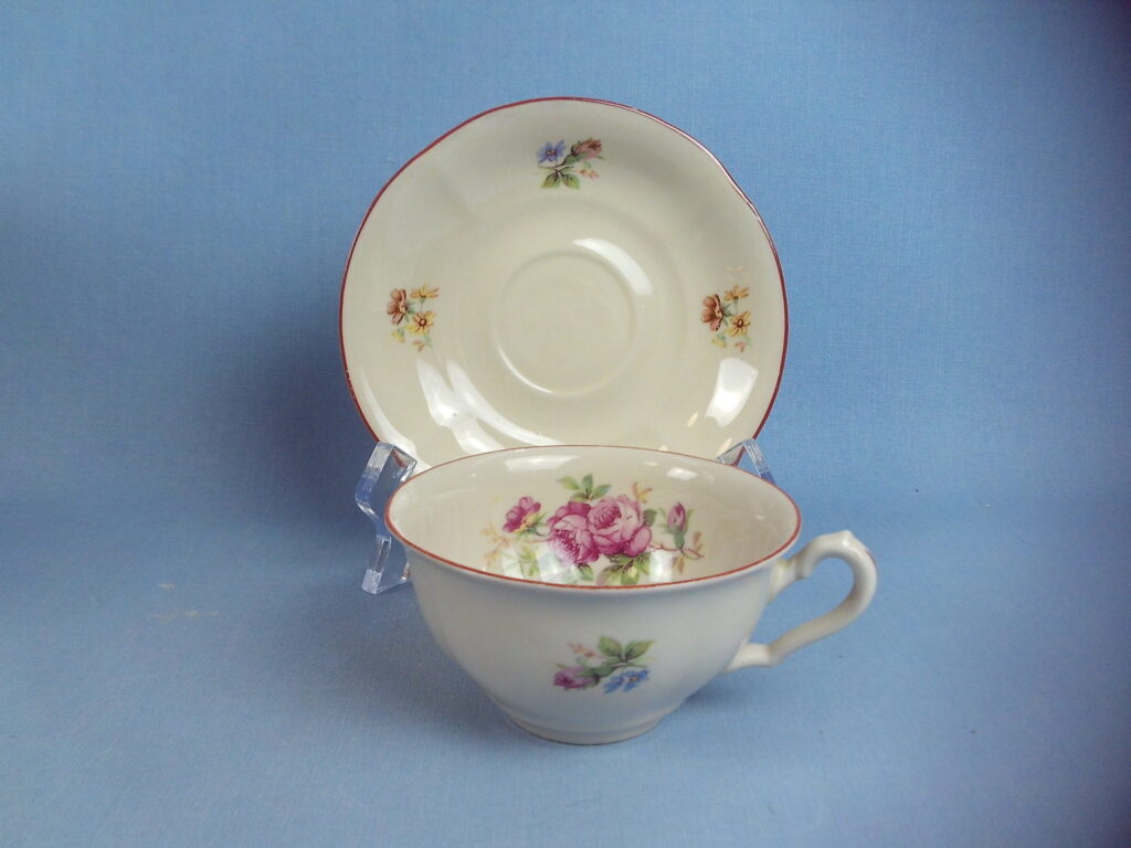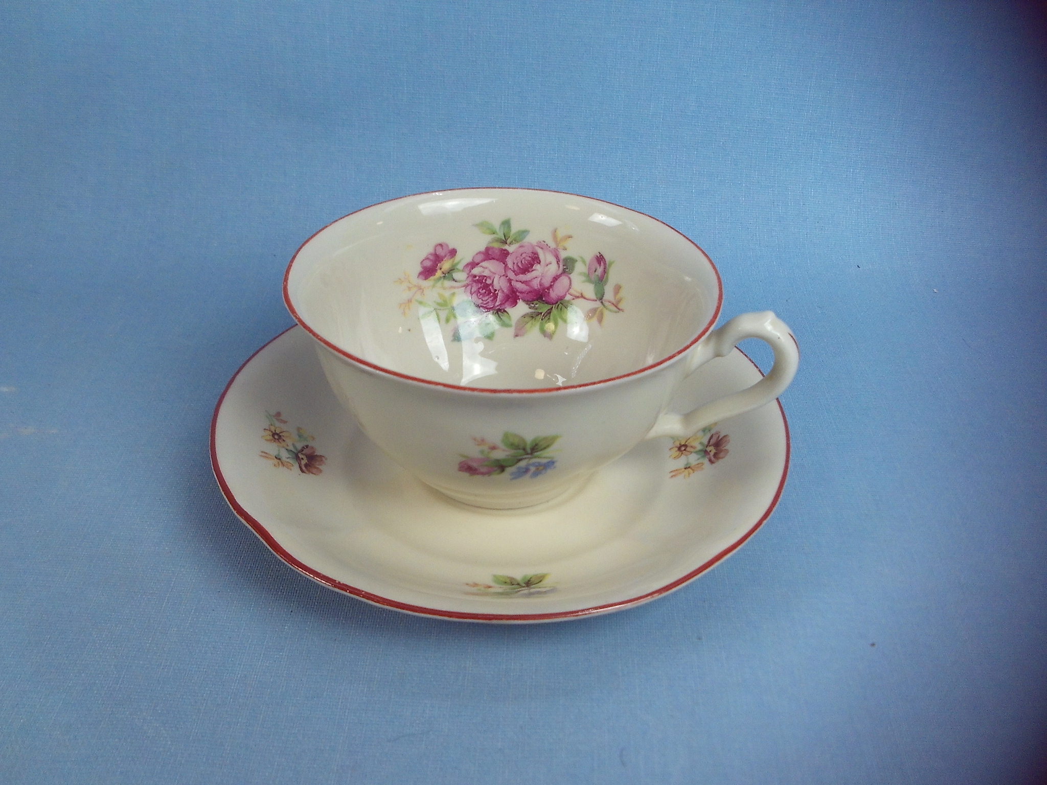 Arabian valmistama ruusukoristeinen kahvikuppi punaisella reunalla 1940-luvulta. Kupin korkeus on 4,8 cm, halkaisija 8,8 cm ja tilavuus 15 cl. Lautasen halkaisija on 12,6 cm. Myynnissä olevat kupit ovat ehjiä ja muutenkin hyväkuntoisia.