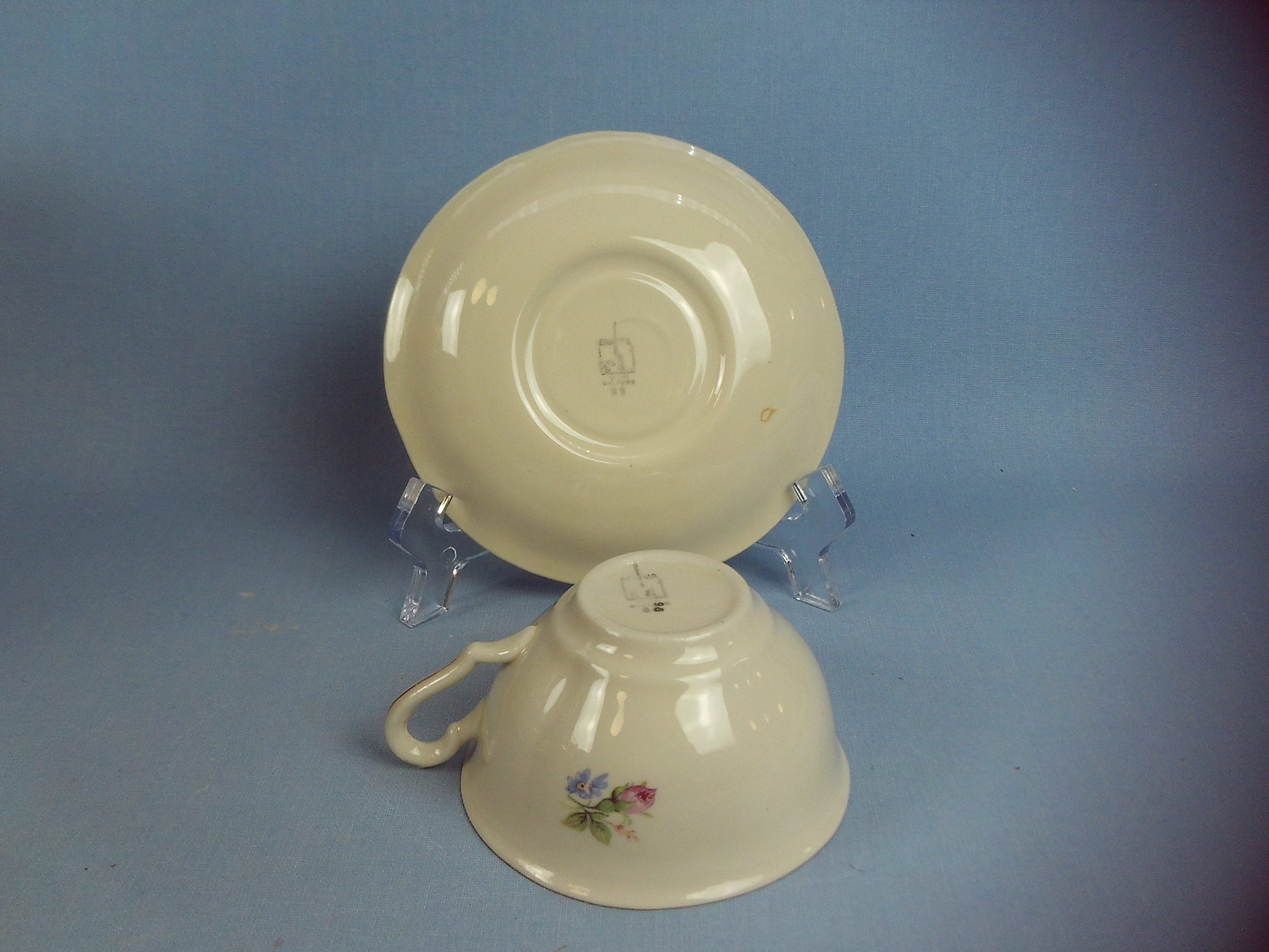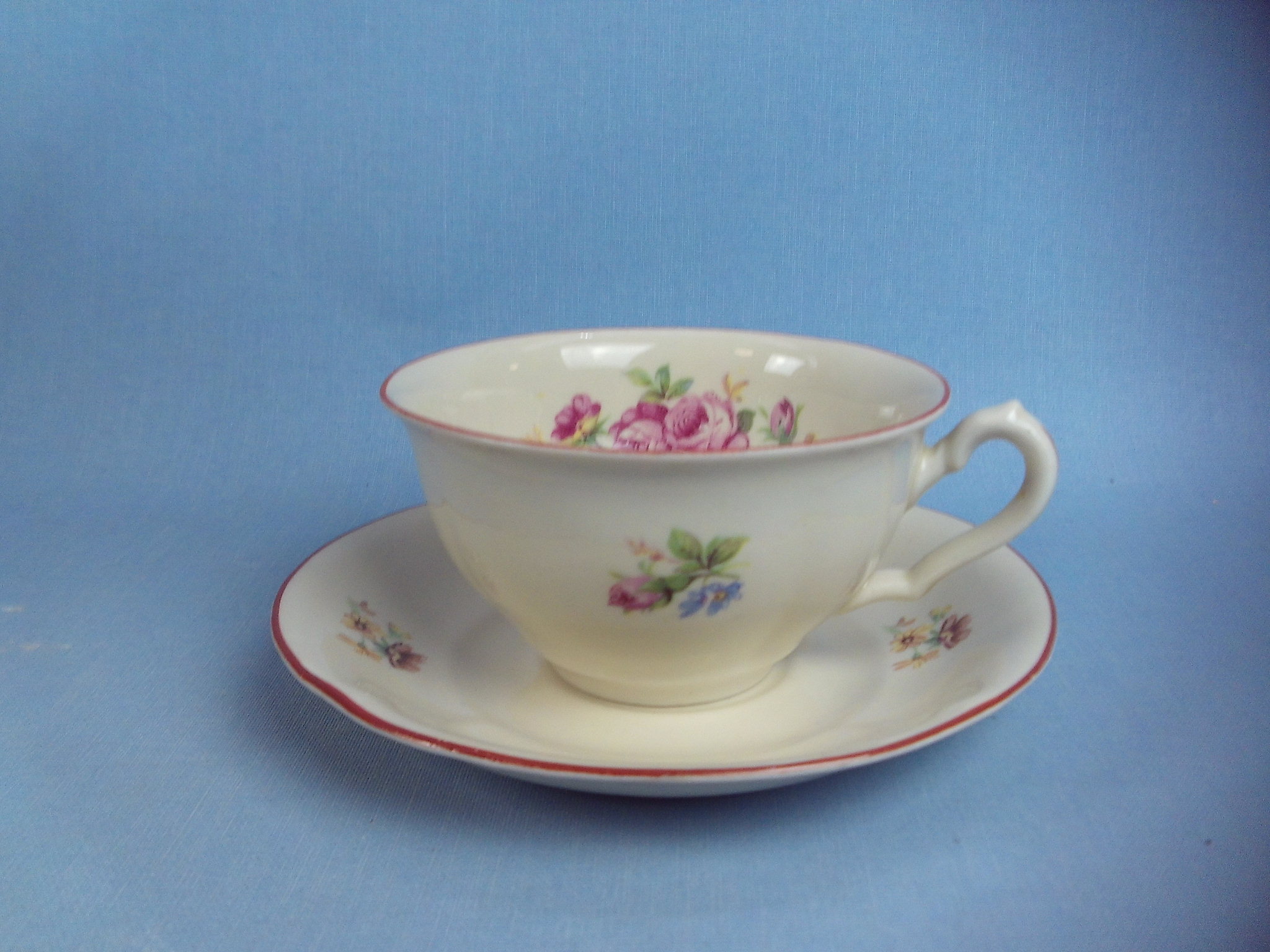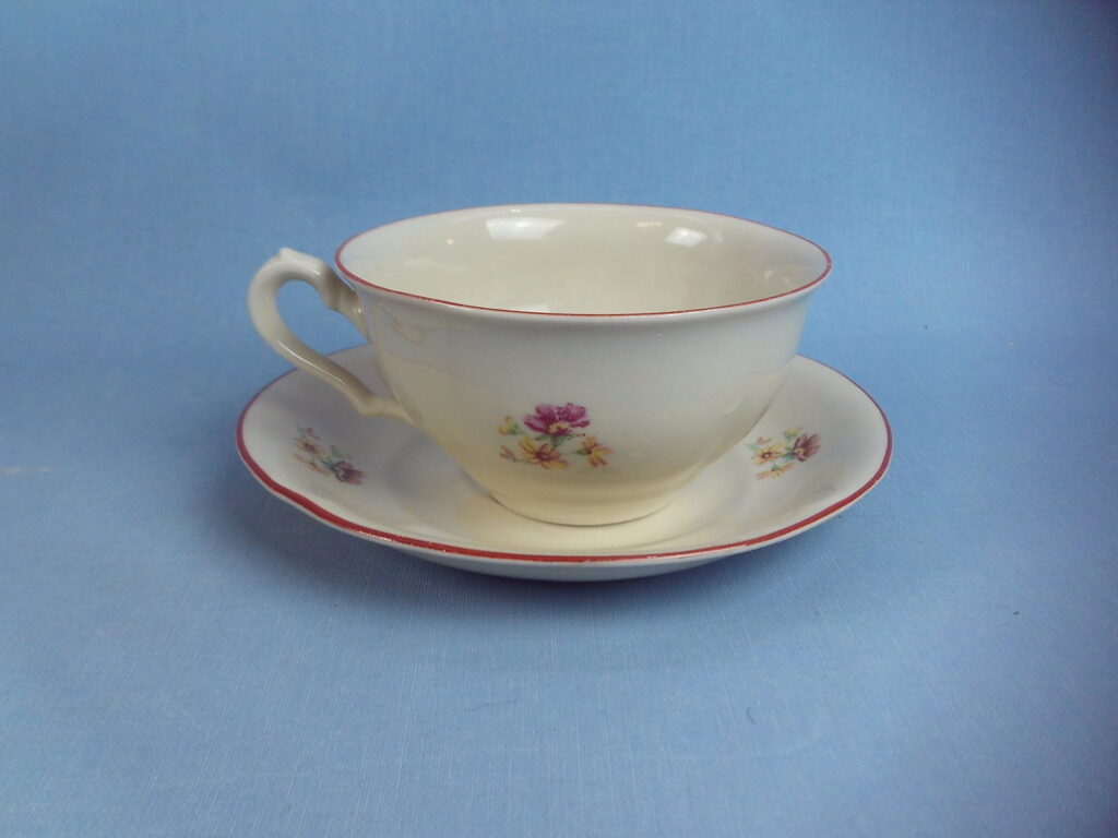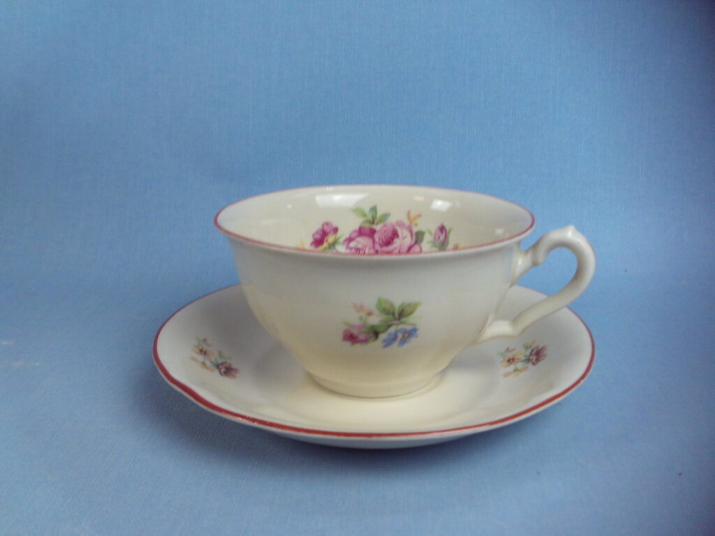 Arabian valmistama ruusukoristeinen kahvikuppi punaisella reunalla 1940-luvulta. Kupin korkeus on 4,8 cm, halkaisija 8,8 cm ja tilavuus 15 cl. Lautasen halkaisija on 12,6 cm. Myynnissä olevat kupit ovat ehjiä ja muutenkin hyväkuntoisia.
