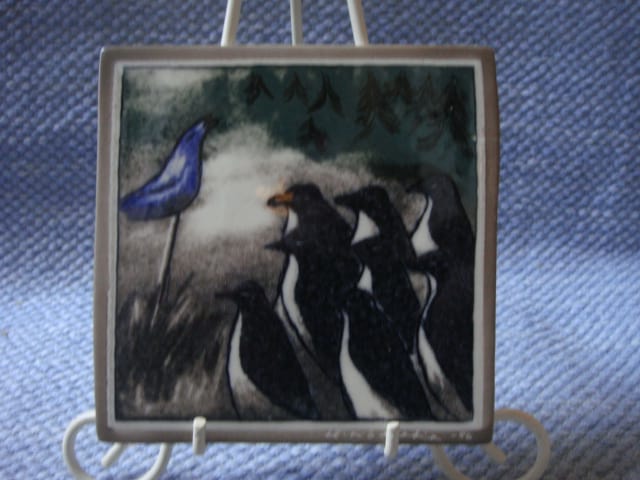 Pingviini-aiheinen laatta on suunniteltu v. 1986.