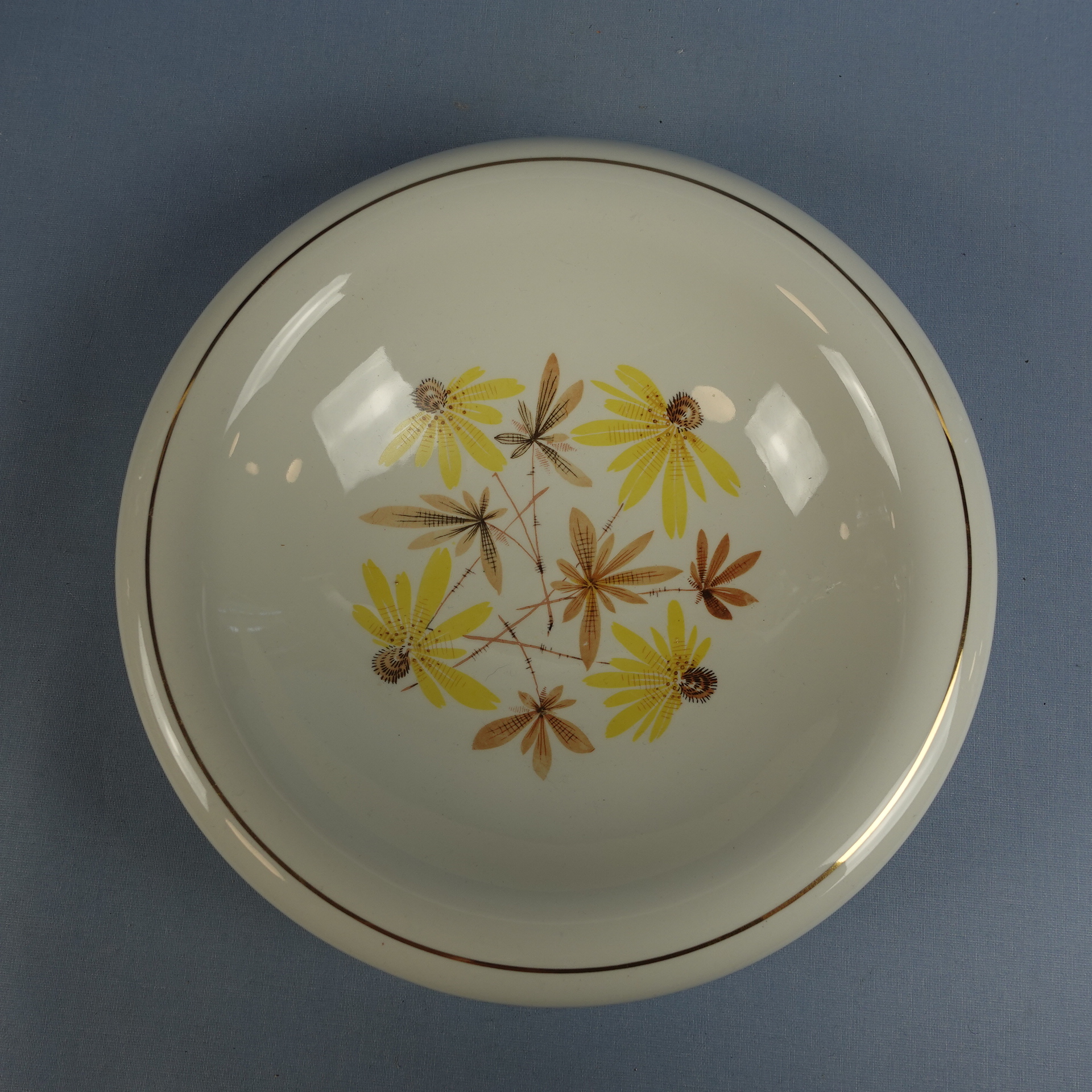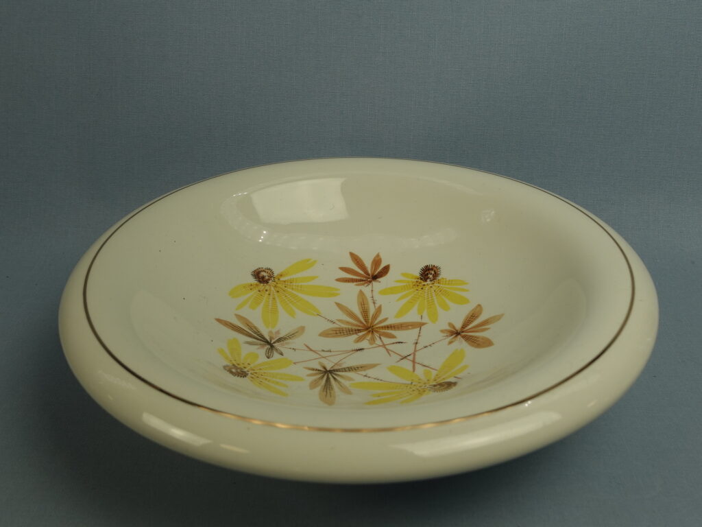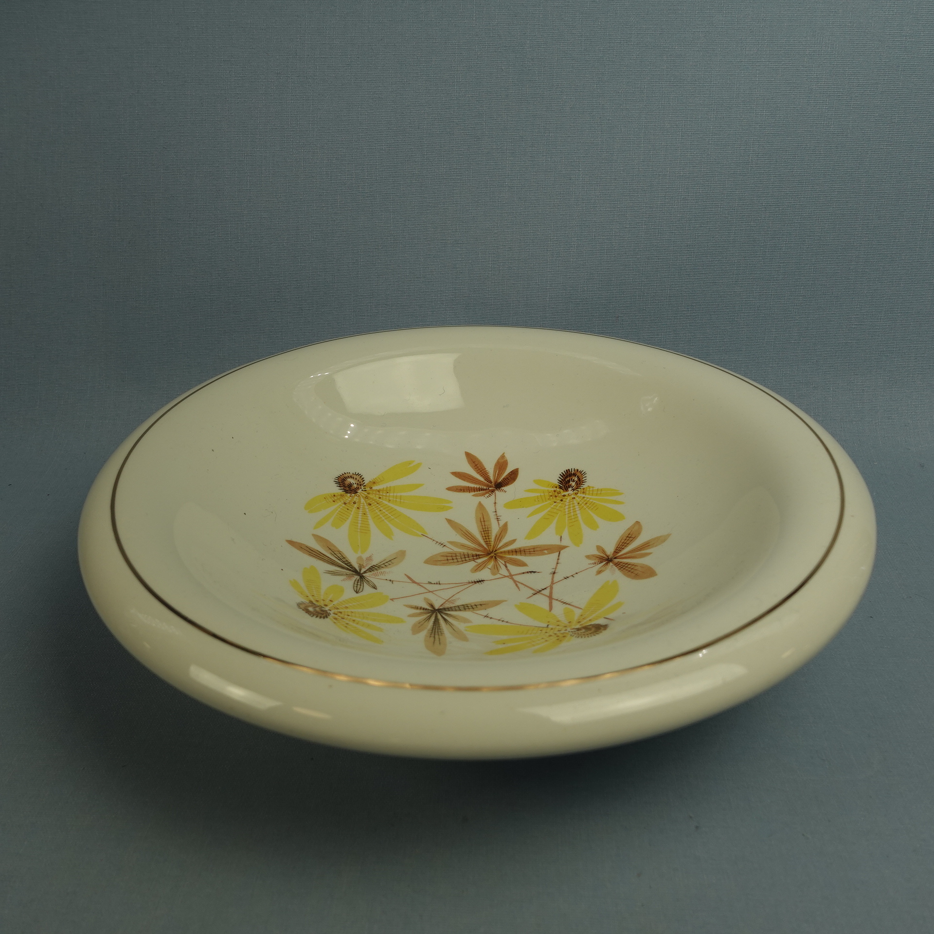 Arabian valmistama koristekulho keltaisilla kukilla. Kulho on 1950/-60-luvun tuotantoa. Kulhon halkaisija on 25 cm ja korkeus 6,5 cm. Myynnissä oleva kulho on ehjä ja muutenkin hyväkuntoinen.