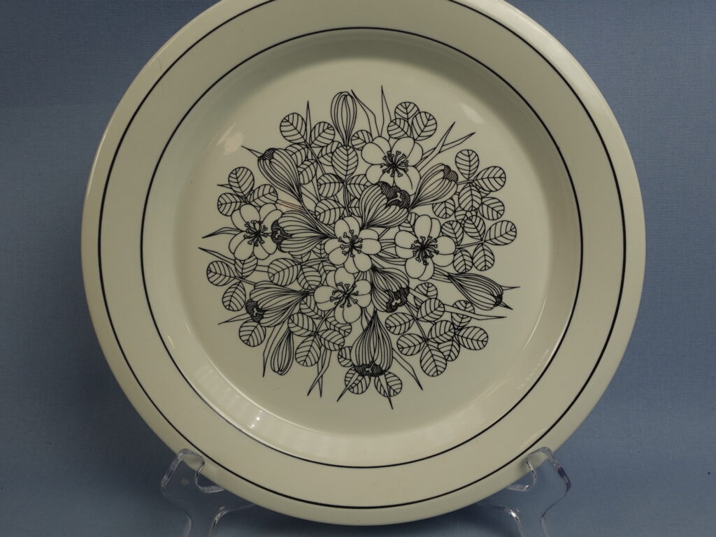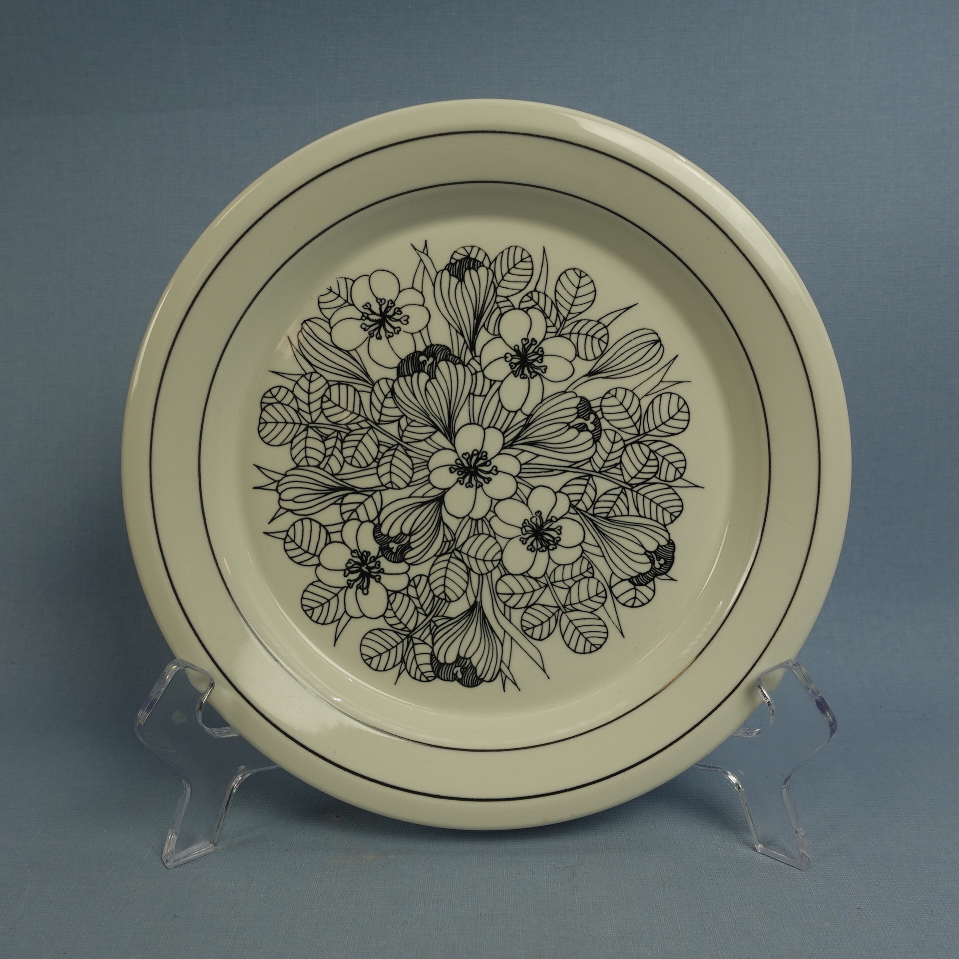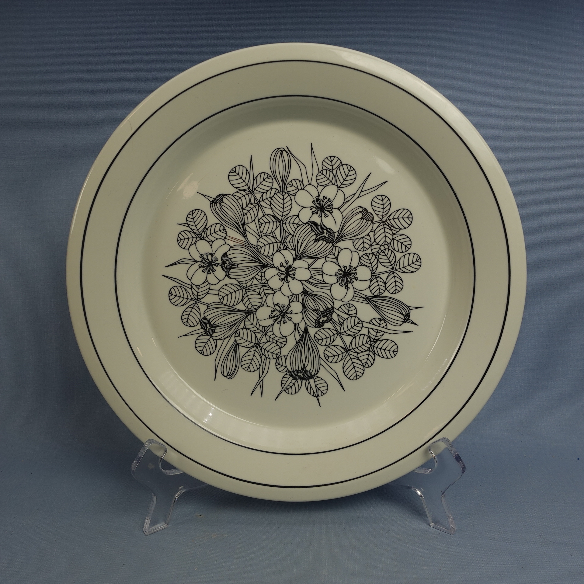 Esteri Tomulan Arabialle suunnitteleman mustavalkoisen Krokus-sarjan eri kokoiset lautaset. Koriste oli tuotannossa Peter Winquistin suunnittelemissa EH-mallin astioissa v. 1978-79. Myynnissä olevat lautaset ovat ehjiä ja muutenkin hyväkuntoisia. Niissä on vain vähän käytöstä tulleita jälkiä.