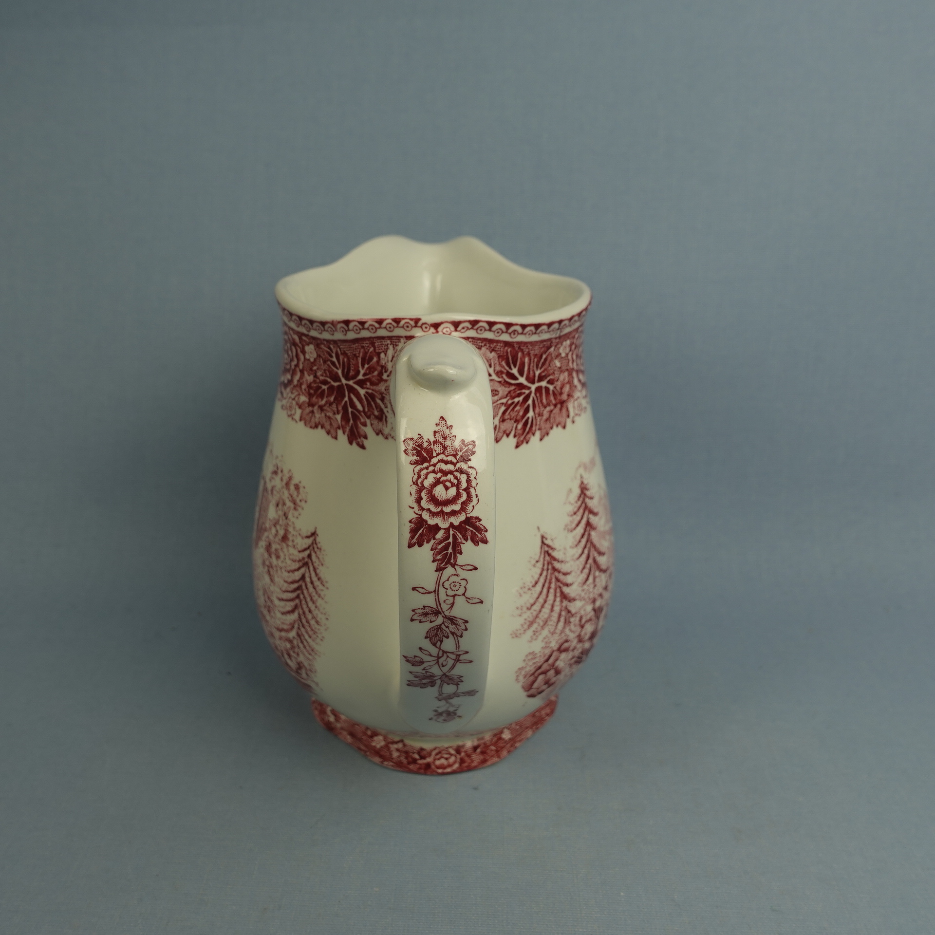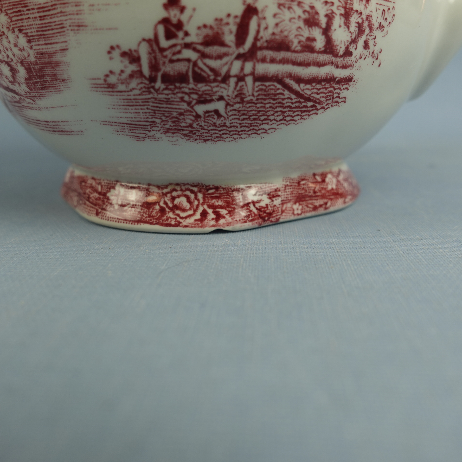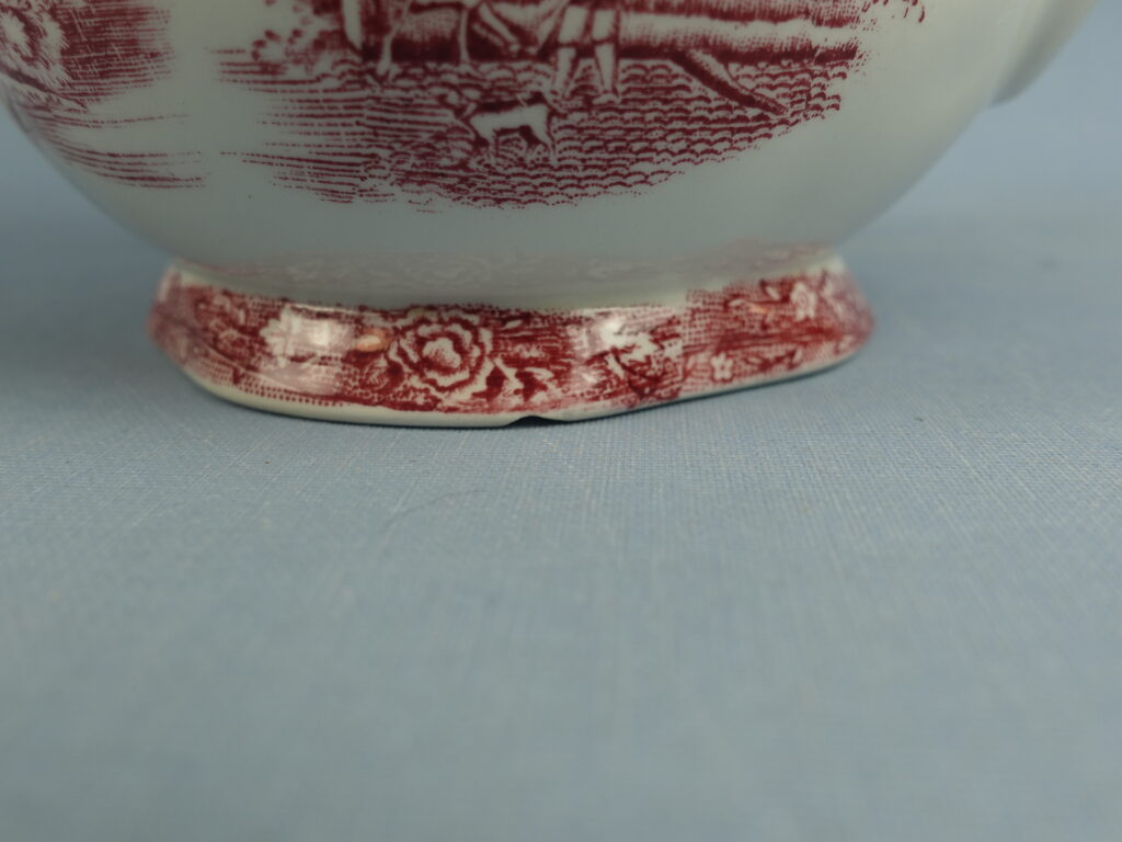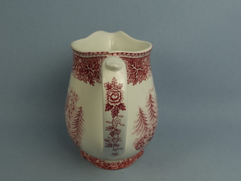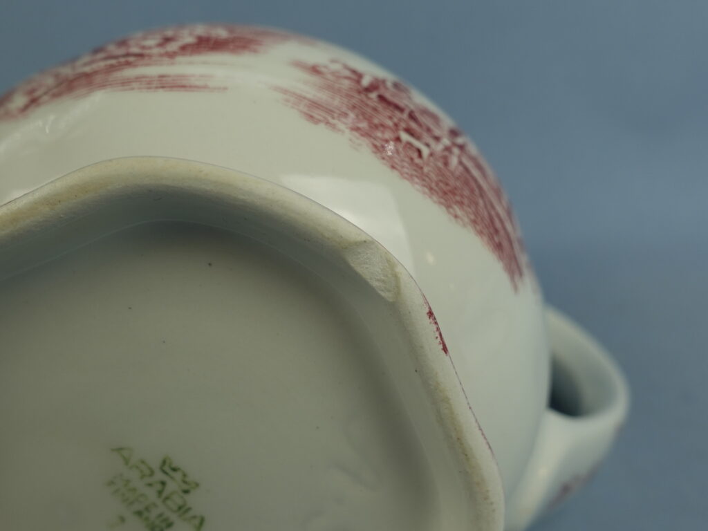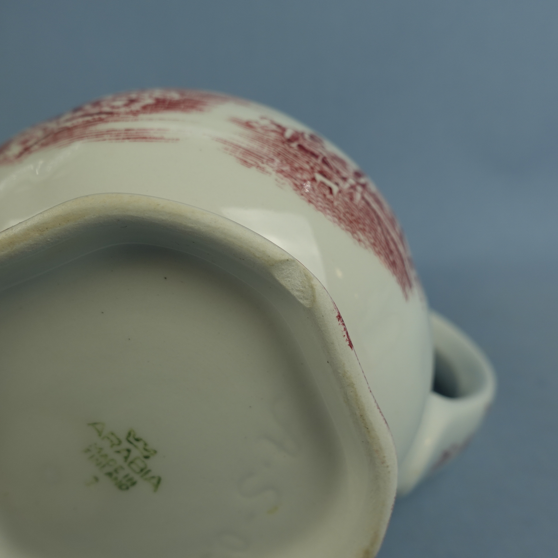 Arabian valmistamat punaisen Maisema-sarjan kaatimet. Koriste oli tuotannossa Reinhard Richterin suunnittelemissa AS-mallin astioissa v. 1941-54 sekä 1964-65. Myynnissä oleva kaadin on siistikuntoinen ja lasitteen osalta ehjä. Ainoastaan anturasta puuttuu pieni pala kts. kuva.