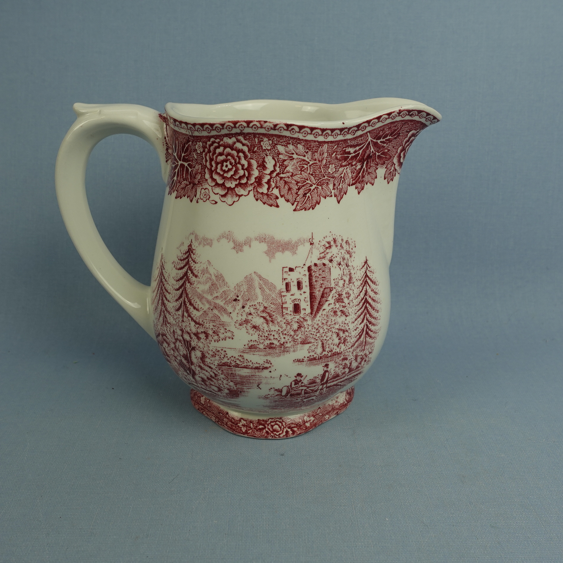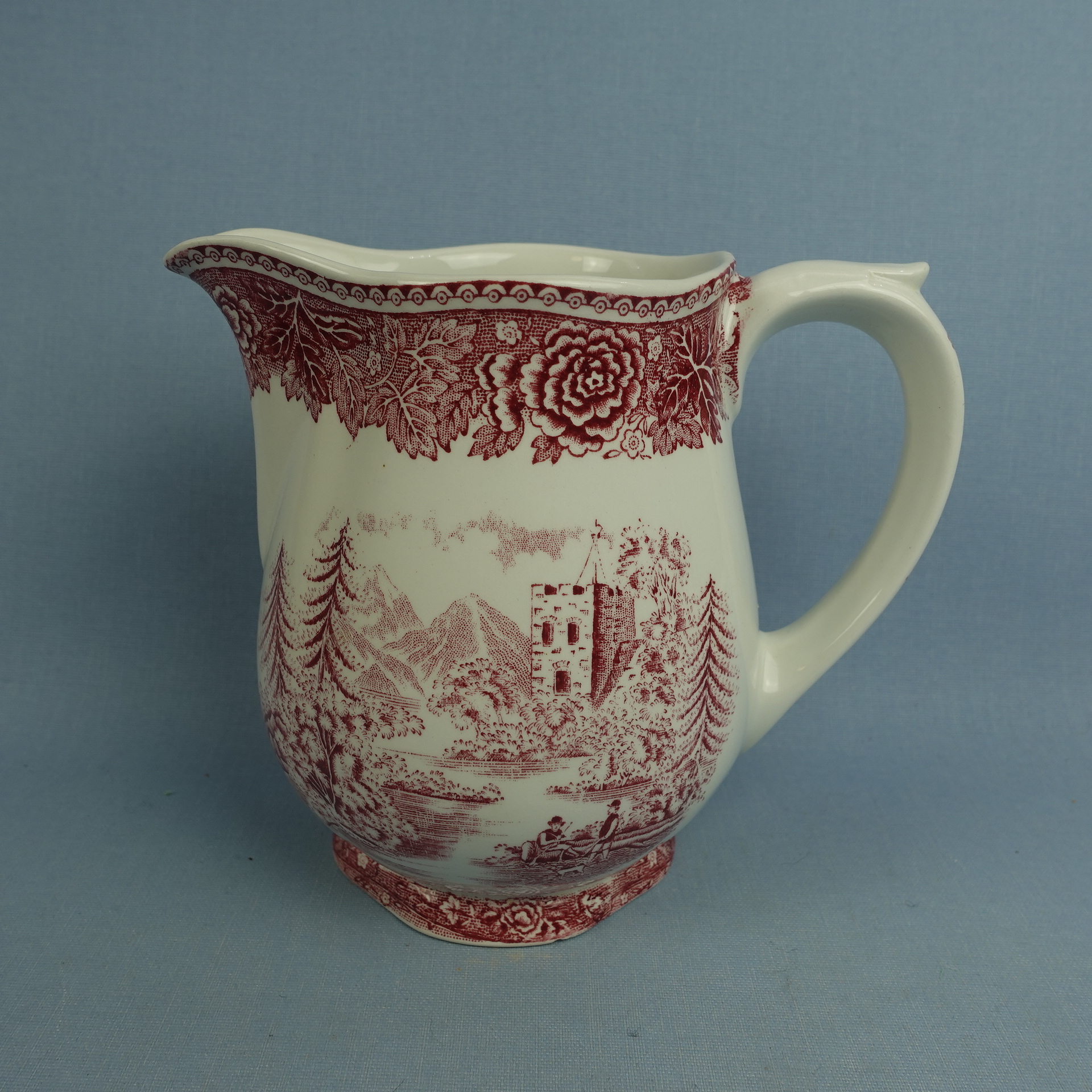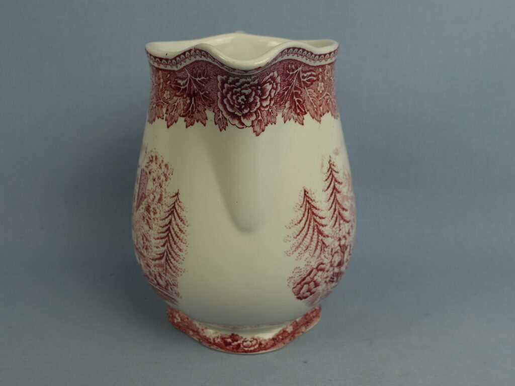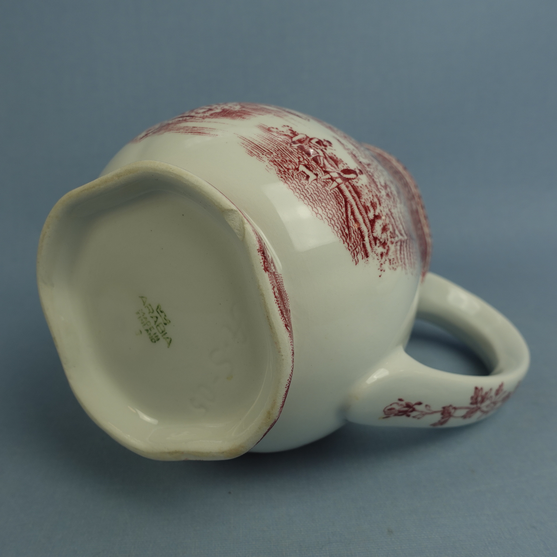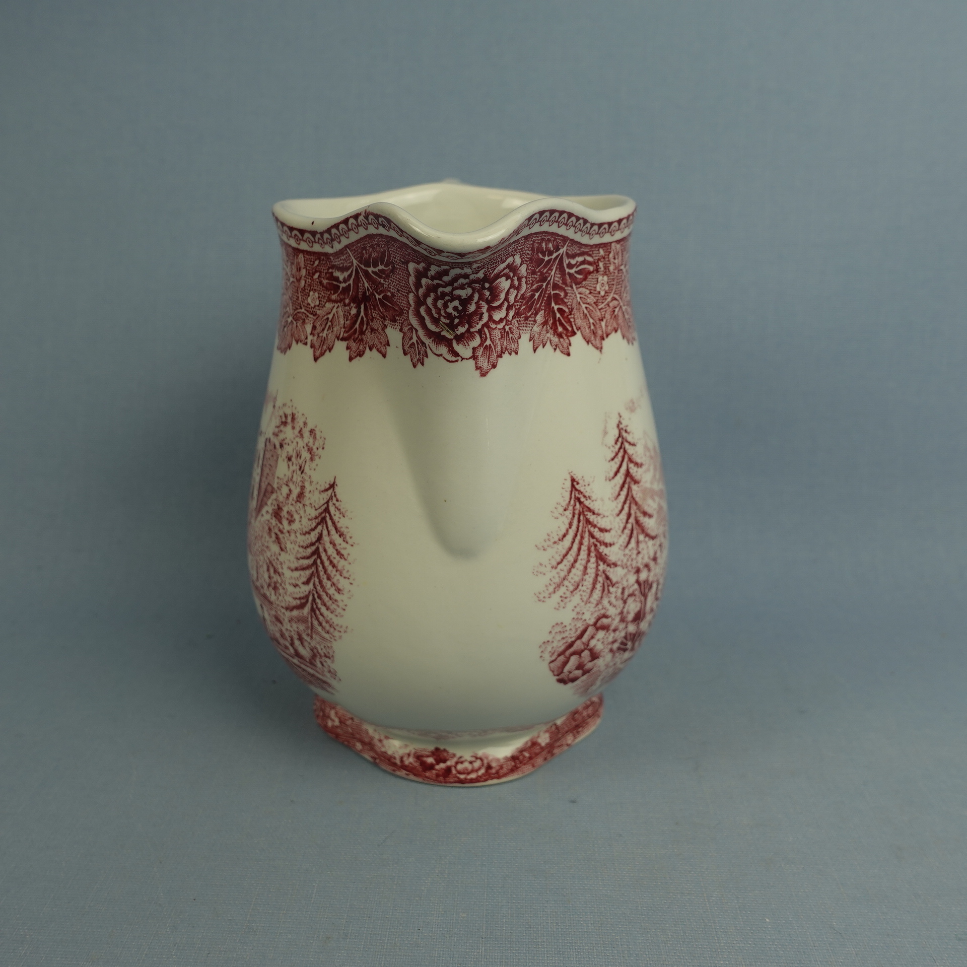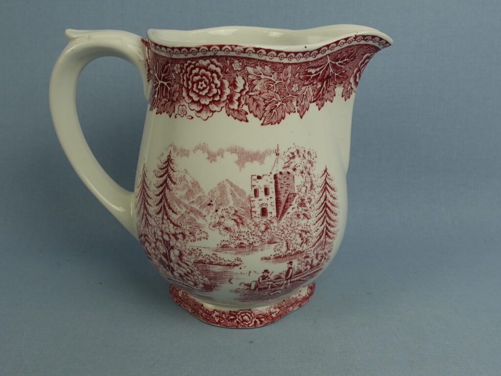 Arabian valmistamat punaisen Maisema-sarjan kaatimet. Koriste oli tuotannossa Reinhard Richterin suunnittelemissa AS-mallin astioissa v. 1941-54 sekä 1964-65. Myynnissä oleva kaadin on siistikuntoinen ja lasitteen osalta ehjä. Ainoastaan anturasta puuttuu pieni pala kts. kuva.