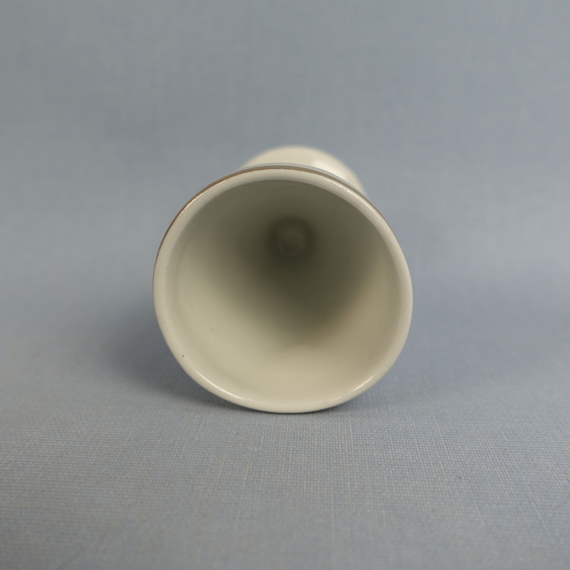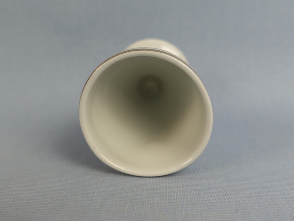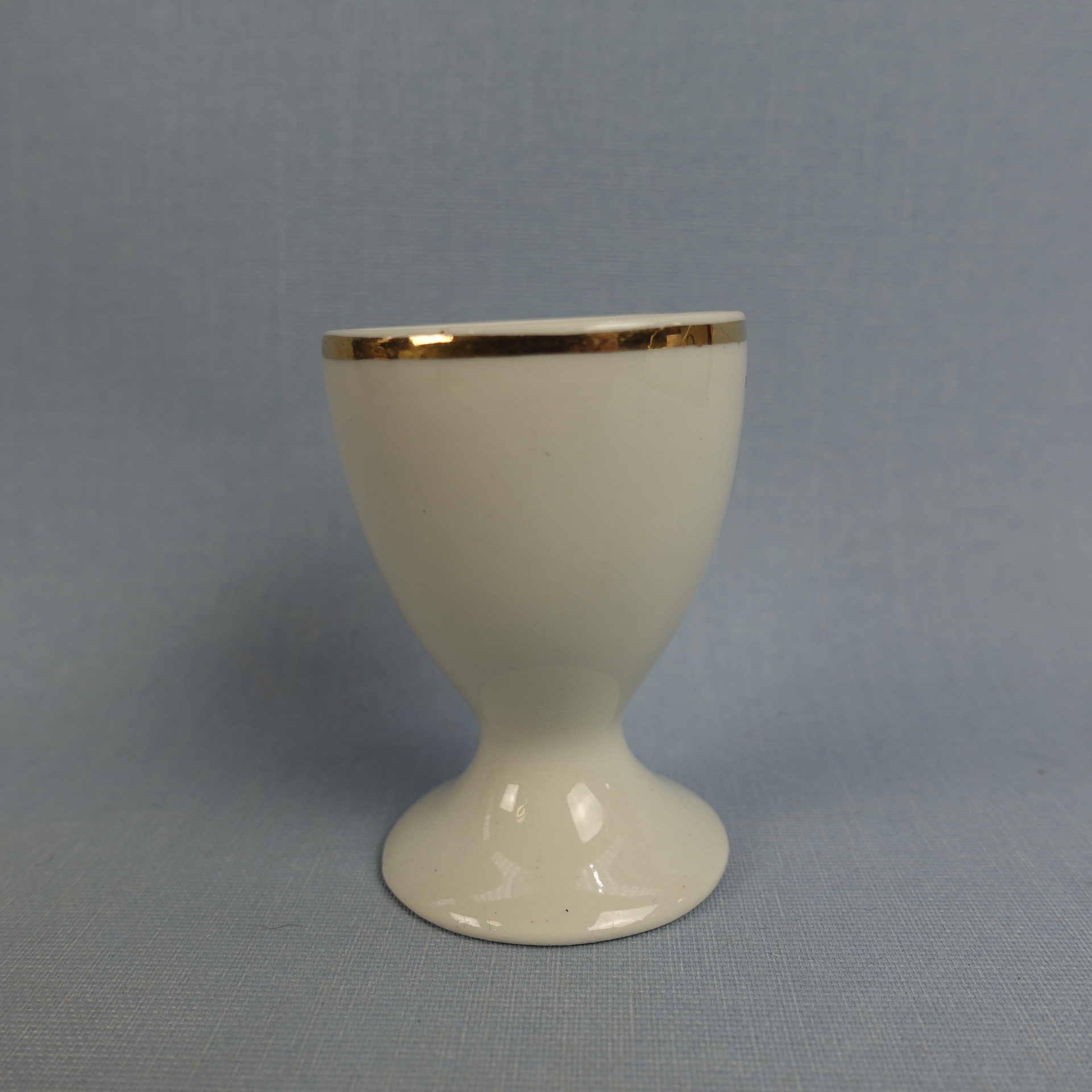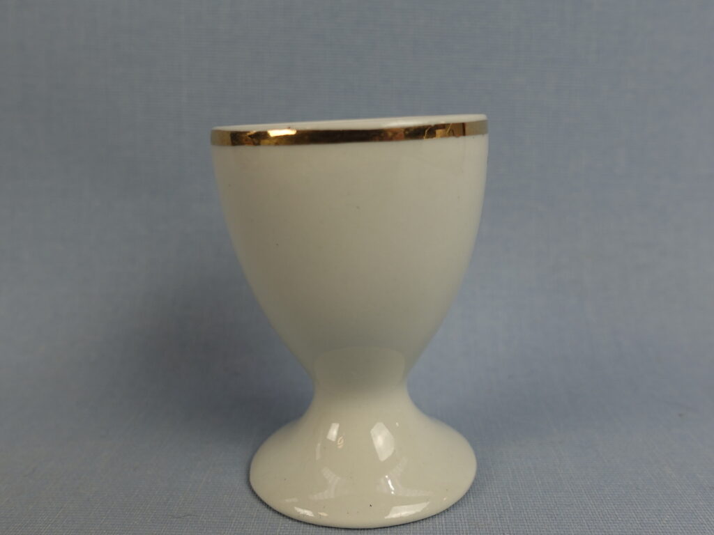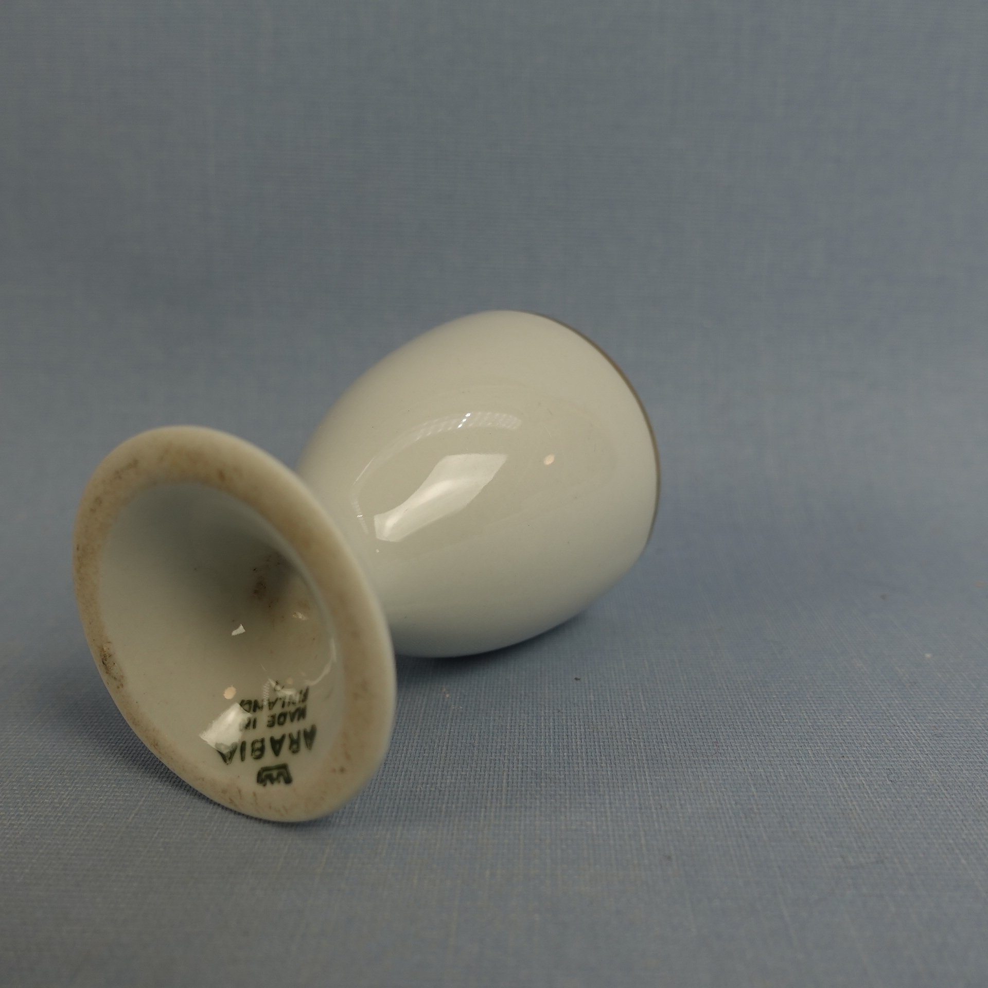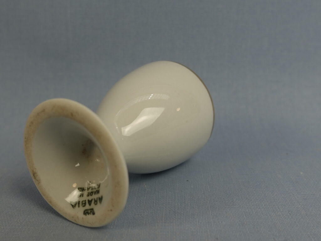 Arabian valmistama jalallinen valkoinen munakuppi kultaraidalla. Munakuppi malli on Reinhard Ricterin suunnittelema. Munakupin korkeus on 6 cm ja halkaisija 4,5 cm. Myynnissä oleva munakuppi on ehjä ja muutenkin hyväkuntoinen.