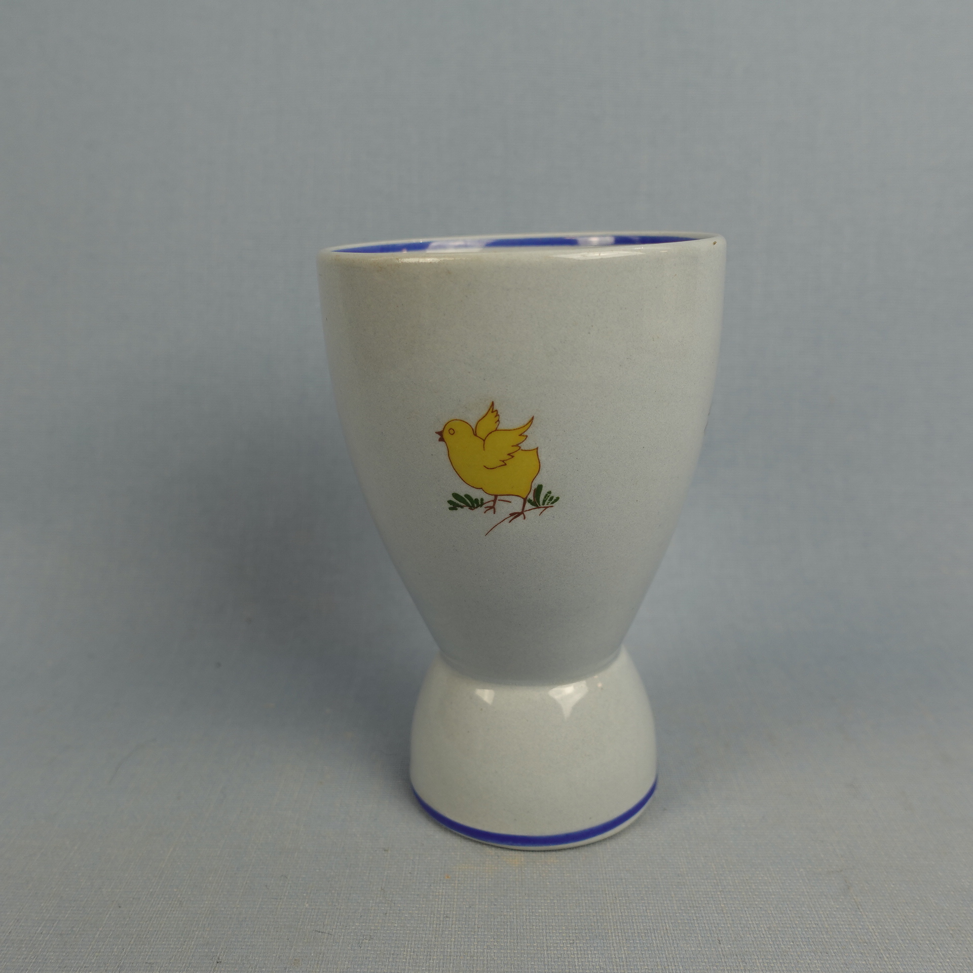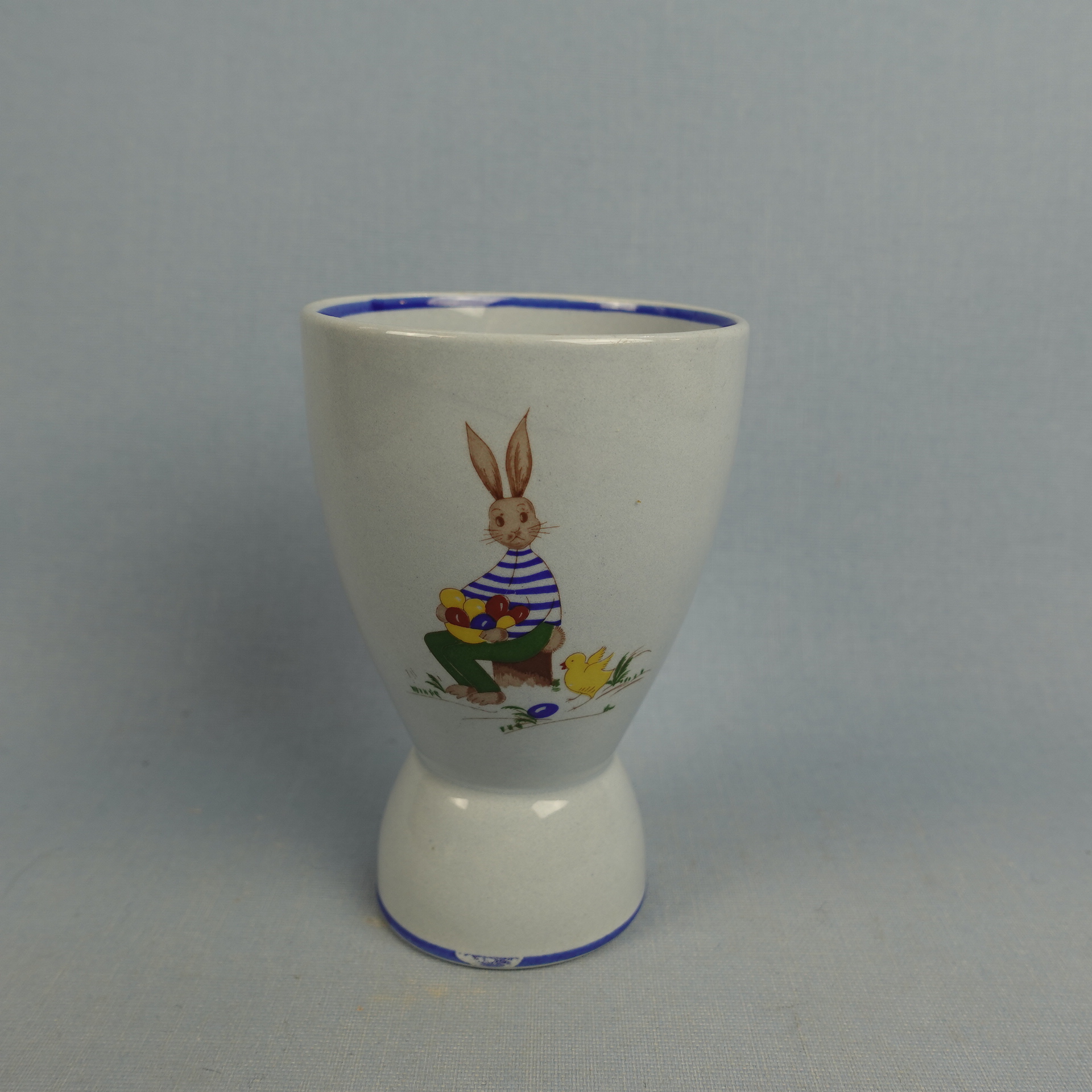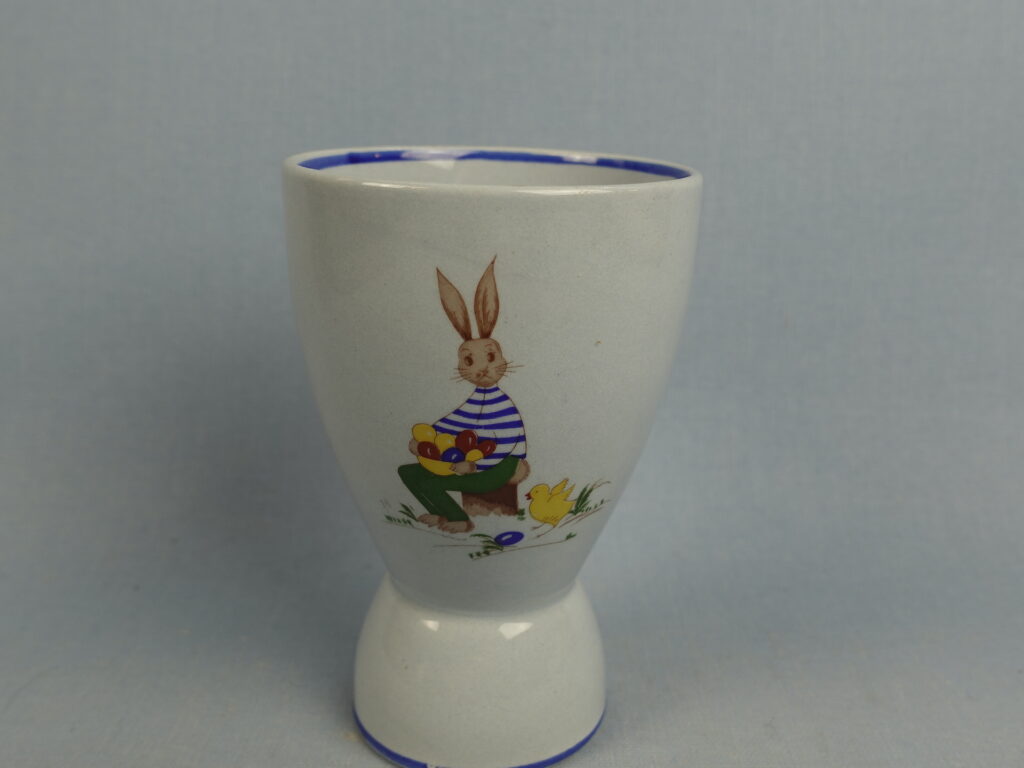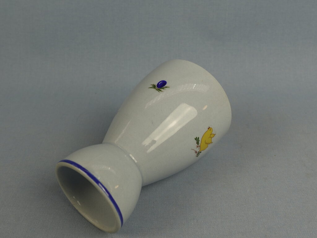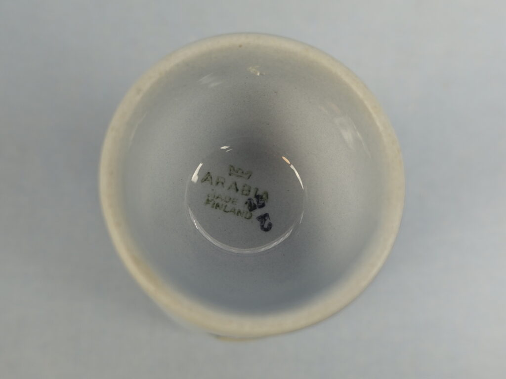 Olga Osolin Arabialle suunnittelema R-mallin sininen munakuppi/pikari pääsiäisaiheisella pupu ja tipu koristeella. Munakupin korkeus on 10,2 cm ja halkaisija 4,8 cm. Pikarin halkaisija on 7 cm ja tilavuus 24 cl. Myynnissä oleva munakuppi/pikari on ehjä ja muutenkin hyväkuntoinen.
