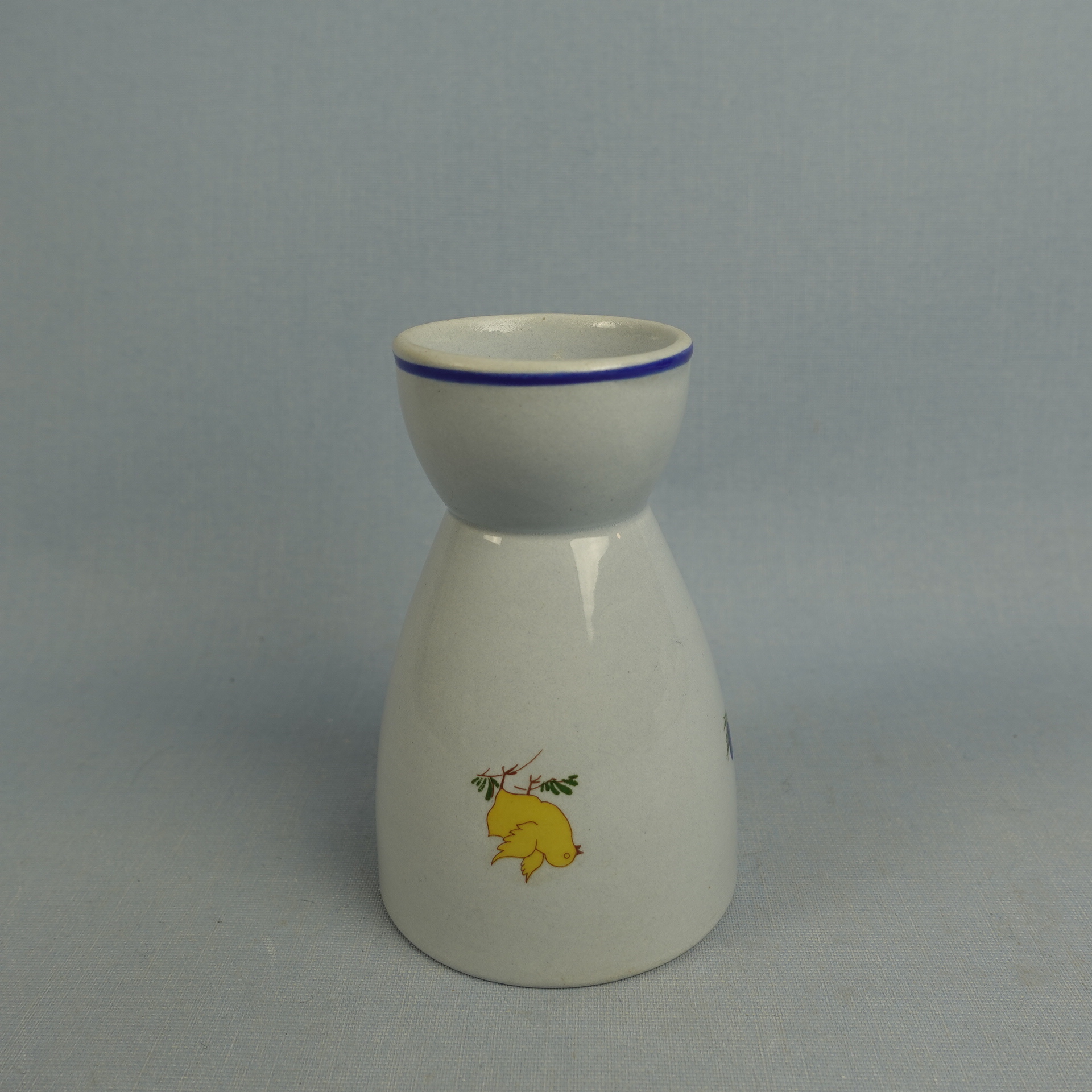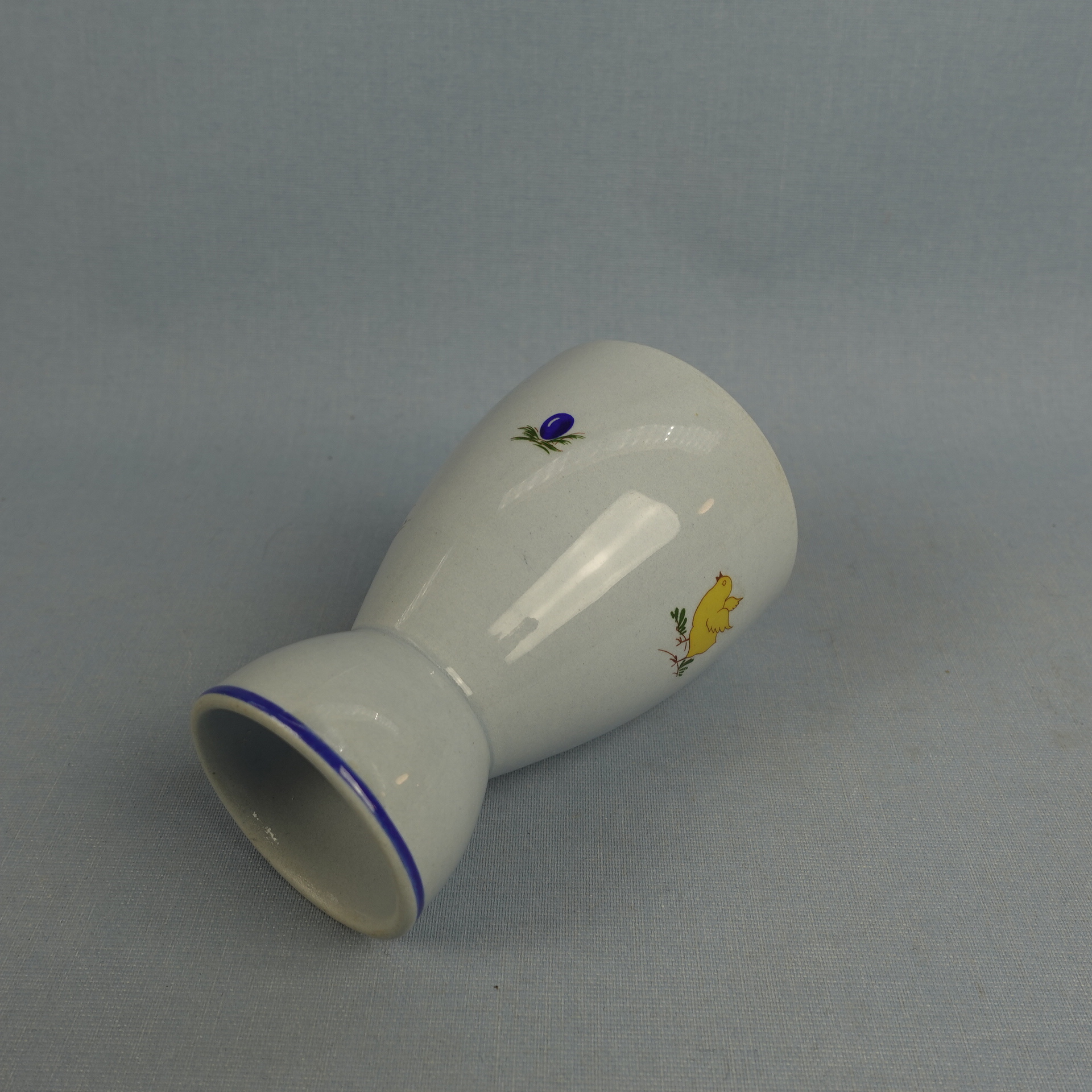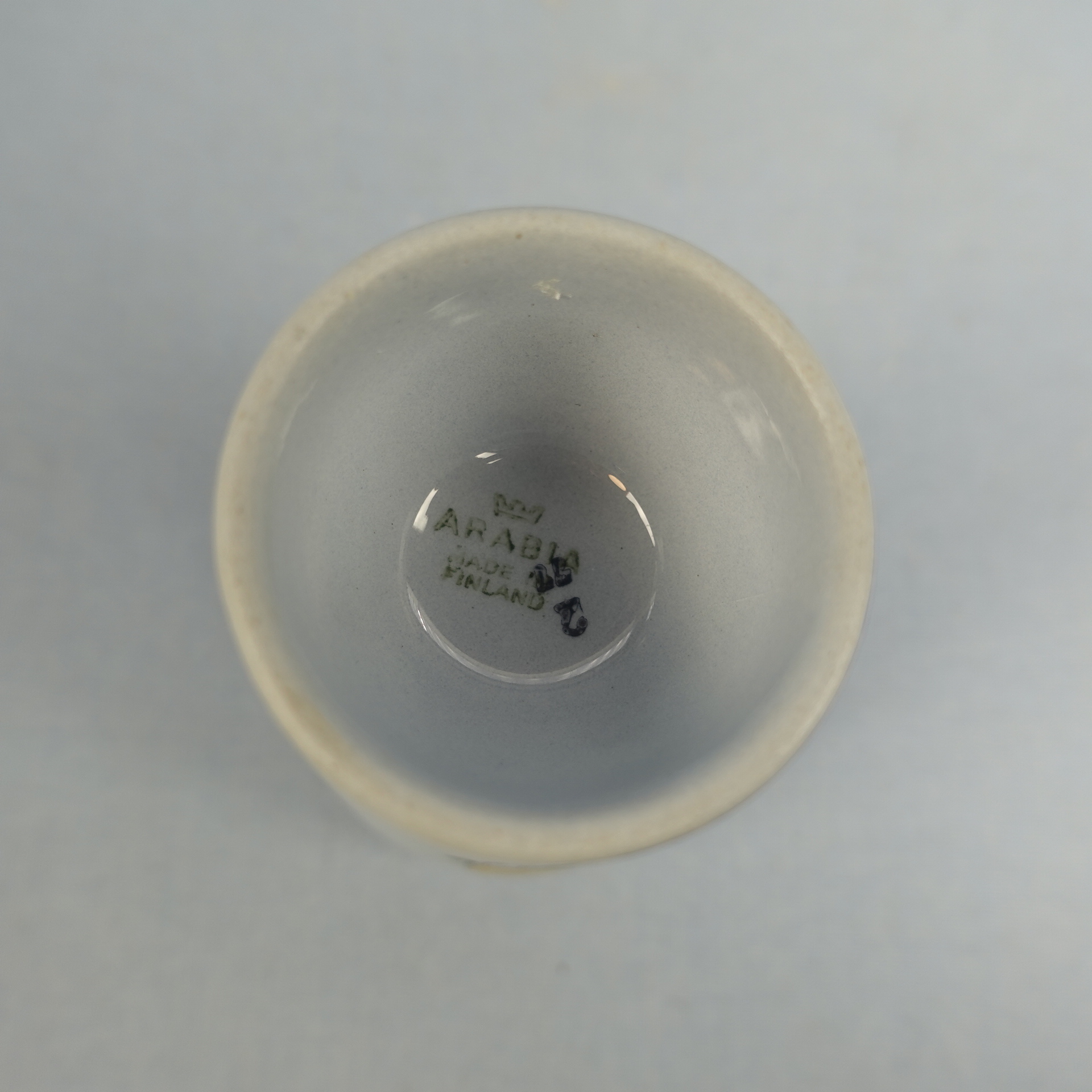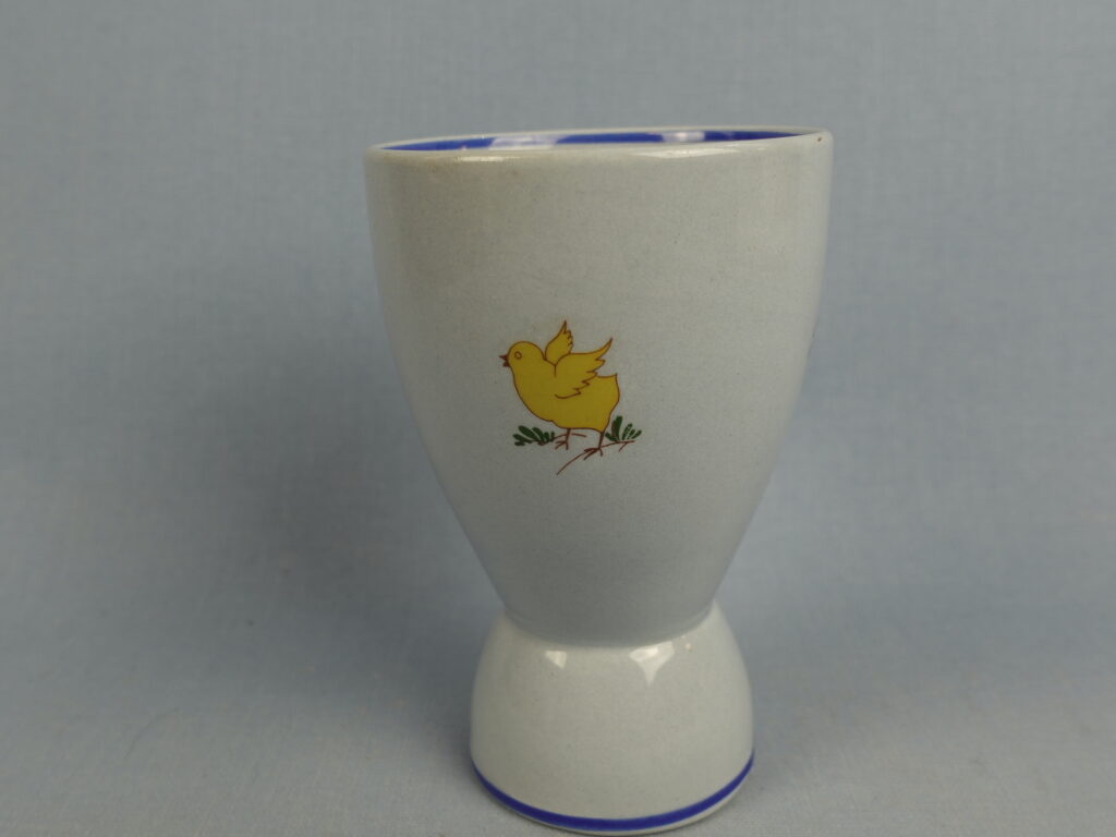 Olga Osolin Arabialle suunnittelema R-mallin sininen munakuppi/pikari pääsiäisaiheisella pupu ja tipu koristeella. Munakupin korkeus on 10,2 cm ja halkaisija 4,8 cm. Pikarin halkaisija on 7 cm ja tilavuus 24 cl. Myynnissä oleva munakuppi/pikari on ehjä ja muutenkin hyväkuntoinen.