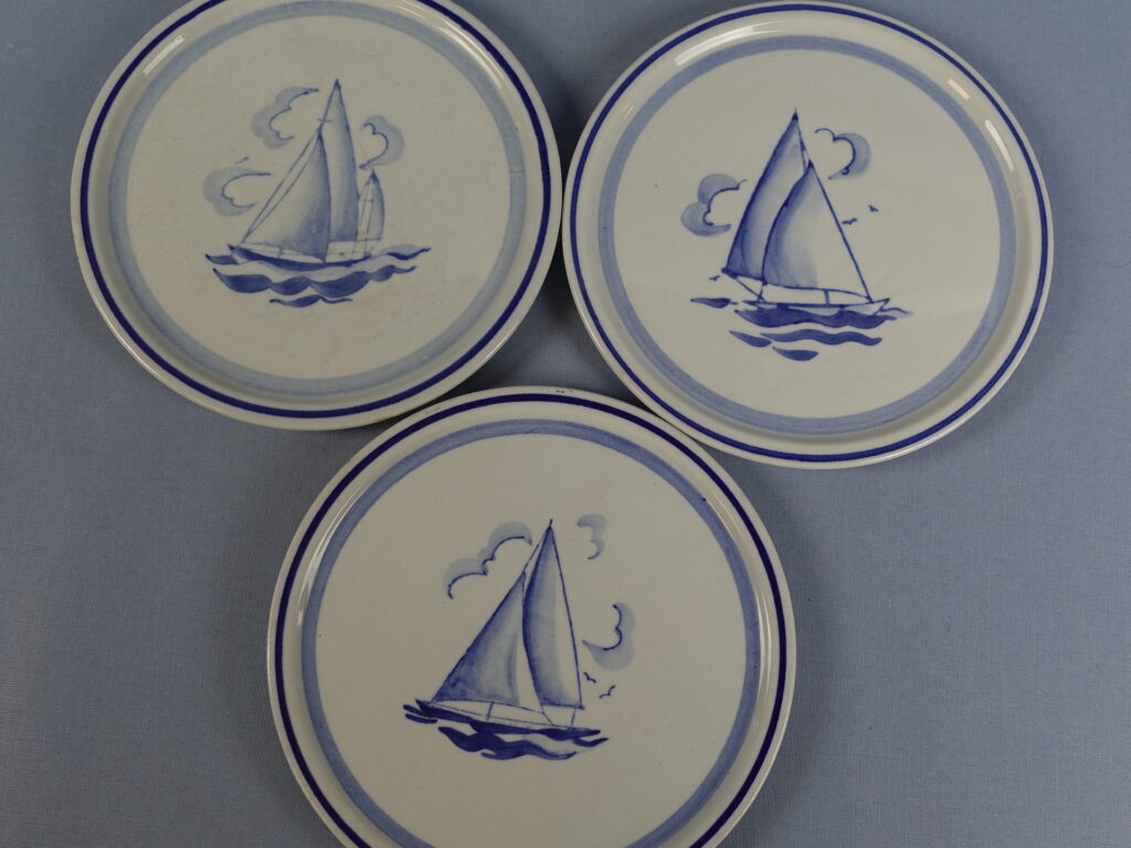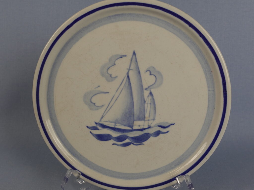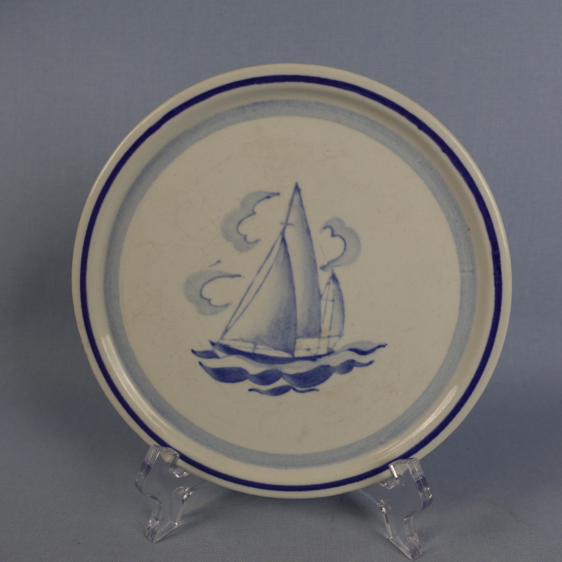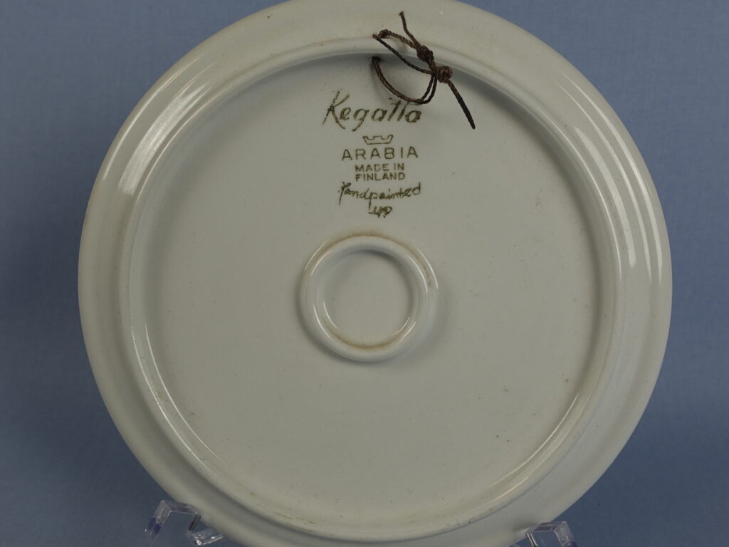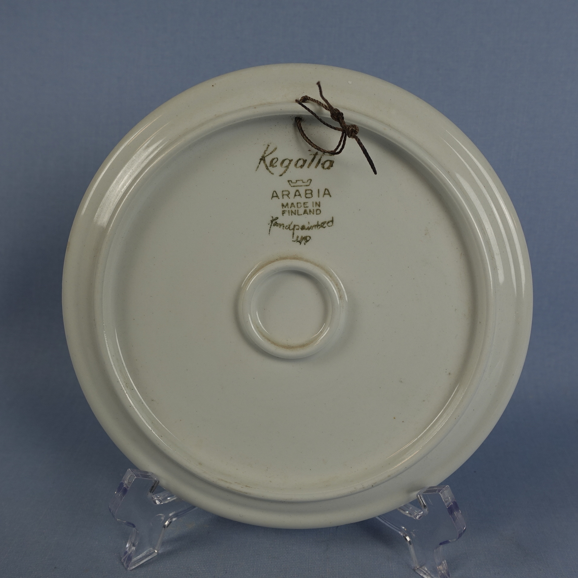Arabian valmistamat Regatta-sarjan aluset / seinälautaset. Käsinmaalattu koriste oli tuotannossa 1950-luvulla. Alustan / seinälautasen halkaisija on 16,5 cm ja korkeus 1 cm. Taustapuolella on reikä mahdollista ripustinta varten. Myynnissä olevat aluset ovat ehjiä ja muutenkin hyväkuntoisia.