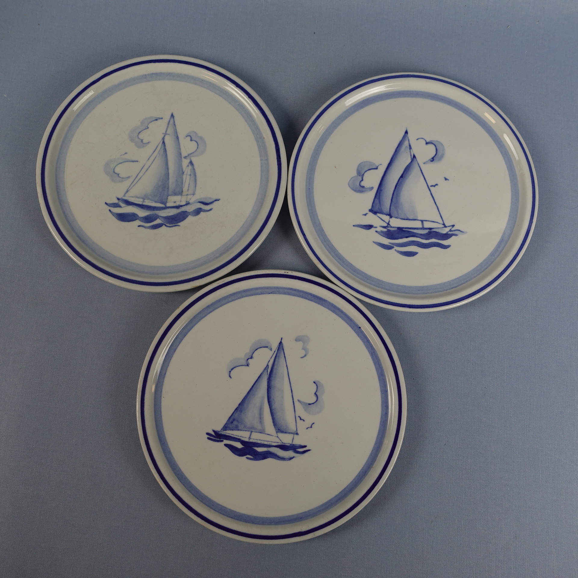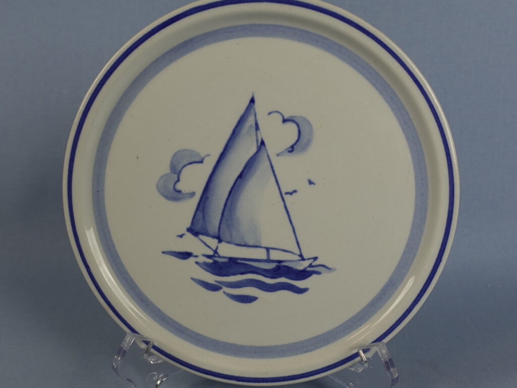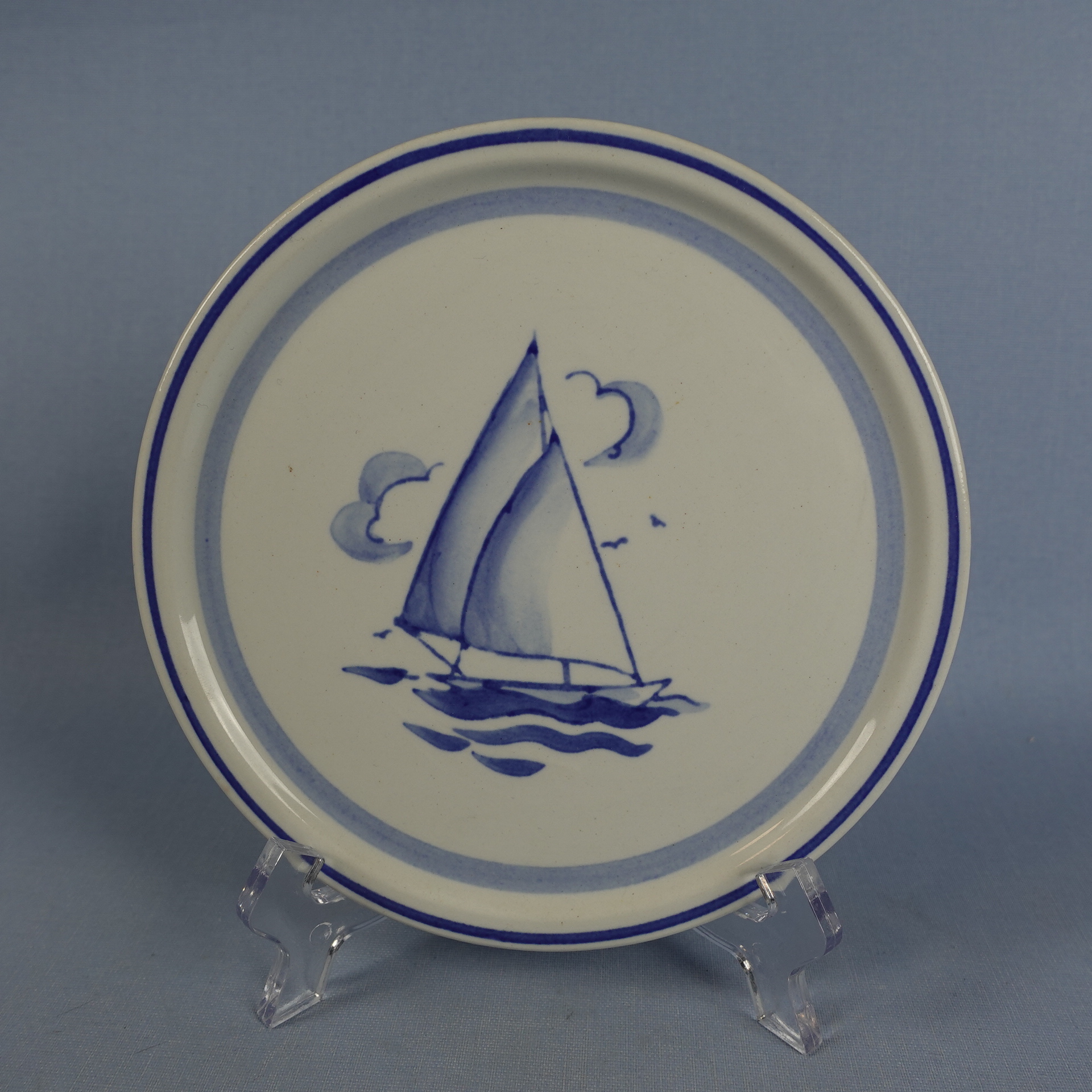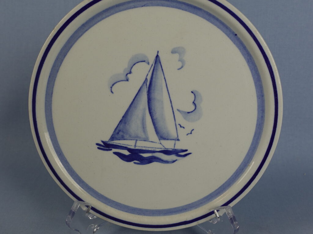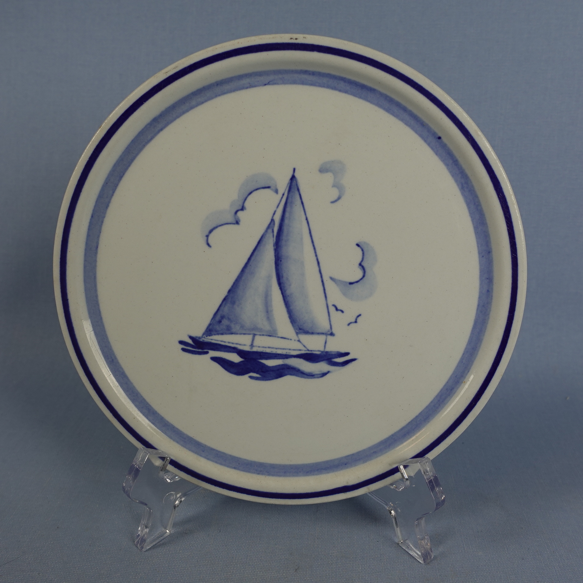 Arabian valmistamat Regatta-sarjan aluset / seinälautaset. Käsinmaalattu koriste oli tuotannossa 1950-luvulla. Alustan / seinälautasen halkaisija on 16,5 cm ja korkeus 1 cm. Taustapuolella on reikä mahdollista ripustinta varten. Myynnissä olevat aluset ovat ehjiä ja muutenkin hyväkuntoisia.