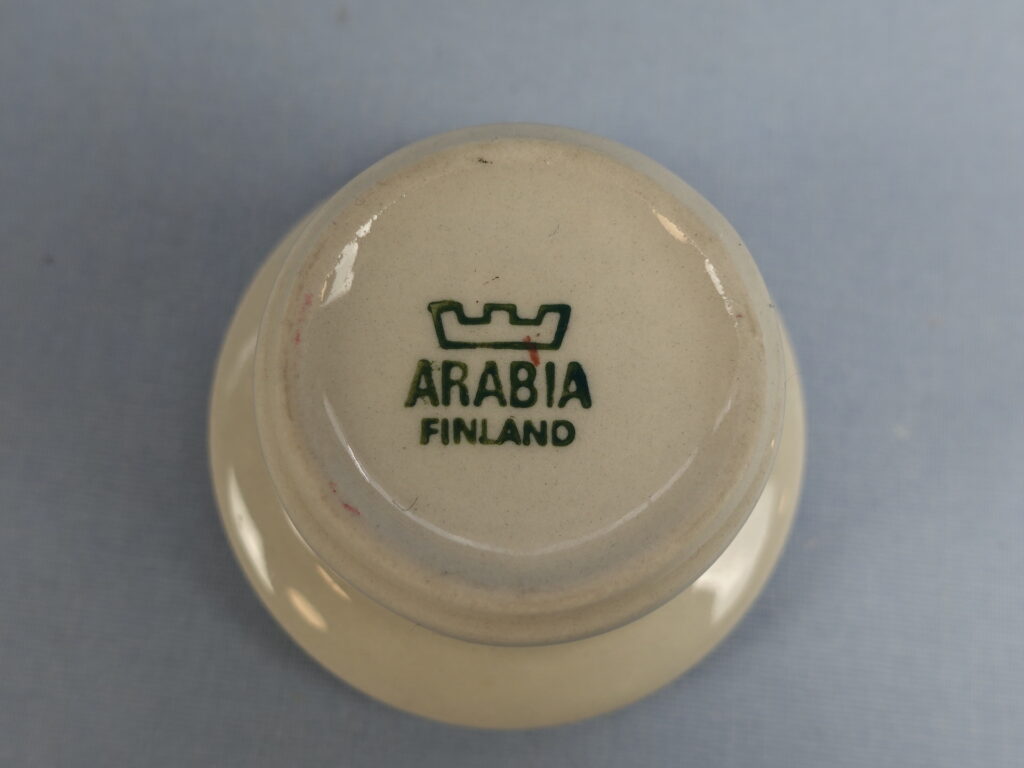 Richard Lindhin Arabialle suunnitteleman Saimaa-sarjan munakuppi. Koriste oli tuotannossa Ulla Procopén suunnittelemissa S-mallin astioissa v. 1980-85. Munakupin korkeus on 4 cm ja halkaisija 7,5 cm. Myynnissä oleva munakuppi on ehjä ja muutenkin hyväkuntoinen.