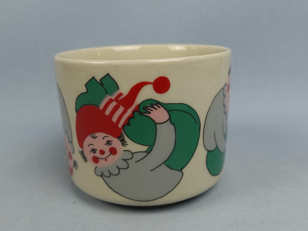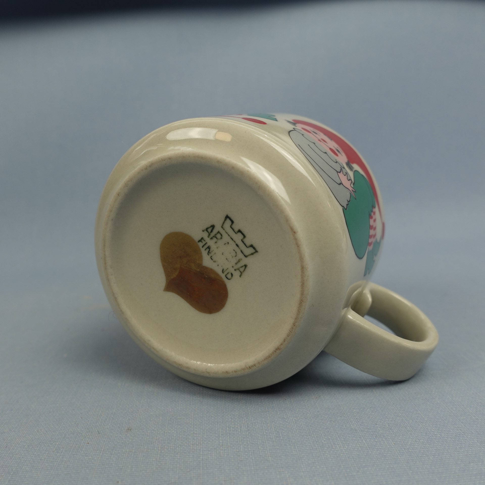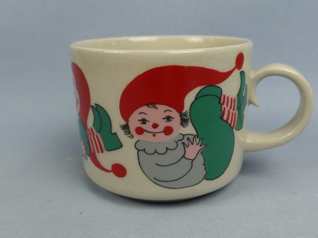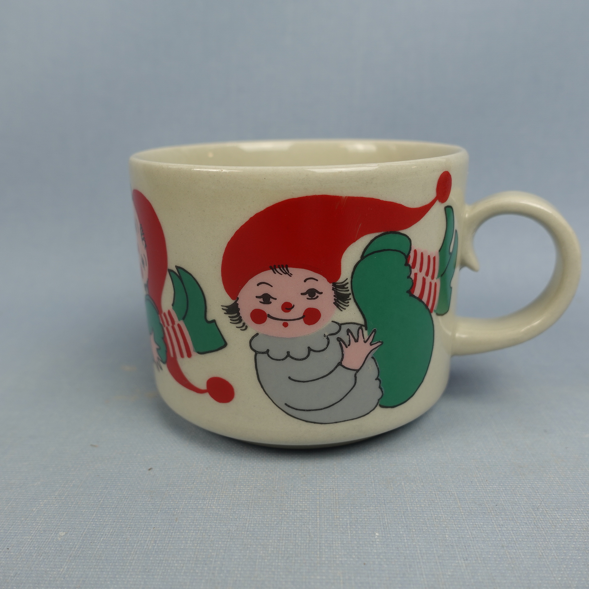 Arabian valmistama veikeä Tonttu muki 1970-luvulta. Mukin korkeus on 7 cm, halkaisija 8,5 cm ja tilavuus 28 cl. Myynnissä oleva muki on ehjä ja muutenkin hyväkuntoinen. Koristeissa ei ole naarmuja eikä kulumaa.