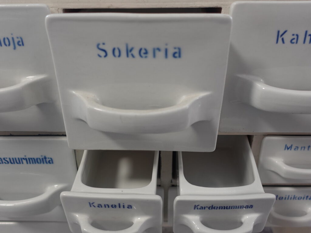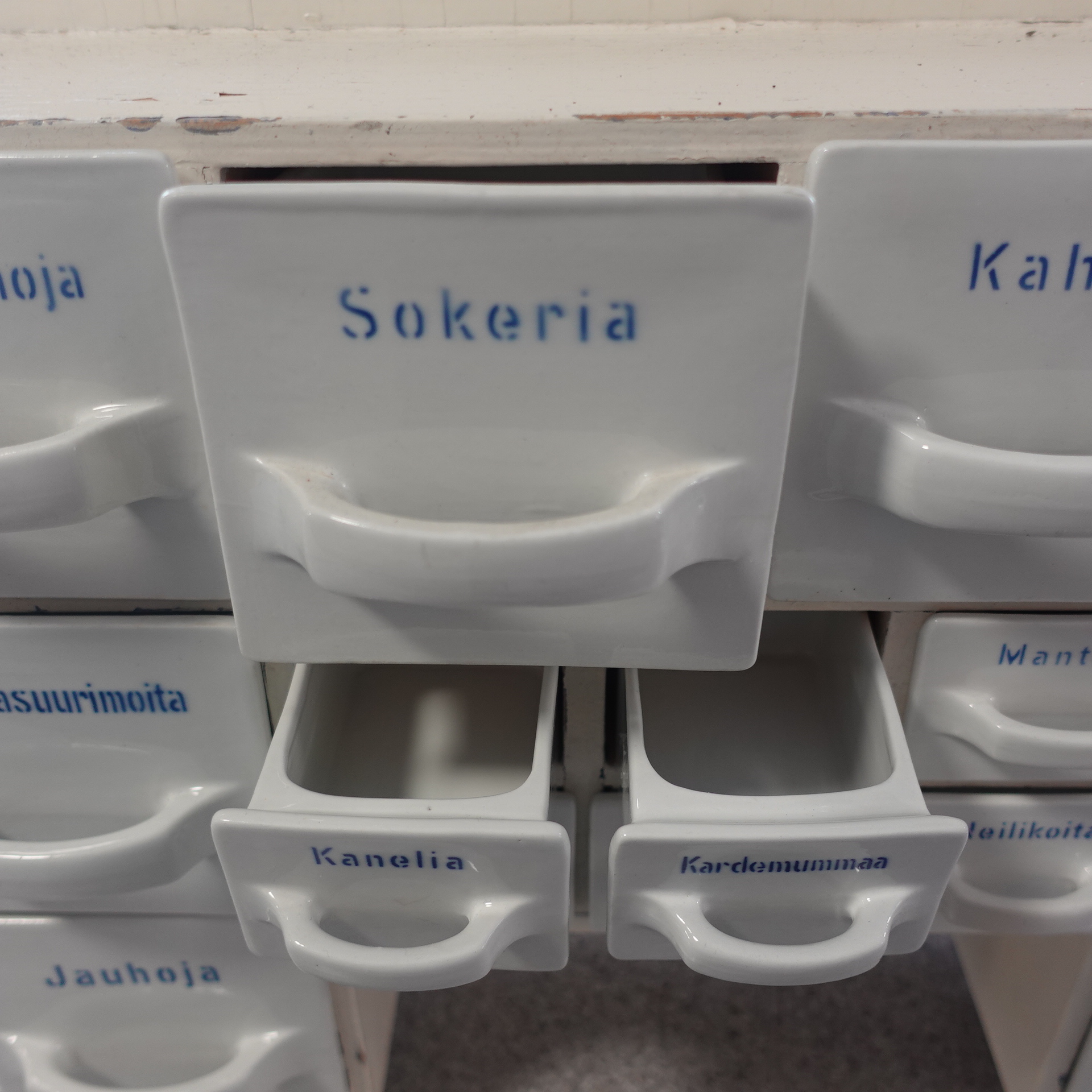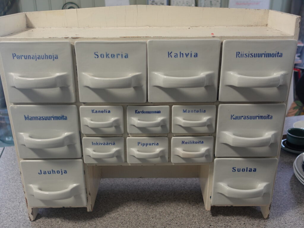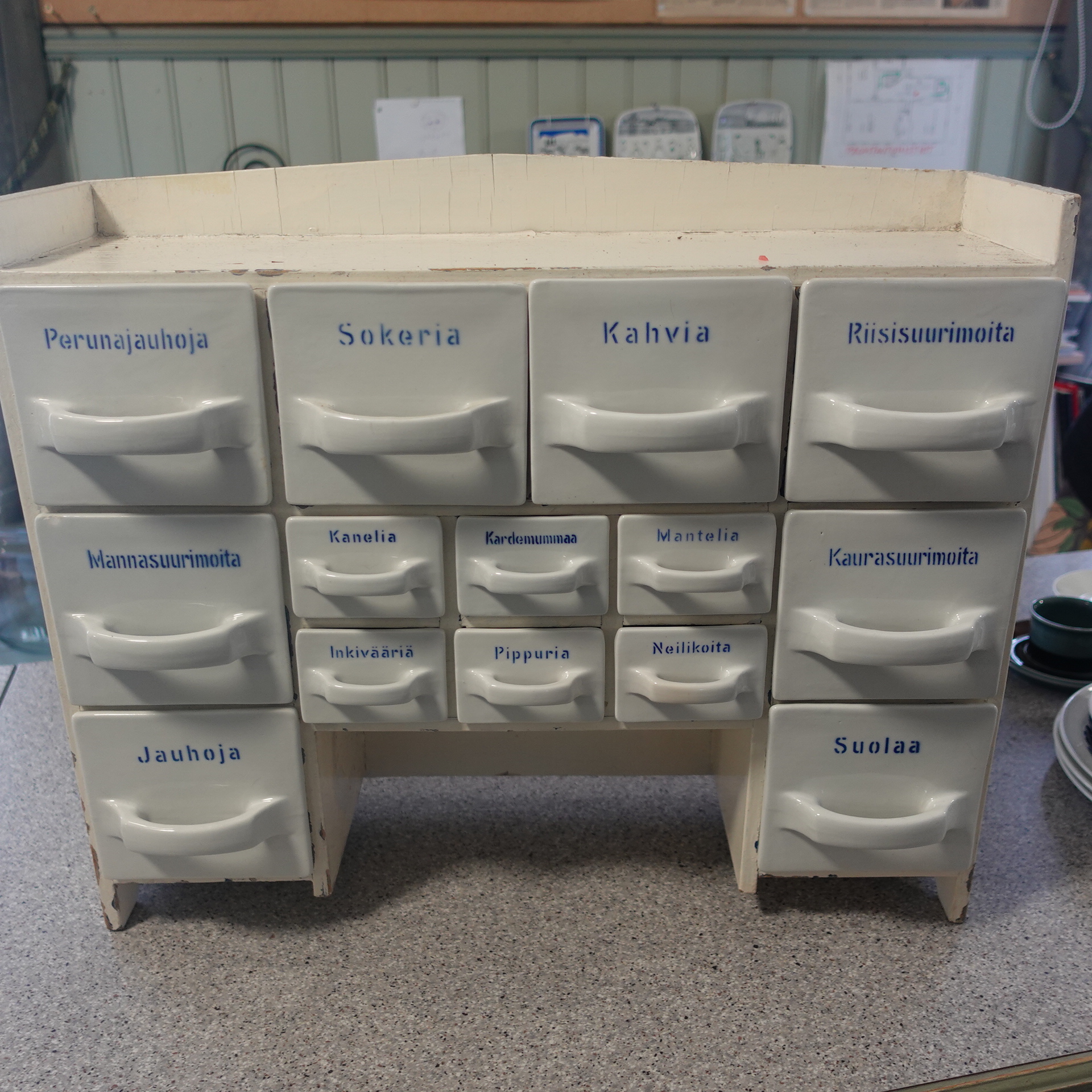 Arabia lokerikko, mausteikko. Kaikki lokerot ehjiä, paitsi Sokeria, josta takareunasta pieni pala pois(katso erillinen kuva). Lokeroissa piippuleima. Vanerikehys on maalattu jälkeenpäin, mutta ehjä.
