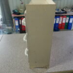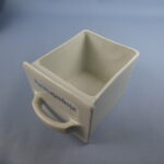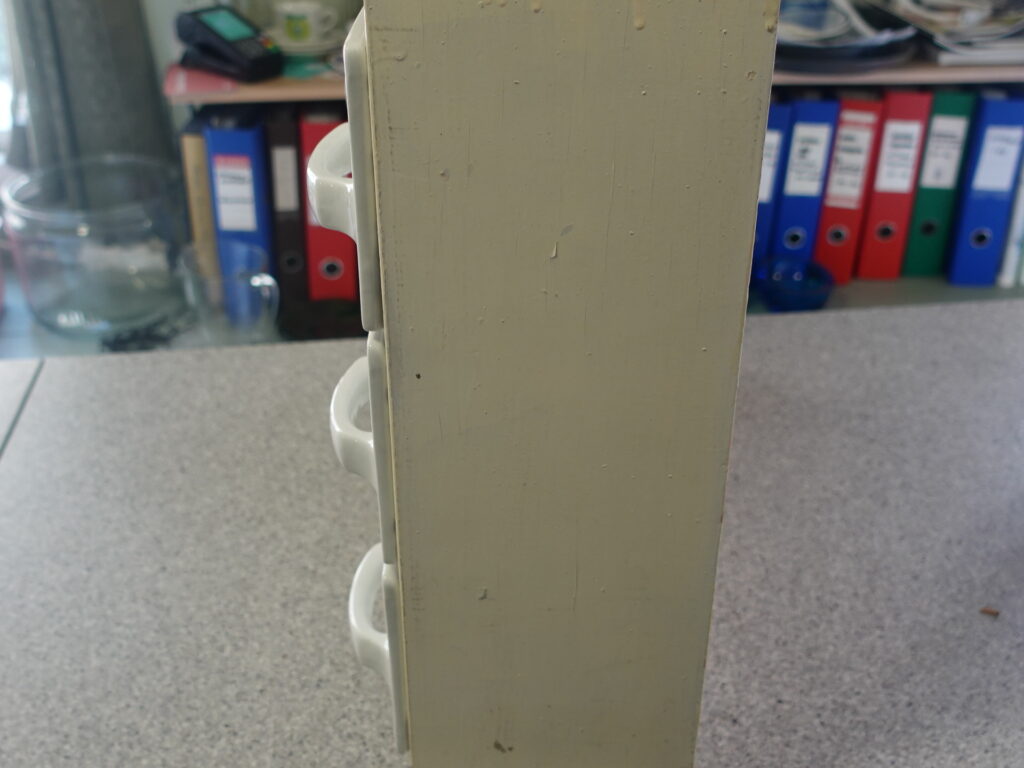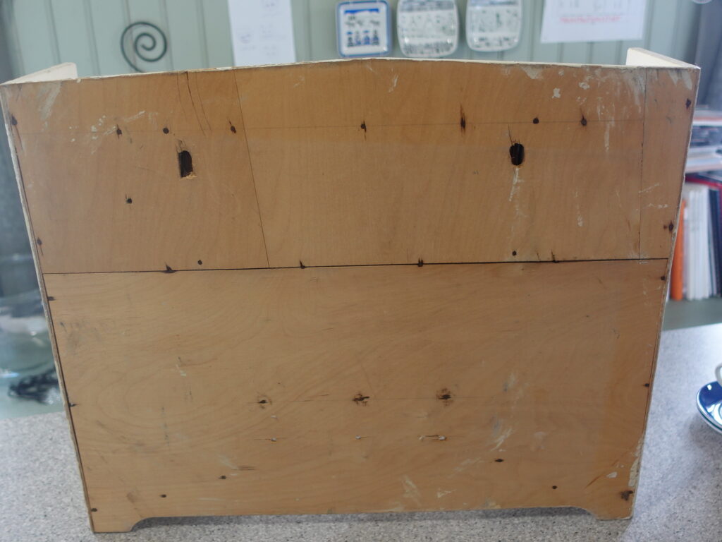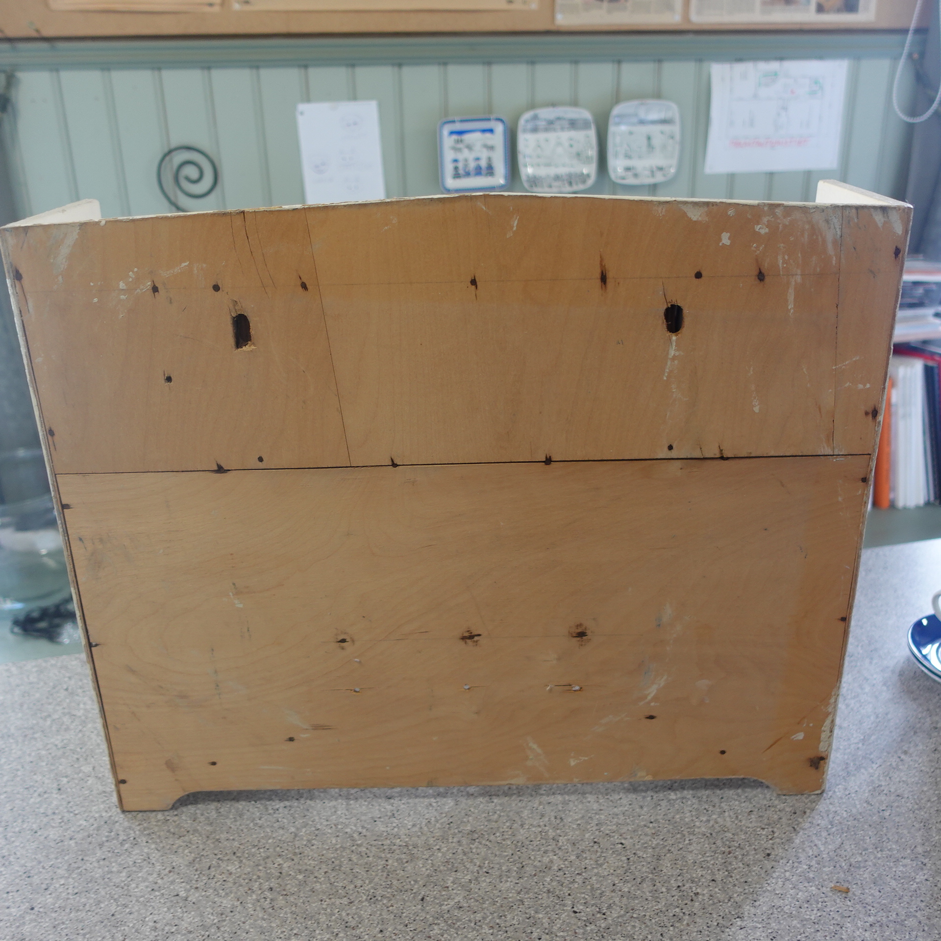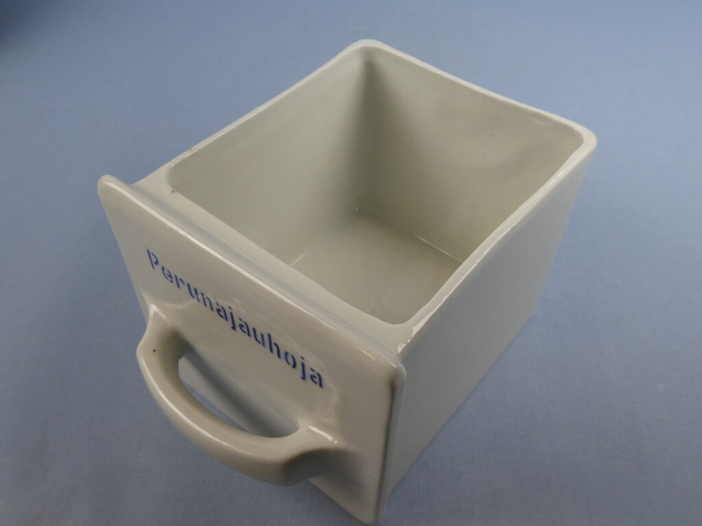 Arabia lokerikko, mausteikko. Kaikki lokerot ehjiä, paitsi Sokeria, josta takareunasta pieni pala pois(katso erillinen kuva). Lokeroissa piippuleima. Vanerikehys on maalattu jälkeenpäin, mutta ehjä.