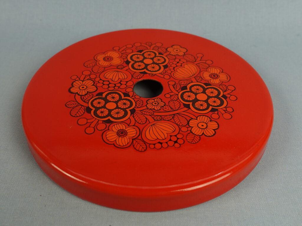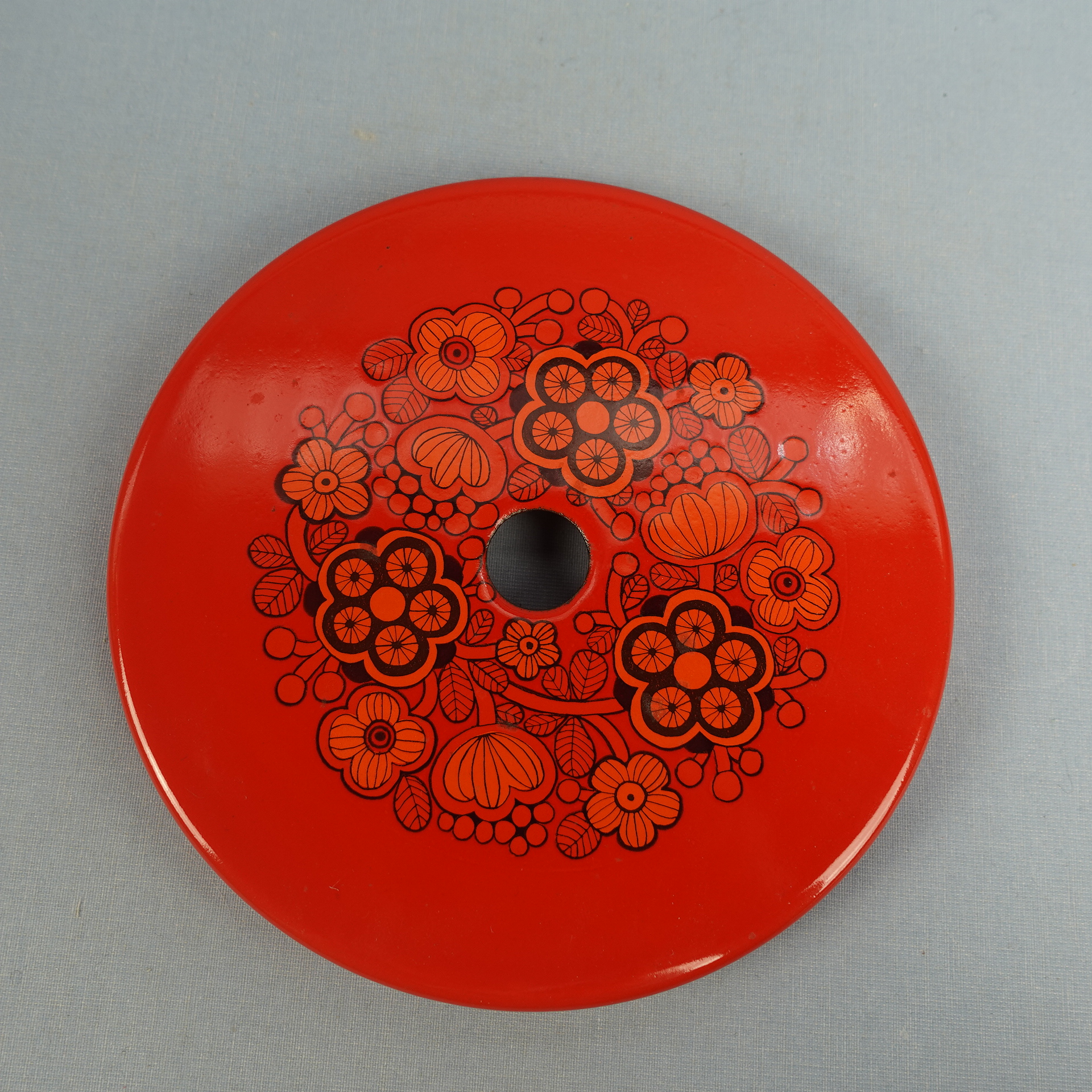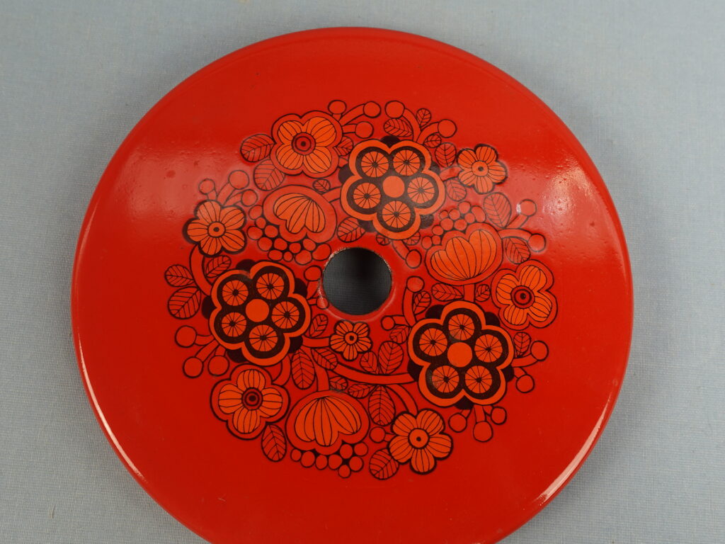 Raija Uosikkisen Finelille suunnittelema emalinen, punainen Maaret-sarjan liesilevynsuoja. Levynsuoja lienee 1970-luvun tuotantoa. Sen halkaisija on 16,5 cm ja korkeus 1,5 cm. Myynnissä oleva suoja on uudenveroisessa kunnossa.
