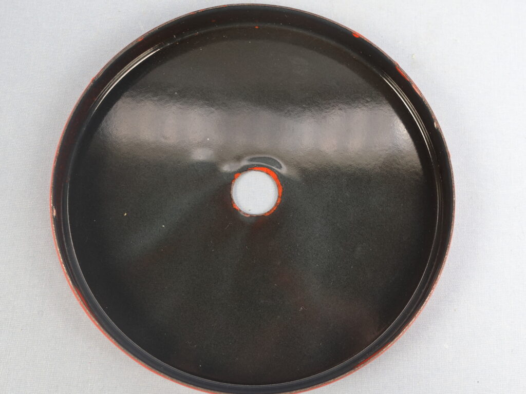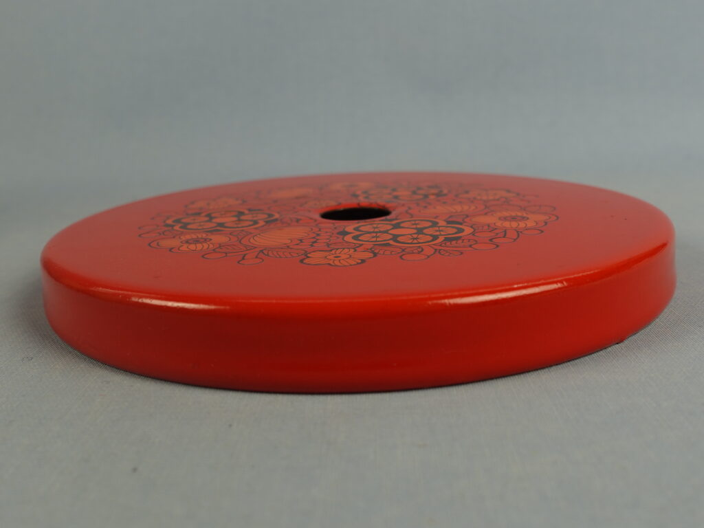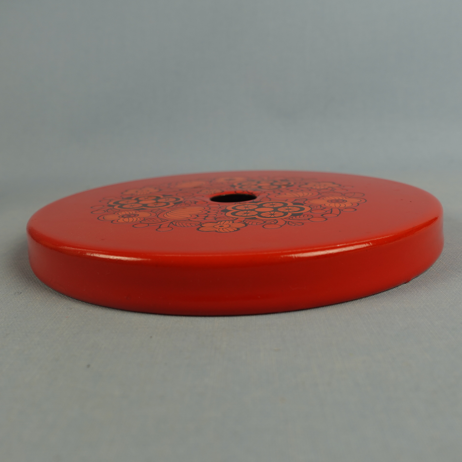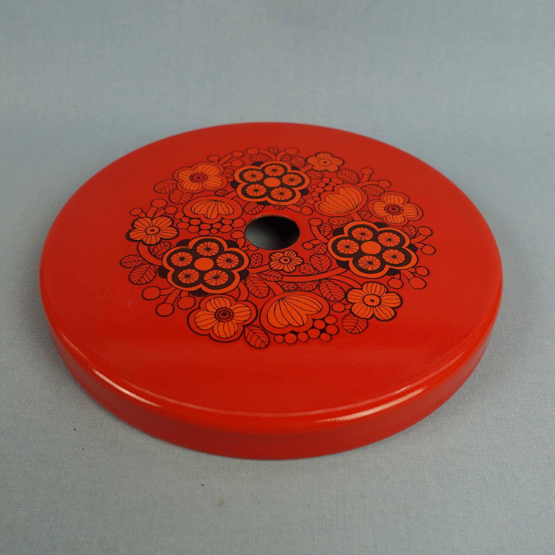 Raija Uosikkisen Finelille suunnittelema emalinen, punainen Maaret-sarjan liesilevynsuoja. Levynsuoja lienee 1970-luvun tuotantoa. Sen halkaisija on 16,5 cm ja korkeus 1,5 cm. Myynnissä oleva suoja on uudenveroisessa kunnossa.