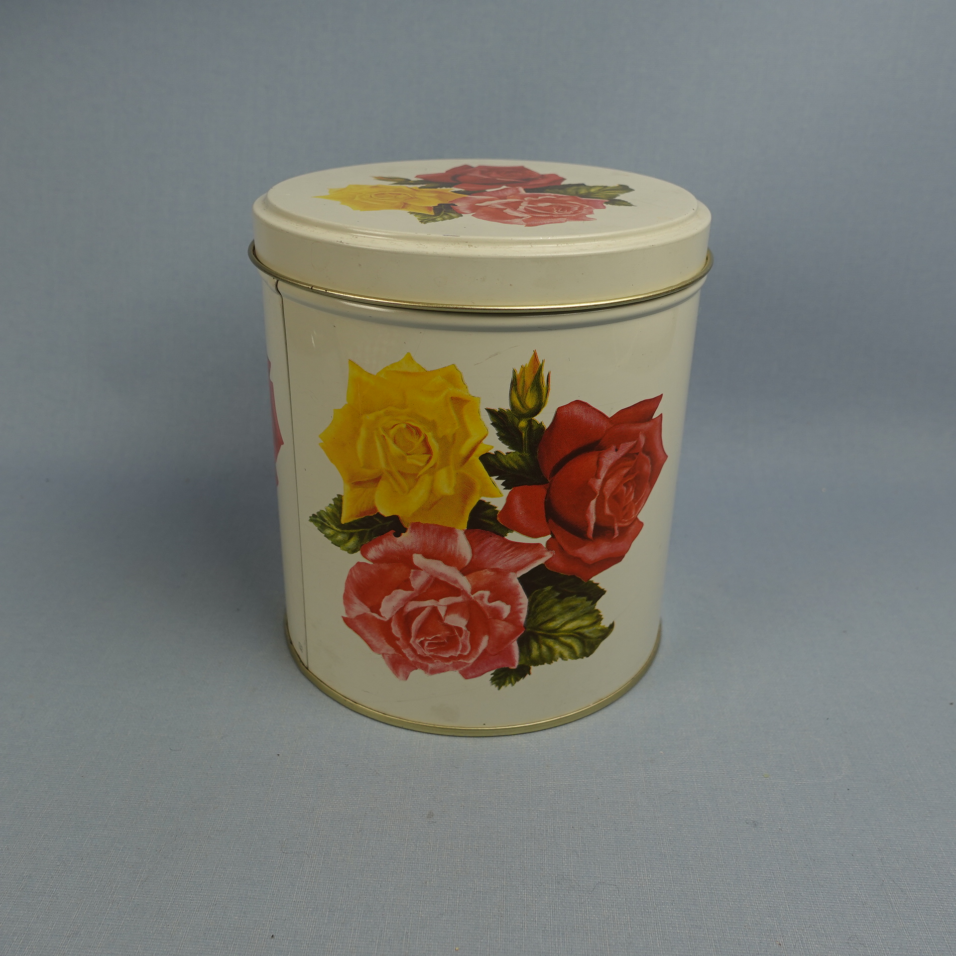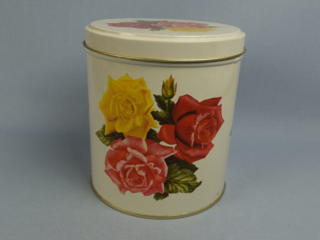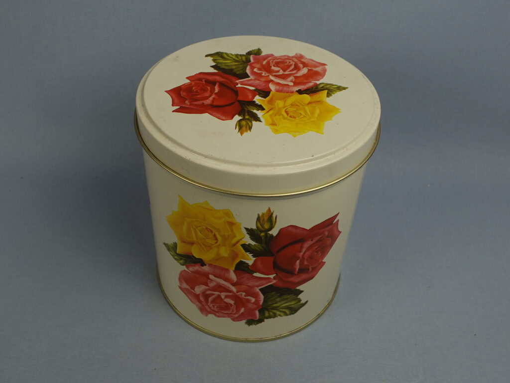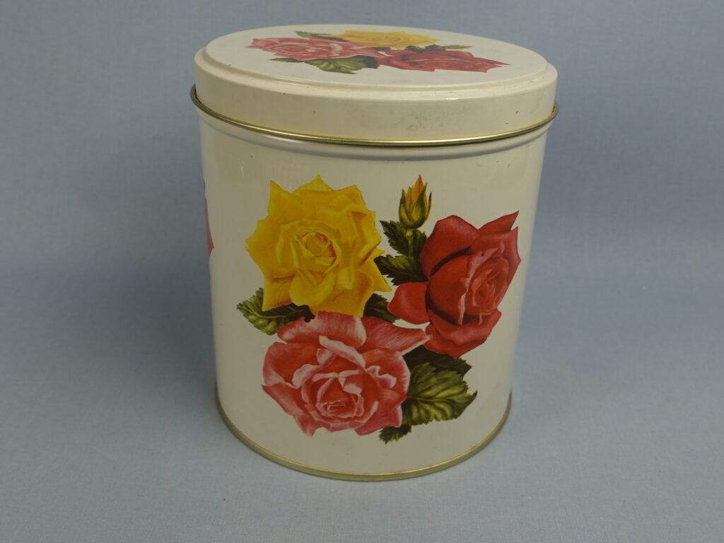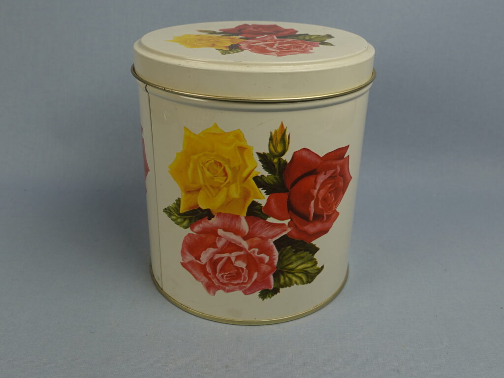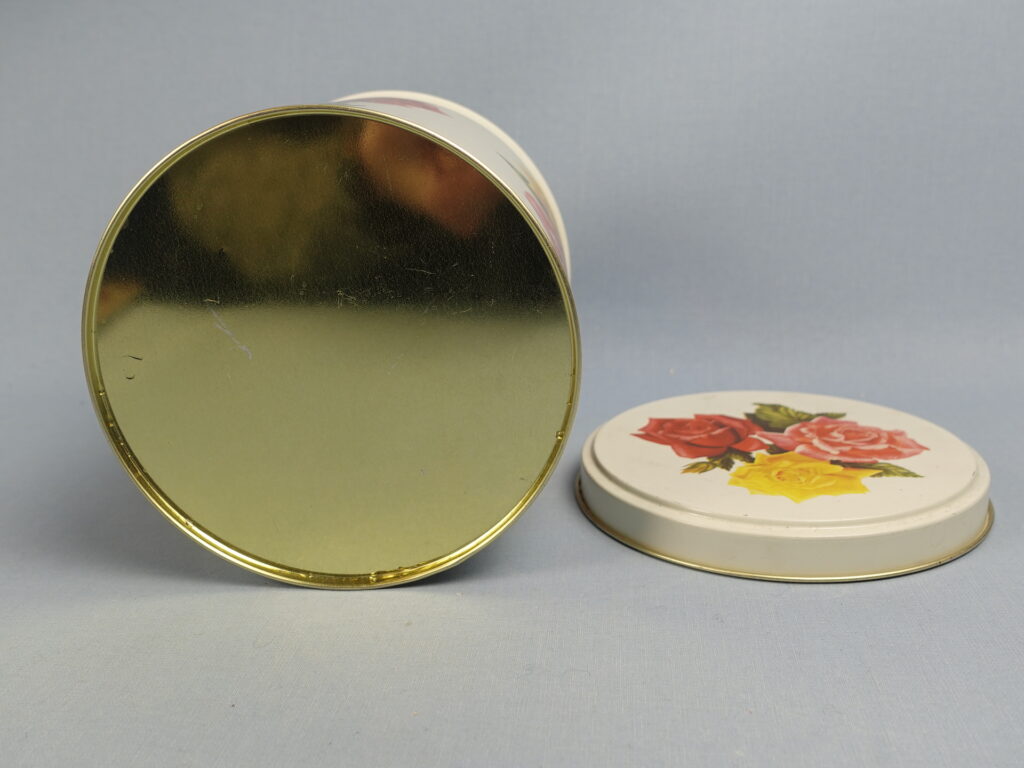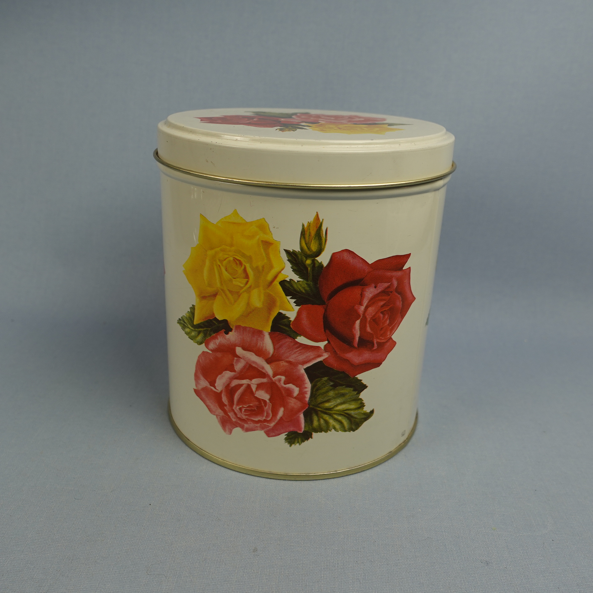 Suomalaisen GWS:n valmistama kauniilla ruusuilla koristeltu peltipurkki. Purkin korkeus on 14,5 cm ja halkaisija 13 cm. Myynnissä oleva purkki on erittäin hyväkuntoinen. Purkki on kolhuton, koristeet ovat naarmuttomat ja purkin sisäpinta on kiiltävä.