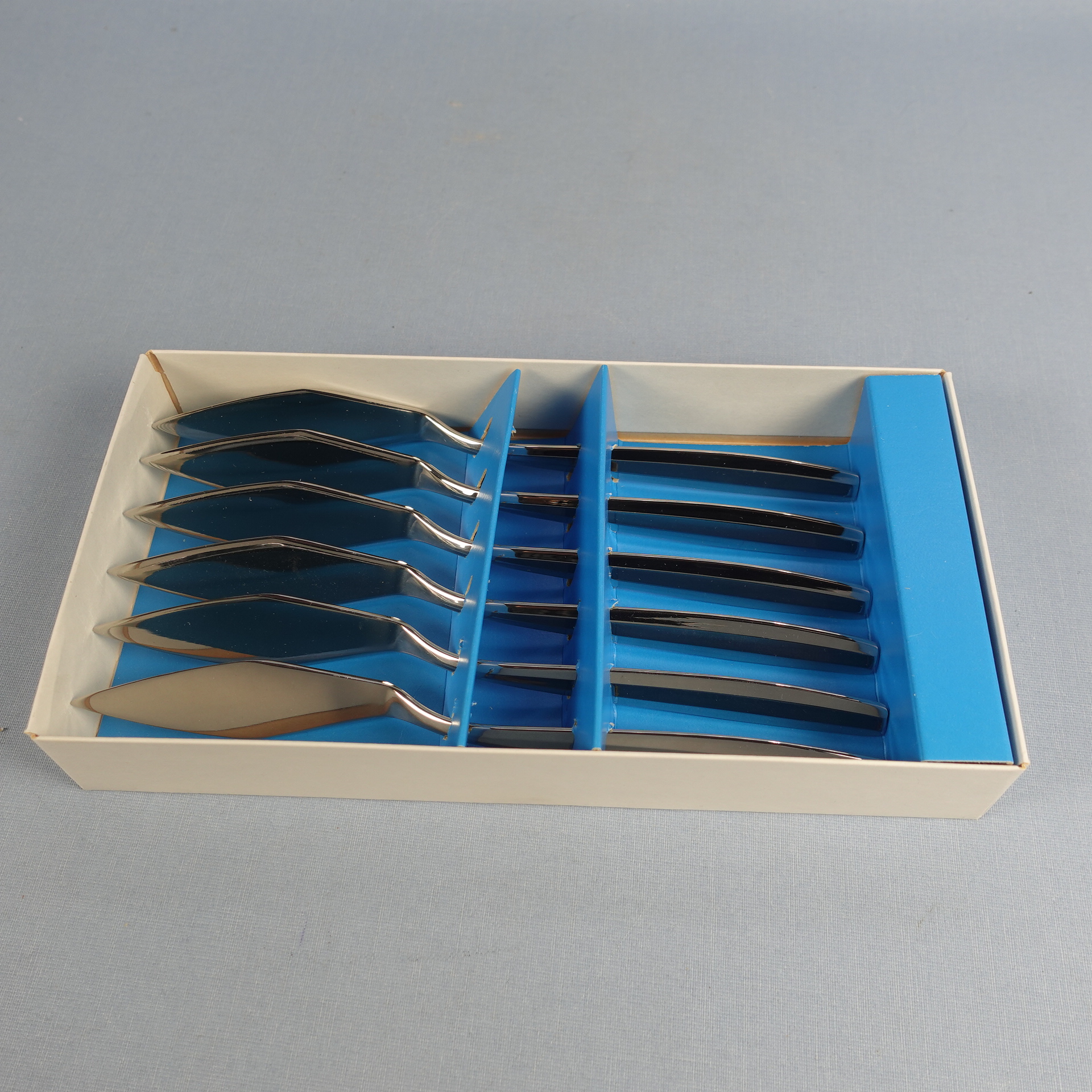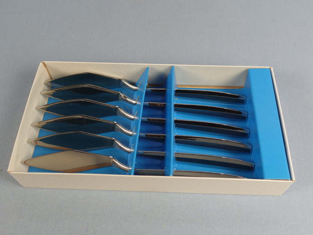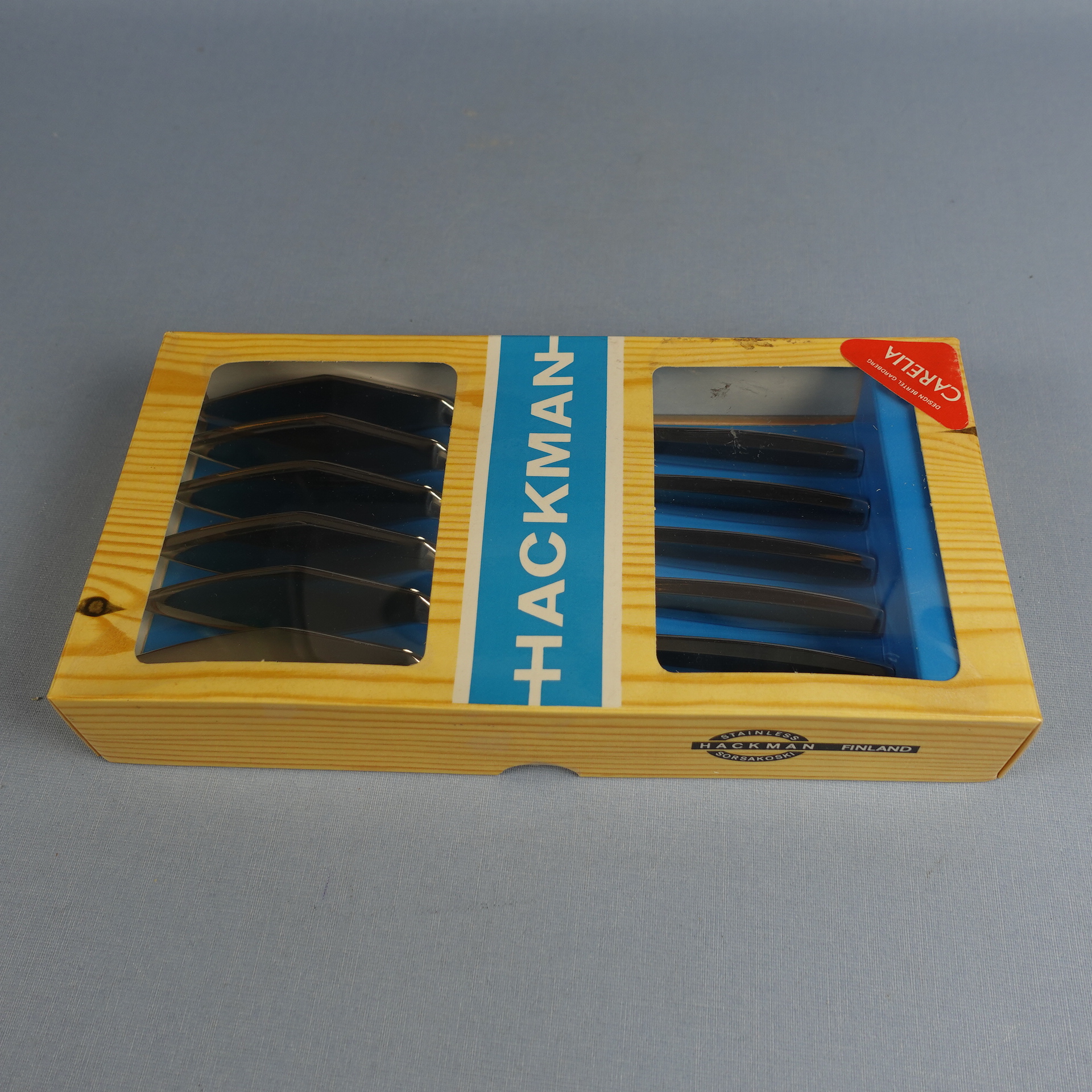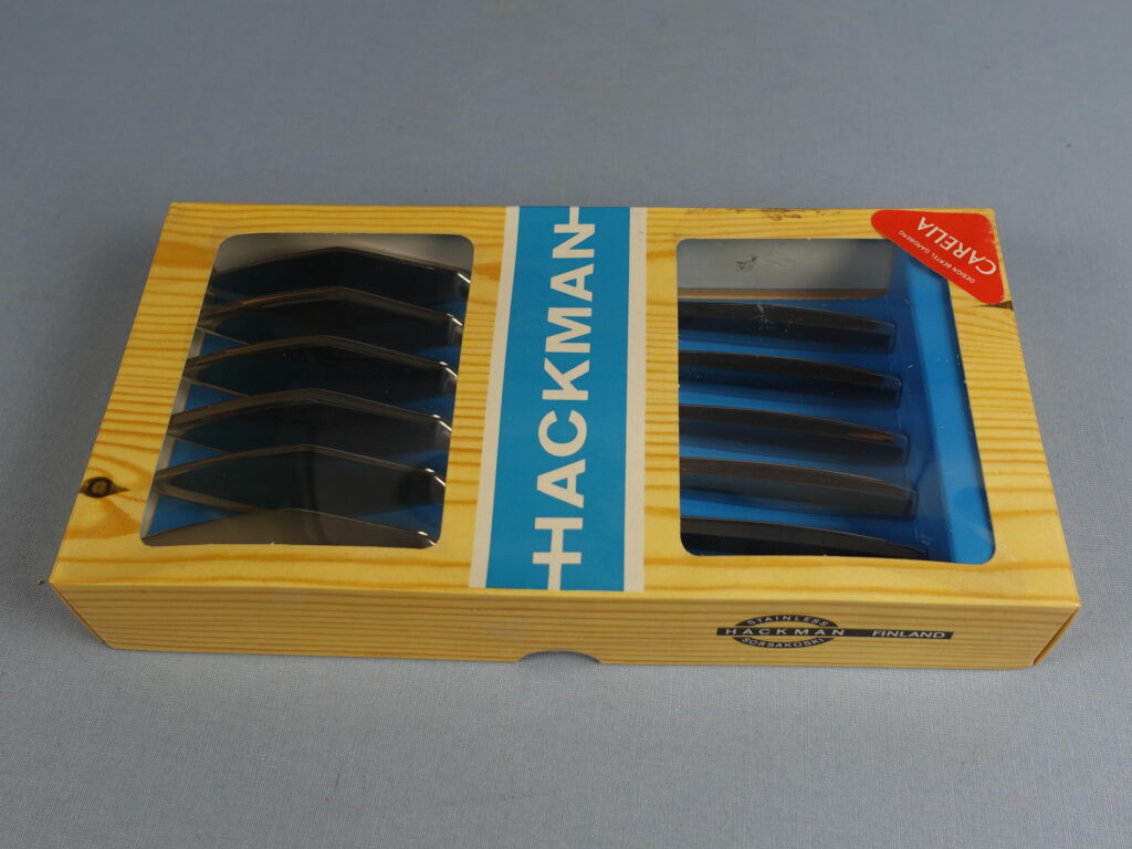 Bertel Gardbergin Hackmanille suunnitteleman Carelia-sarjan kalaveitset. Veitset on valmistettu ruostumattomasta teräksestä ja niiden pituus on 20 cm. Myynnissä olevat veitset ovat käyttämättömiä ja ne ovat alkuperäisessä myyntipakkauksessa.