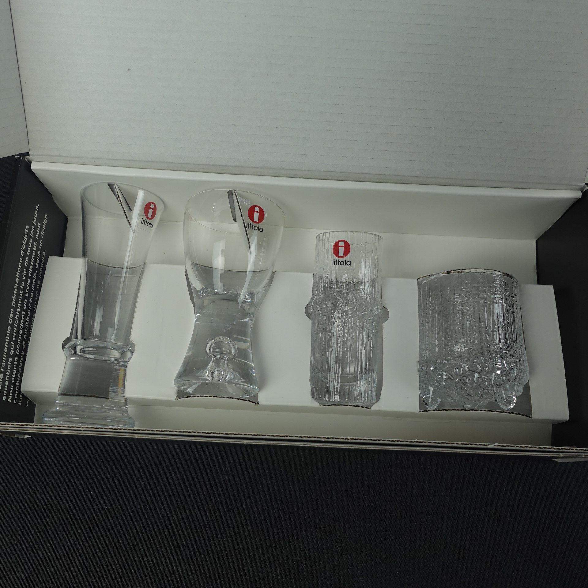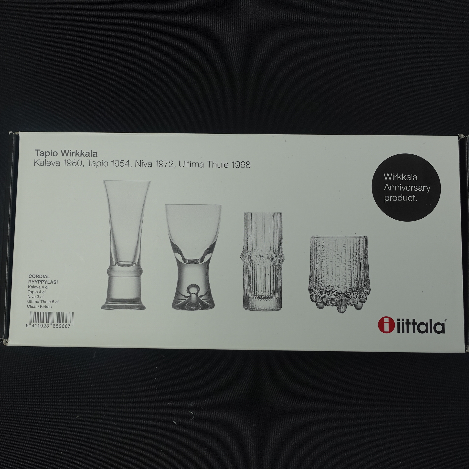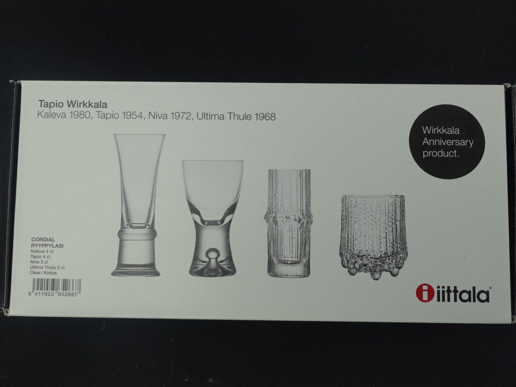 Tapio Wirkkalan Iittalalle suunnittelemien snapsilasien 4 kpl setti alkuperäisessä myyntipakkauksessa. Setti oli myynnissä v. 2015, jolloin oli kulunut 100 vuotta Wirkkalan syntymästä. Setti sisältää Wirkkalan suunnittelemat snapsilasit pitkän uran neljältä eri vuosikymmeniltä: Tapio (1954), Ultima Thule (1968), Niva (1972) ja Kaleva (1980). Myynnissä oleva setti on käyttämätön ja uutta vastaavassa kunnossa.