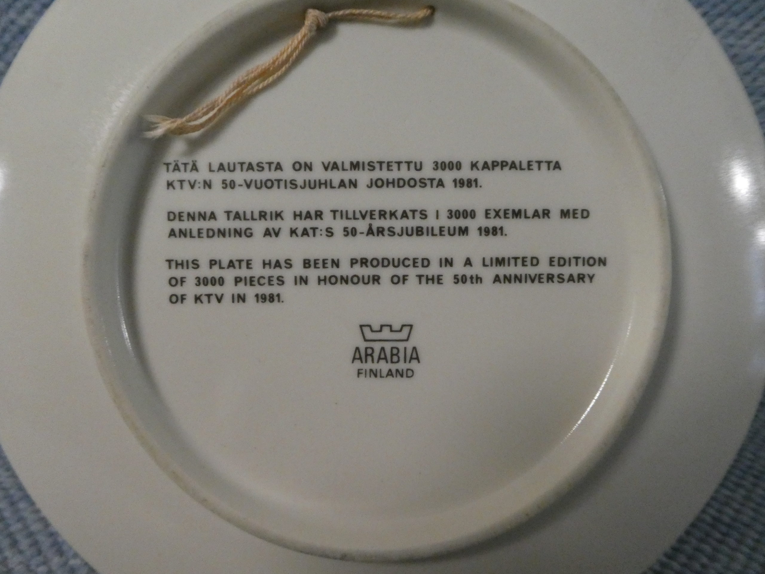 Arabia KTV:n 50-vuotisjuhla seinälautanen, v.1981. Lautasen halkasija 20 cm. Koriste Raija Uosikkinen. Seinälautanen on ehjä ja muutenkin hyväkuntoinen.