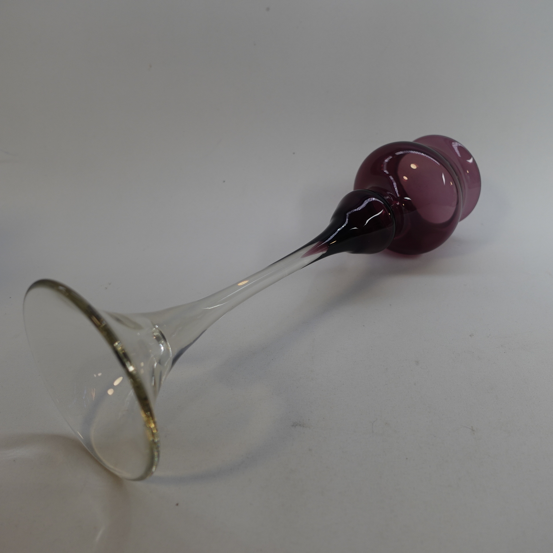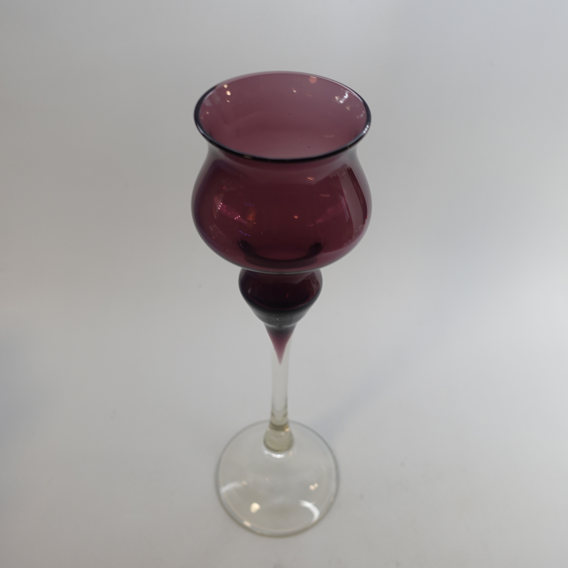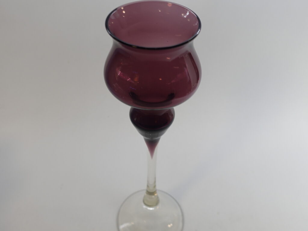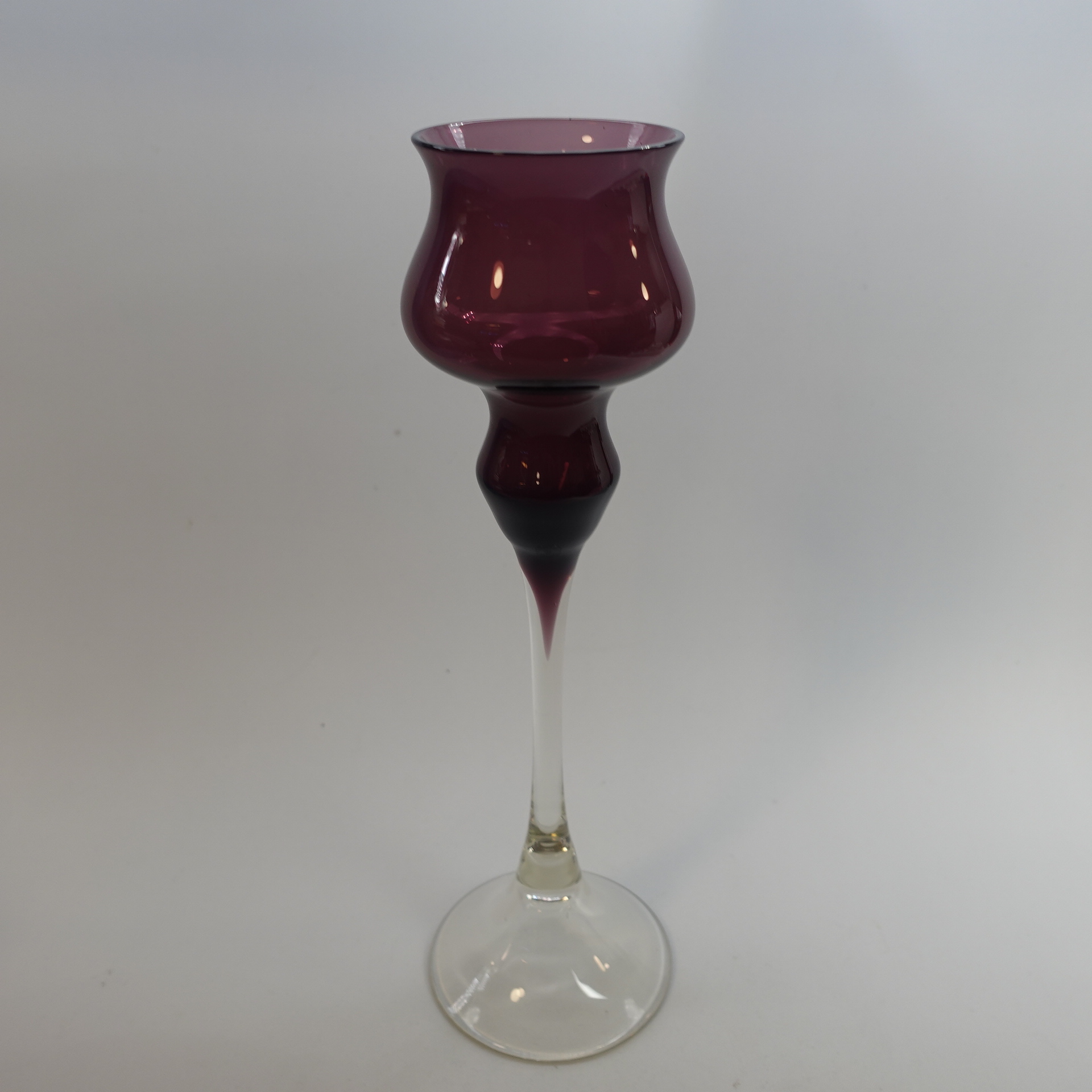 Marjut Kumelan Kumela Oy:lle suunnittelema lila / kirkas kynttilänjalka. Kynttilänjalka oli tuotannossa 1960/-70-luvulla. Kynttilänjalan korkeus on 26,5 cm. Myynnissä oleva kynttilänjalka on ehjä ja muutenkin hyväkuntoinen.