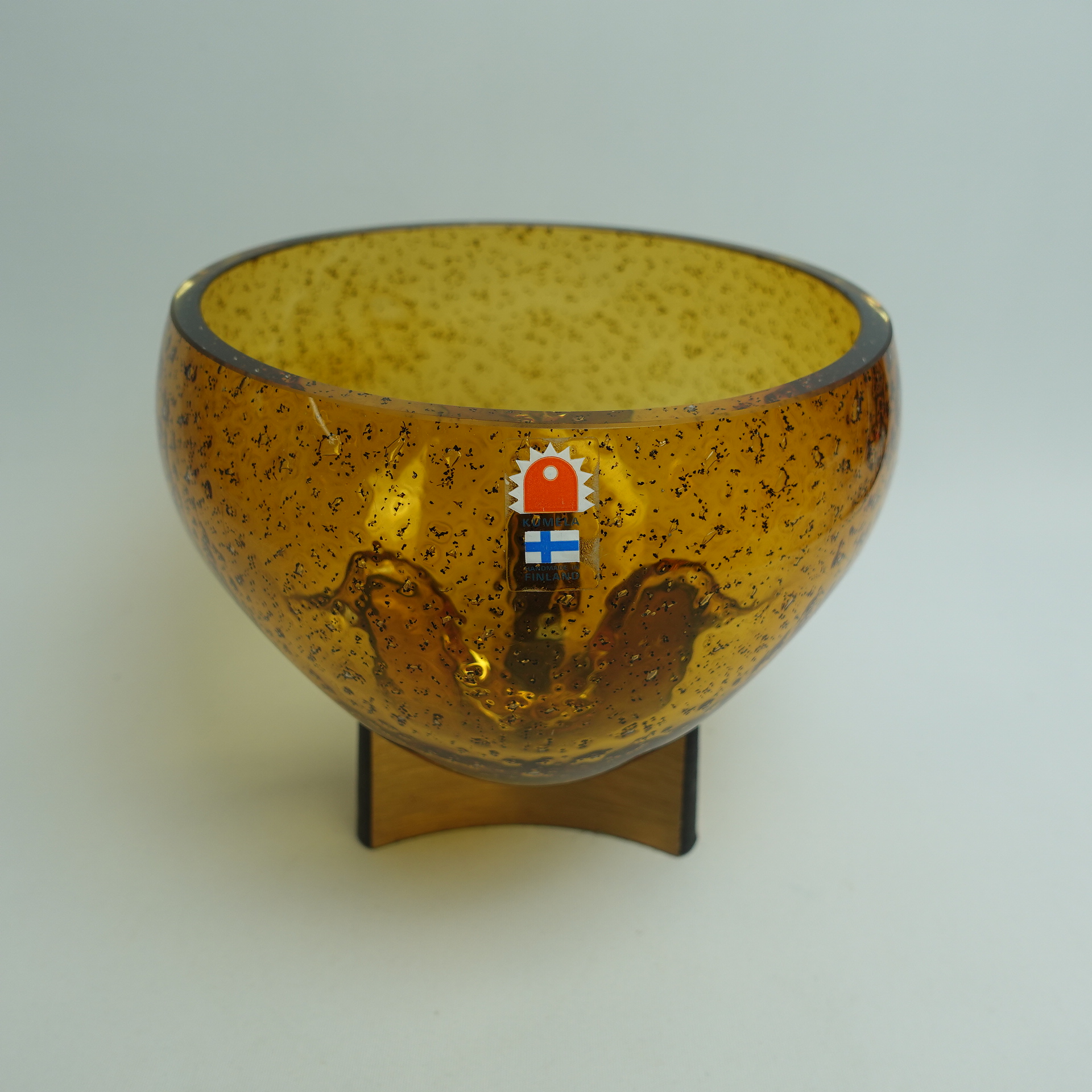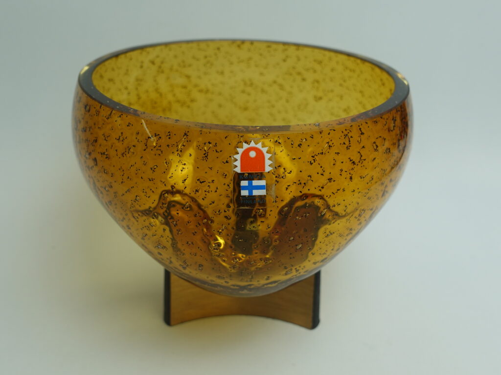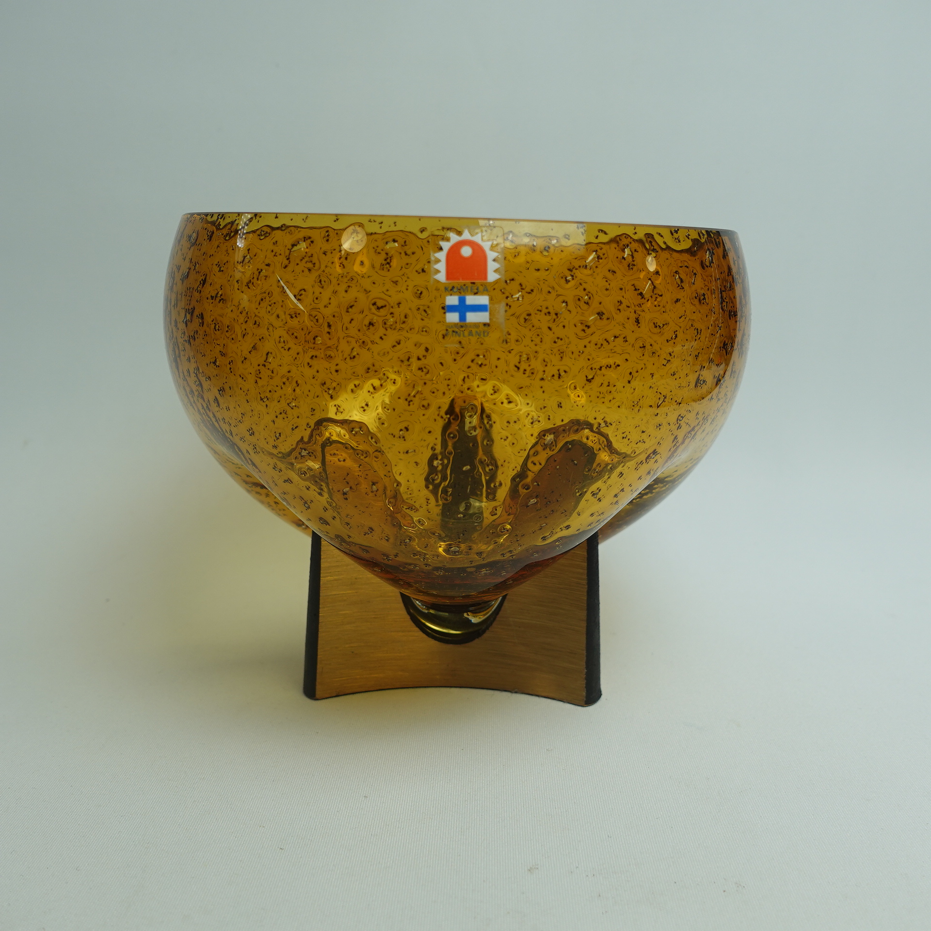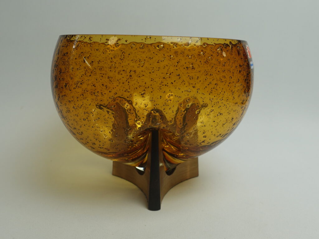 Kumelan/Humppilan lasi valmistama ruskea taidelasimalja Karl Laineen suunnittelemalla jykevällä pronssijalalla. Malja lienee 1970/-80-luvun tuotantoa. Maljan korkeus jalan kanssa 13,5cm ja halkaisija 15,5 cm. Myynnissä oleva malja on ehjä ja muutenkin hyväkuntoinen.