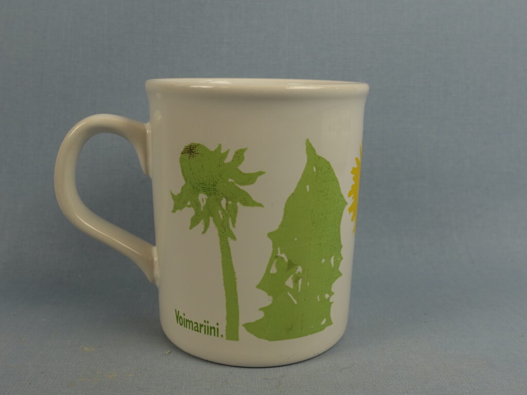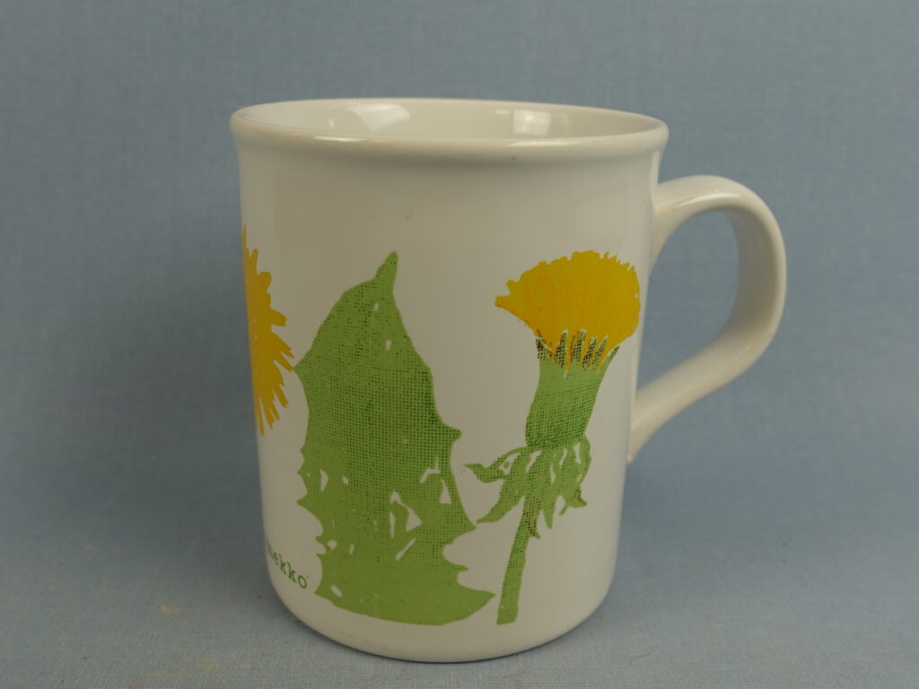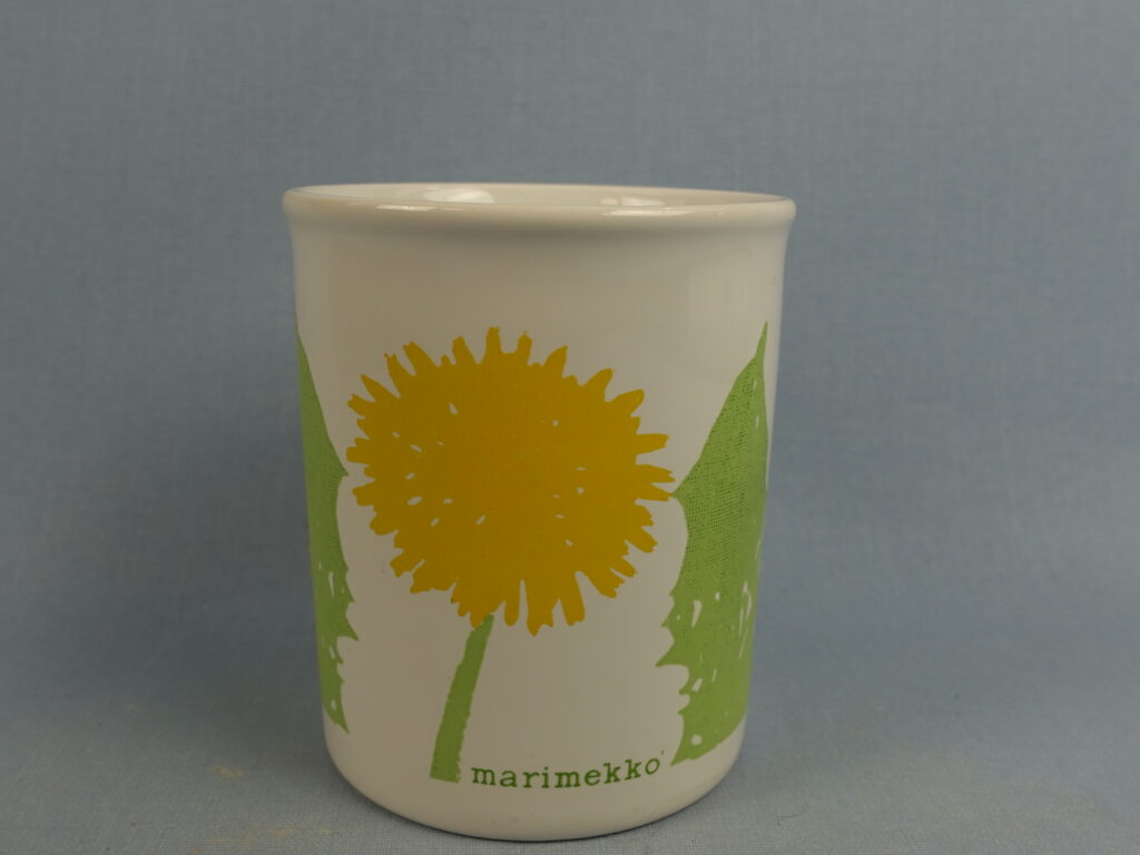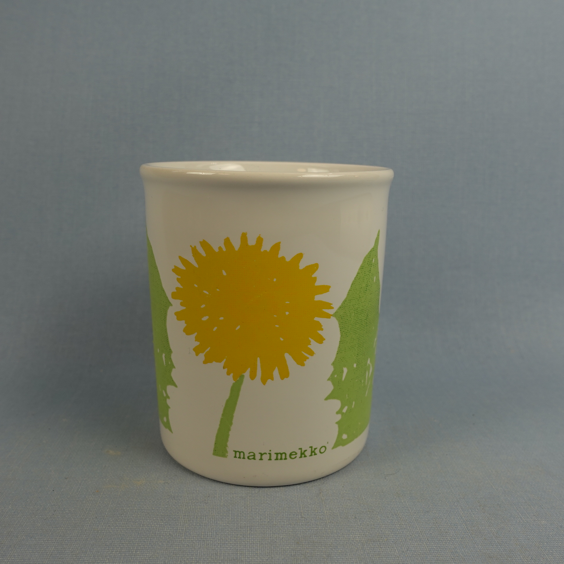 Marimekon valmistuttama Voikukka muki 1990-luvulta. Muki on valmistettu Englannissa. Mukin korkeus on 9,6 cm, halkaisija 8 cm ja tilavuus 30 cl. Myynnissä oleva muki on ehjä ja muutenkin hyväkuntoinen.