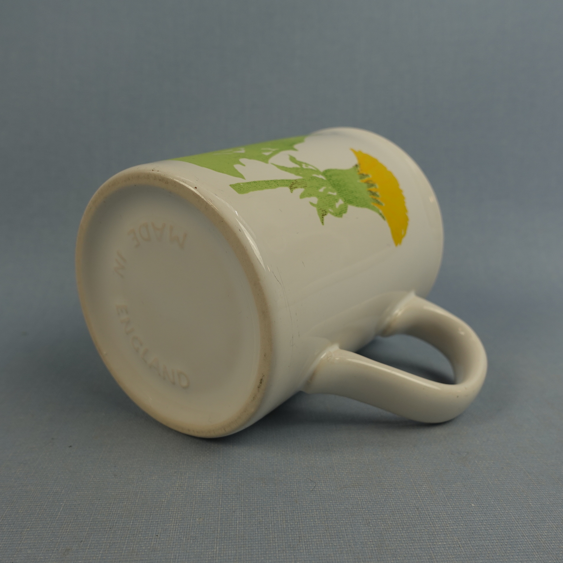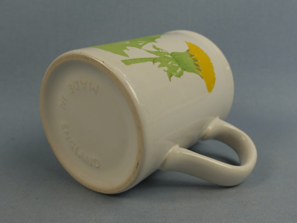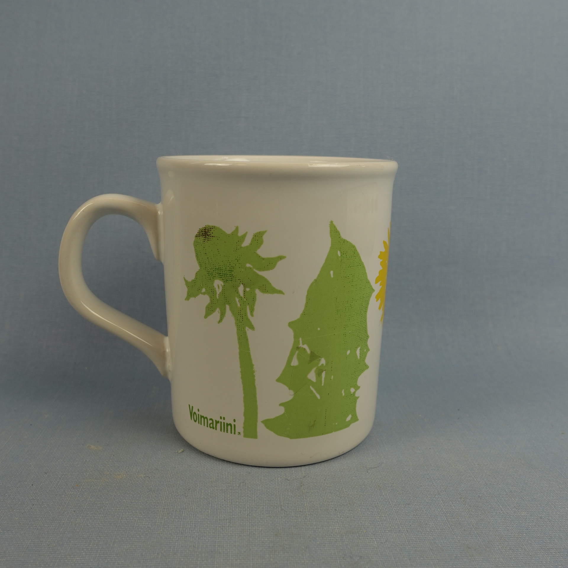Marimekon valmistuttama Voikukka muki 1990-luvulta. Muki on valmistettu Englannissa. Mukin korkeus on 9,6 cm, halkaisija 8 cm ja tilavuus 30 cl. Myynnissä oleva muki on ehjä ja muutenkin hyväkuntoinen.