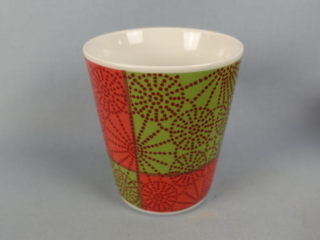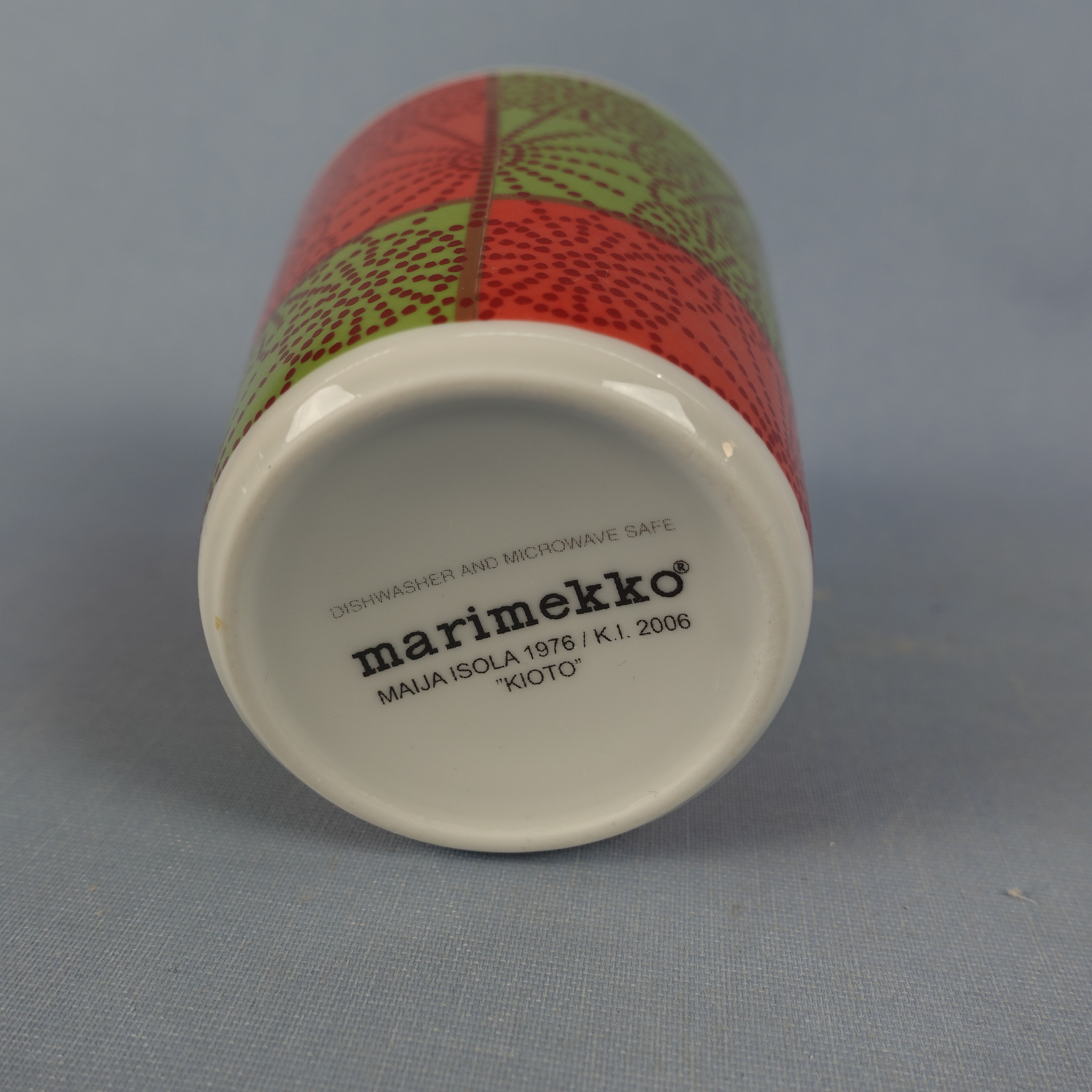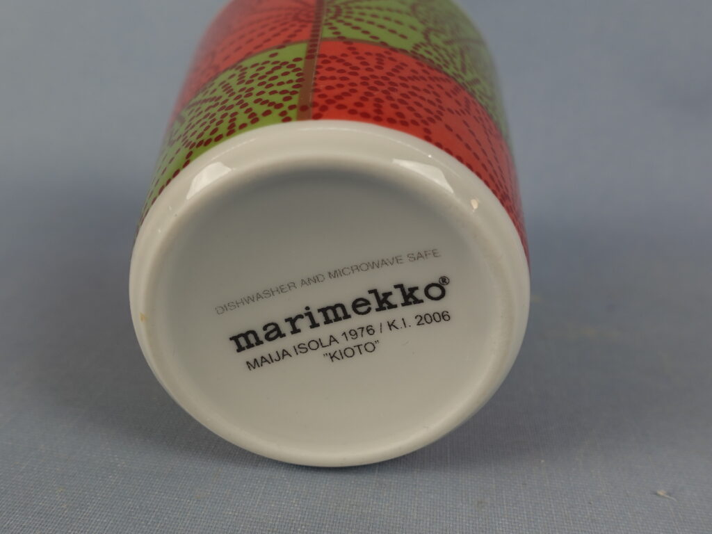 Marimekko Kioto muki. Maija Isola 1976 / K.I 2006 . Korkeus 9,5 cm ja halkaisija 8,5 cm. Muki on ehjä ja muutenkin hyväkuntoinen.