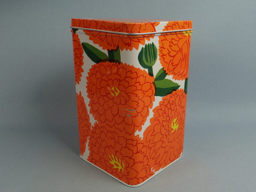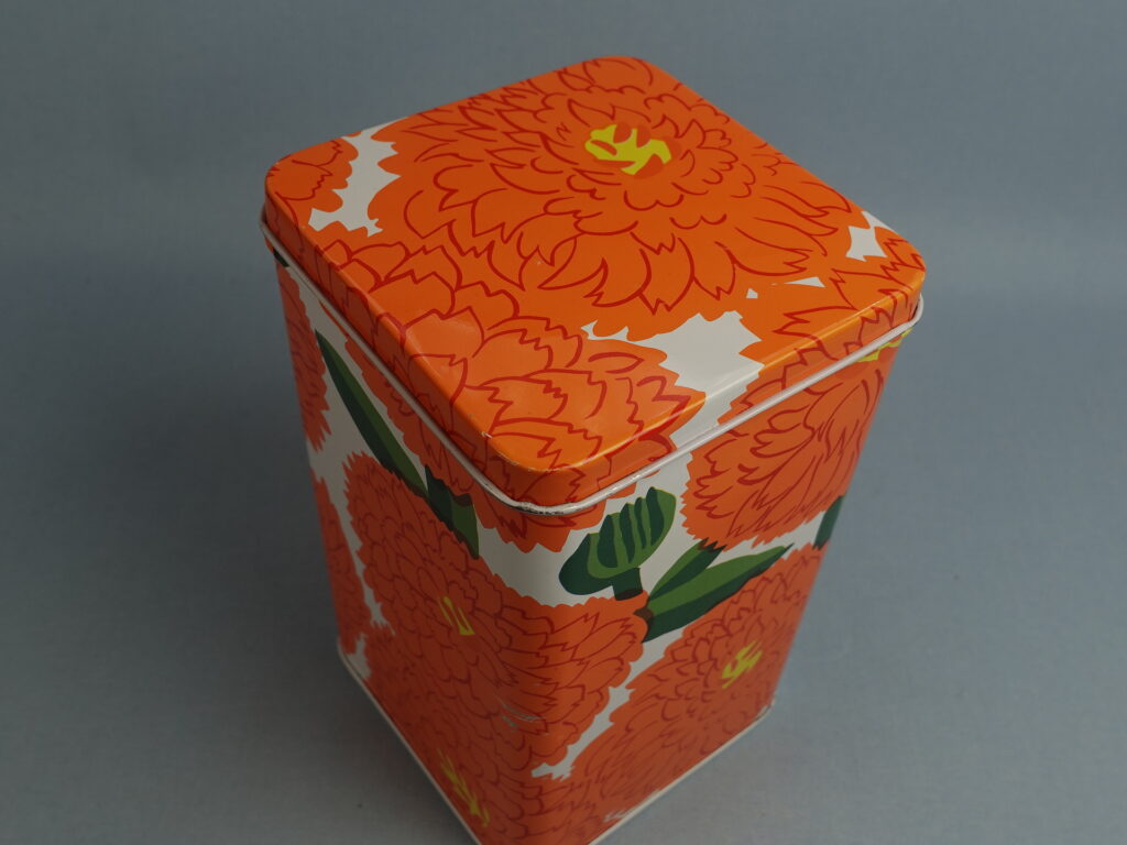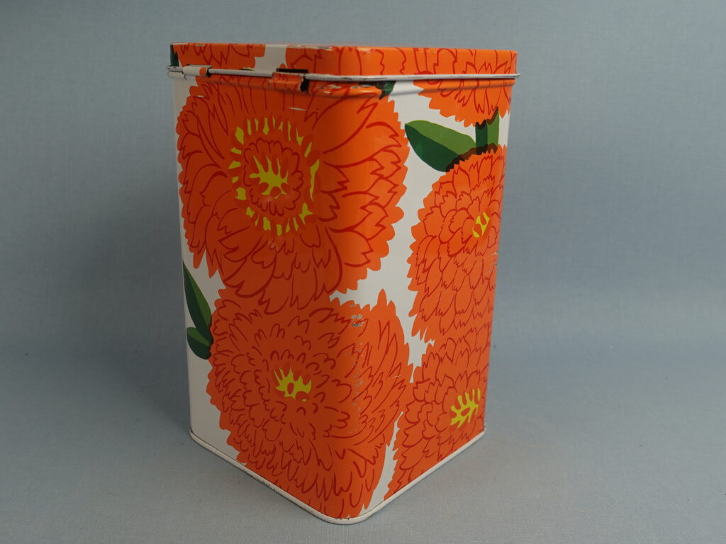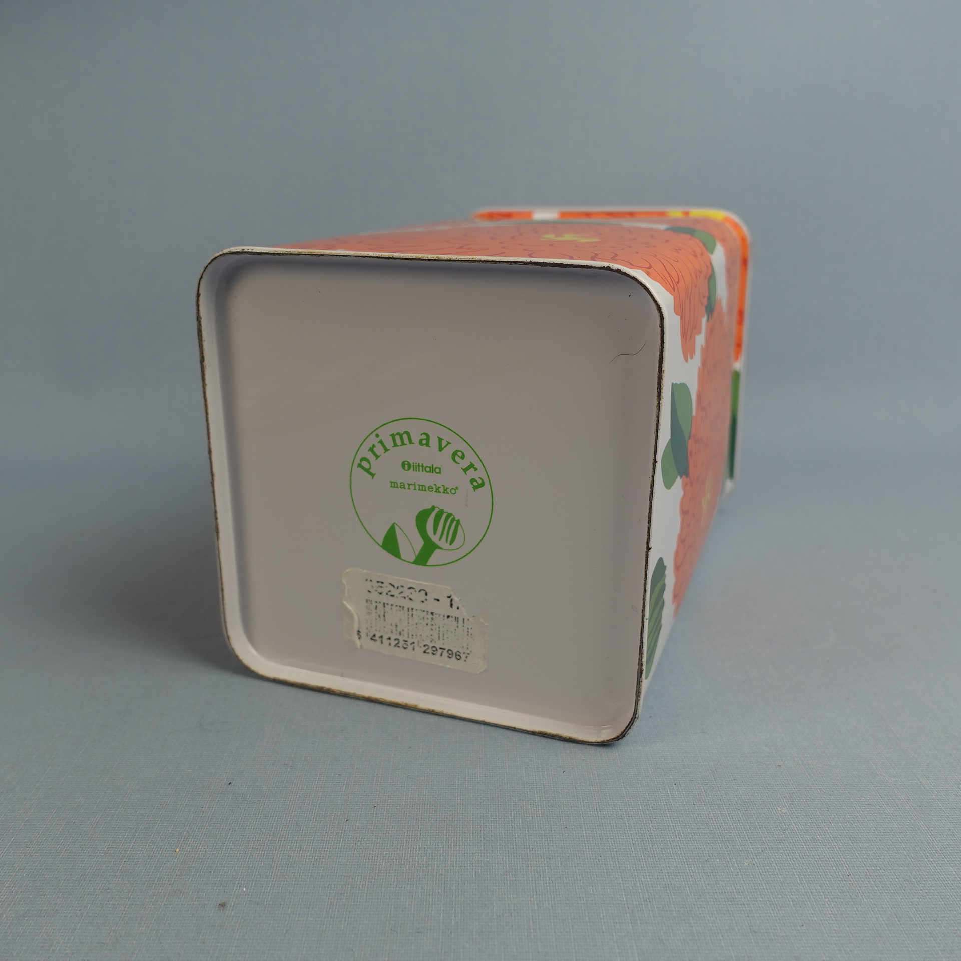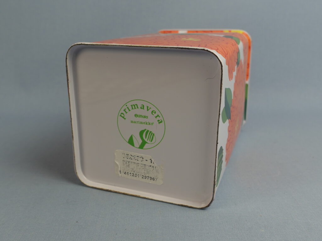 Maija Isolan Marimekolle suunnitteleman oranssin Primavera-sarjan peltipurkki kannella. Purkin kansi on saranoitu. Purkin korkeus on 17,5 cm ja halkaisija 10,5 cm. Myynnissä oleva purkki on ehjä ja siistikuntoinen, mutta koristeessa on kahdessa kohdassa naarmuja kts. kuvat.
