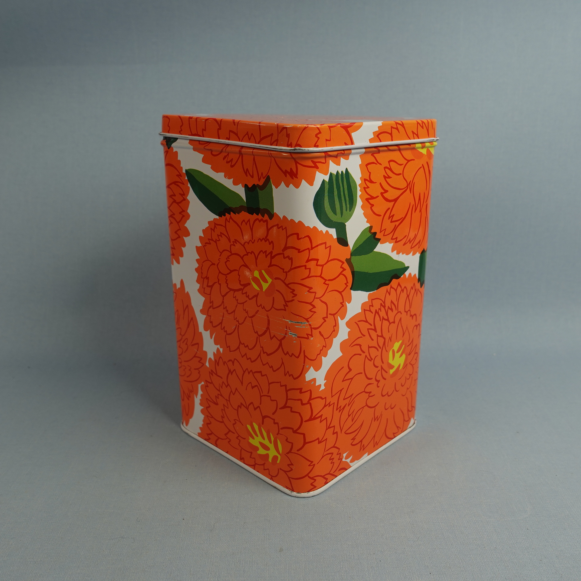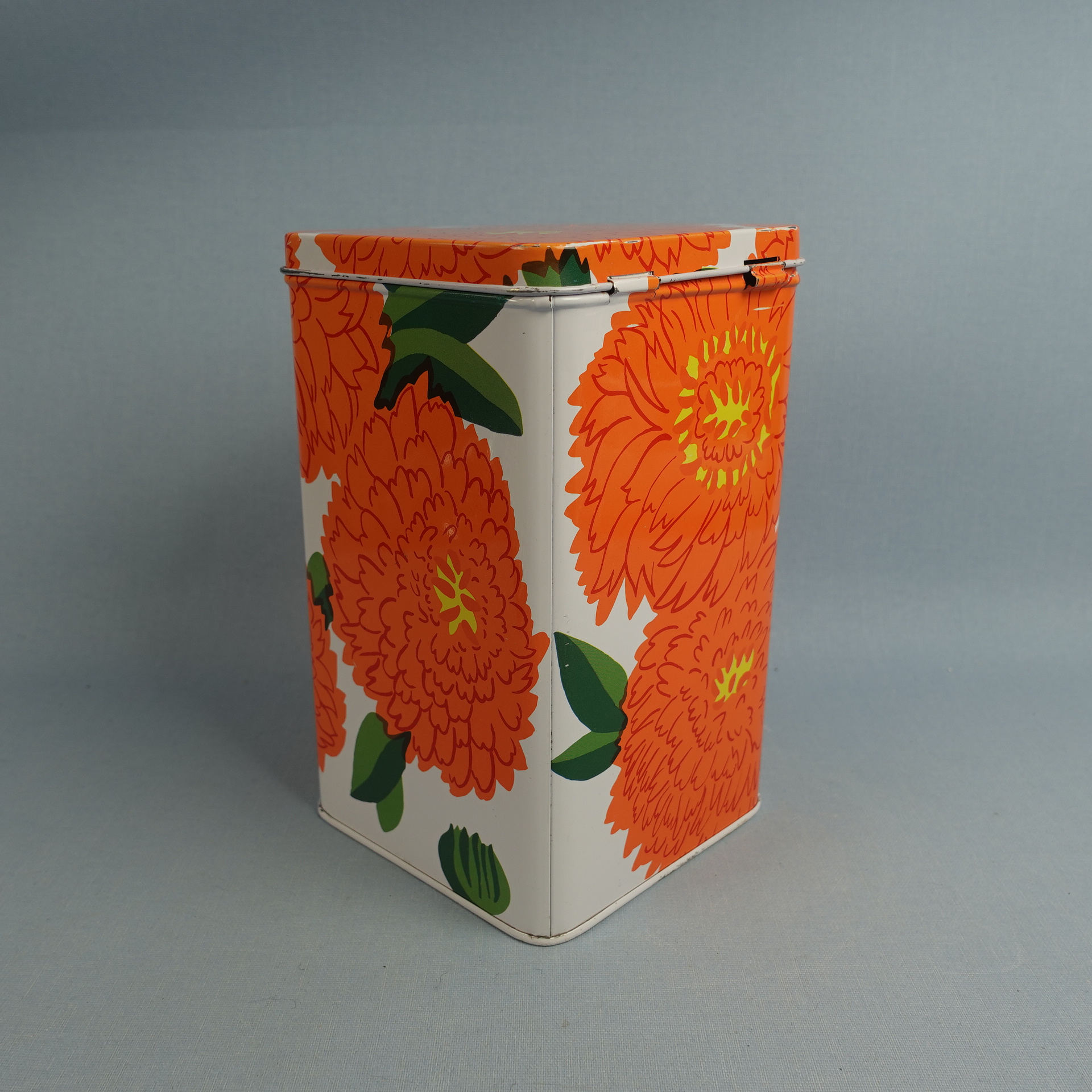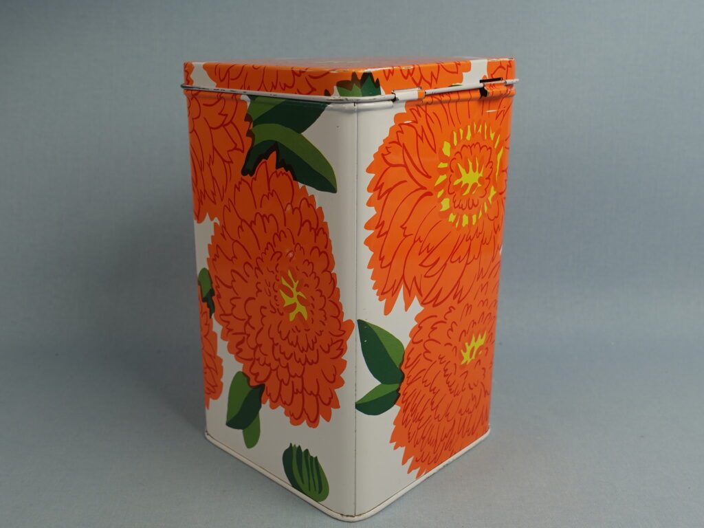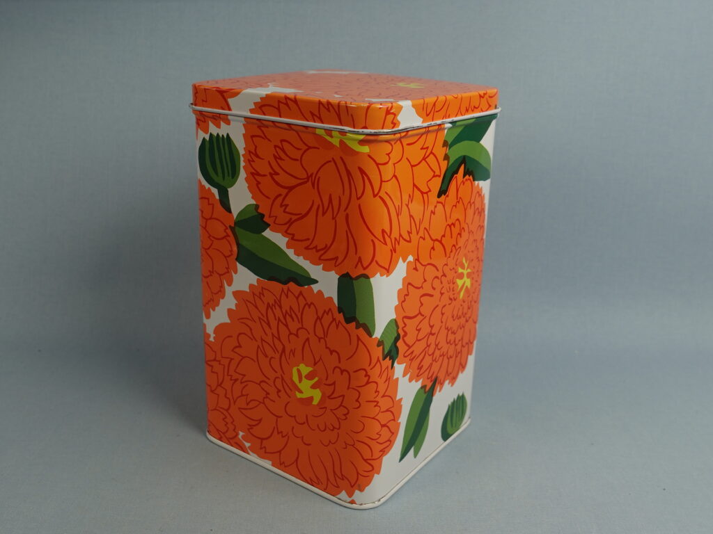 Maija Isolan Marimekolle suunnitteleman oranssin Primavera-sarjan peltipurkki kannella. Purkin kansi on saranoitu. Purkin korkeus on 17,5 cm ja halkaisija 10,5 cm. Myynnissä oleva purkki on ehjä ja siistikuntoinen, mutta koristeessa on kahdessa kohdassa naarmuja kts. kuvat.