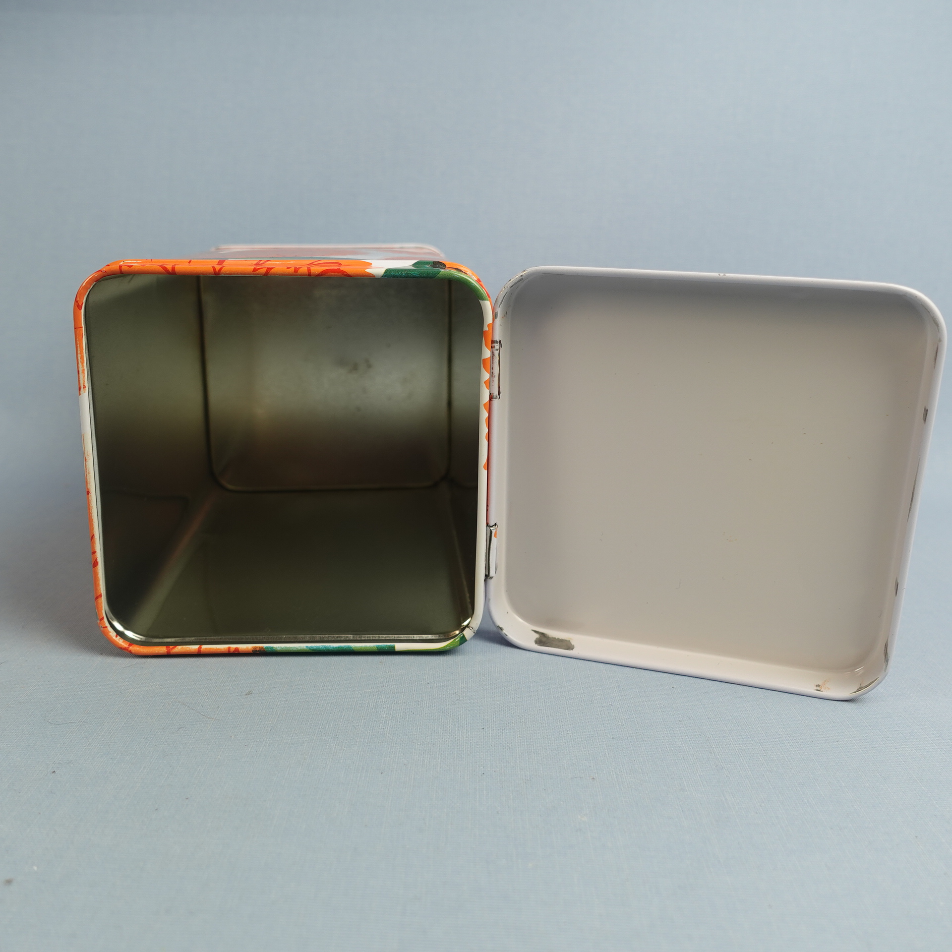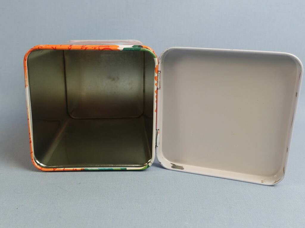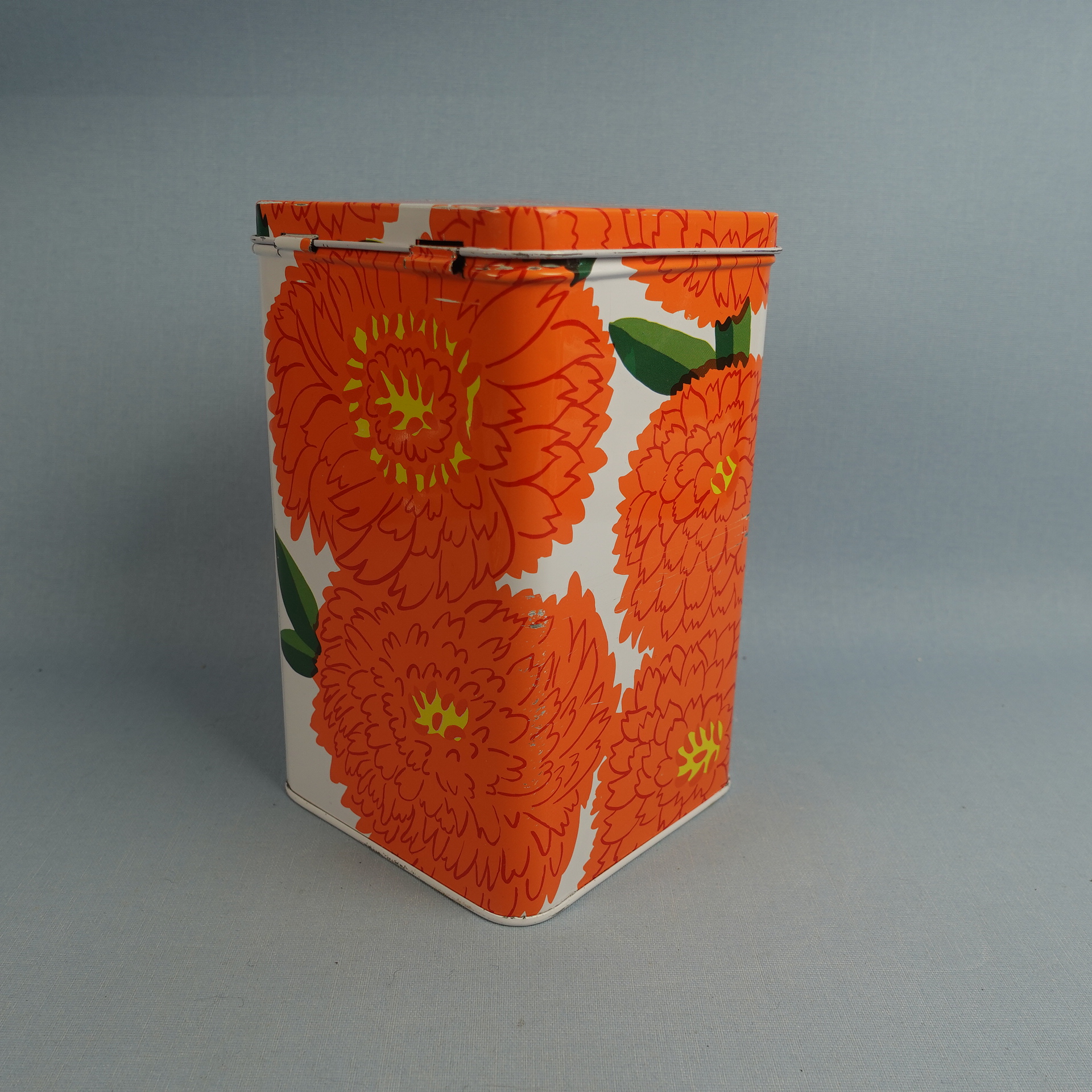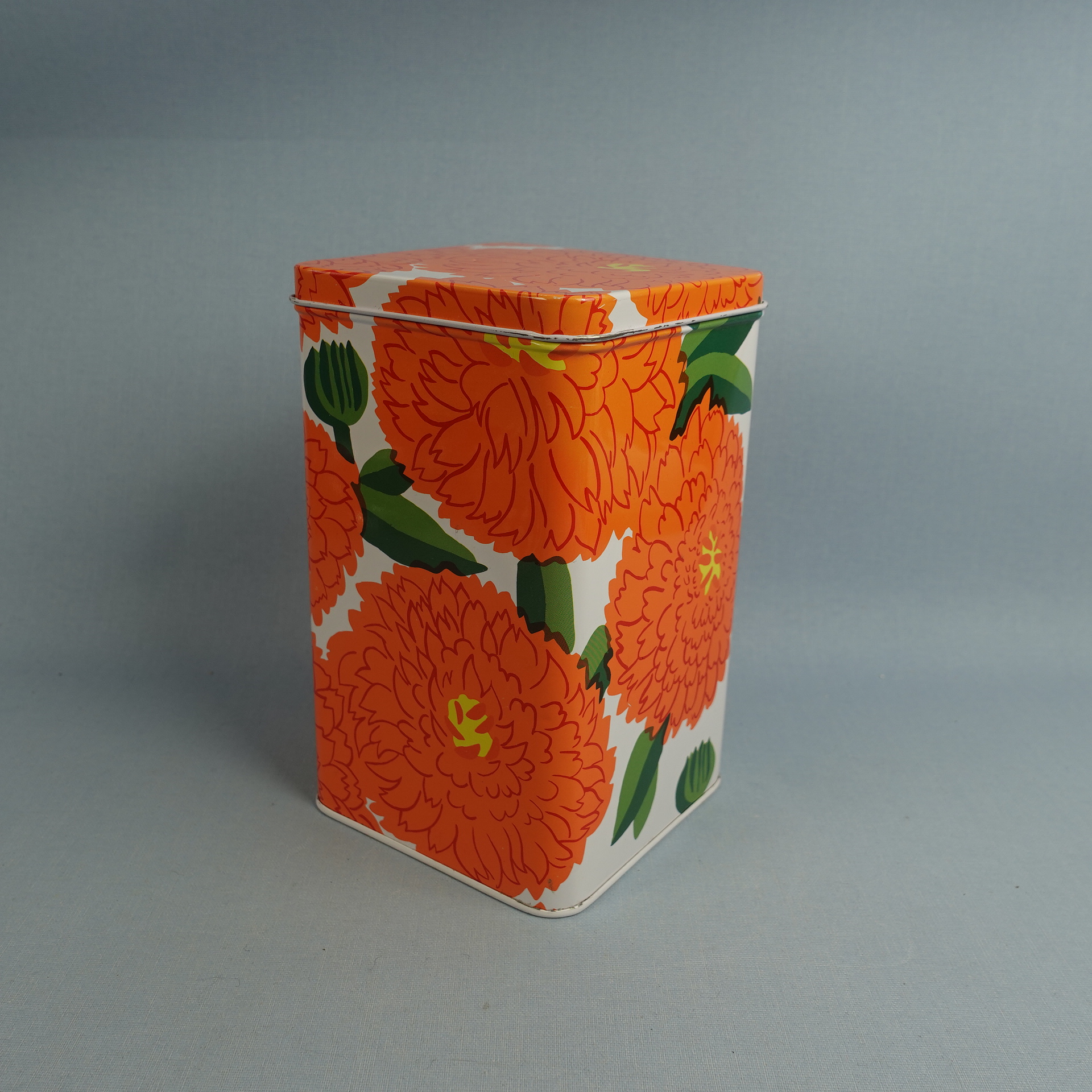 Maija Isolan Marimekolle suunnitteleman oranssin Primavera-sarjan peltipurkki kannella. Purkin kansi on saranoitu. Purkin korkeus on 17,5 cm ja halkaisija 10,5 cm. Myynnissä oleva purkki on ehjä ja siistikuntoinen, mutta koristeessa on kahdessa kohdassa naarmuja kts. kuvat.
