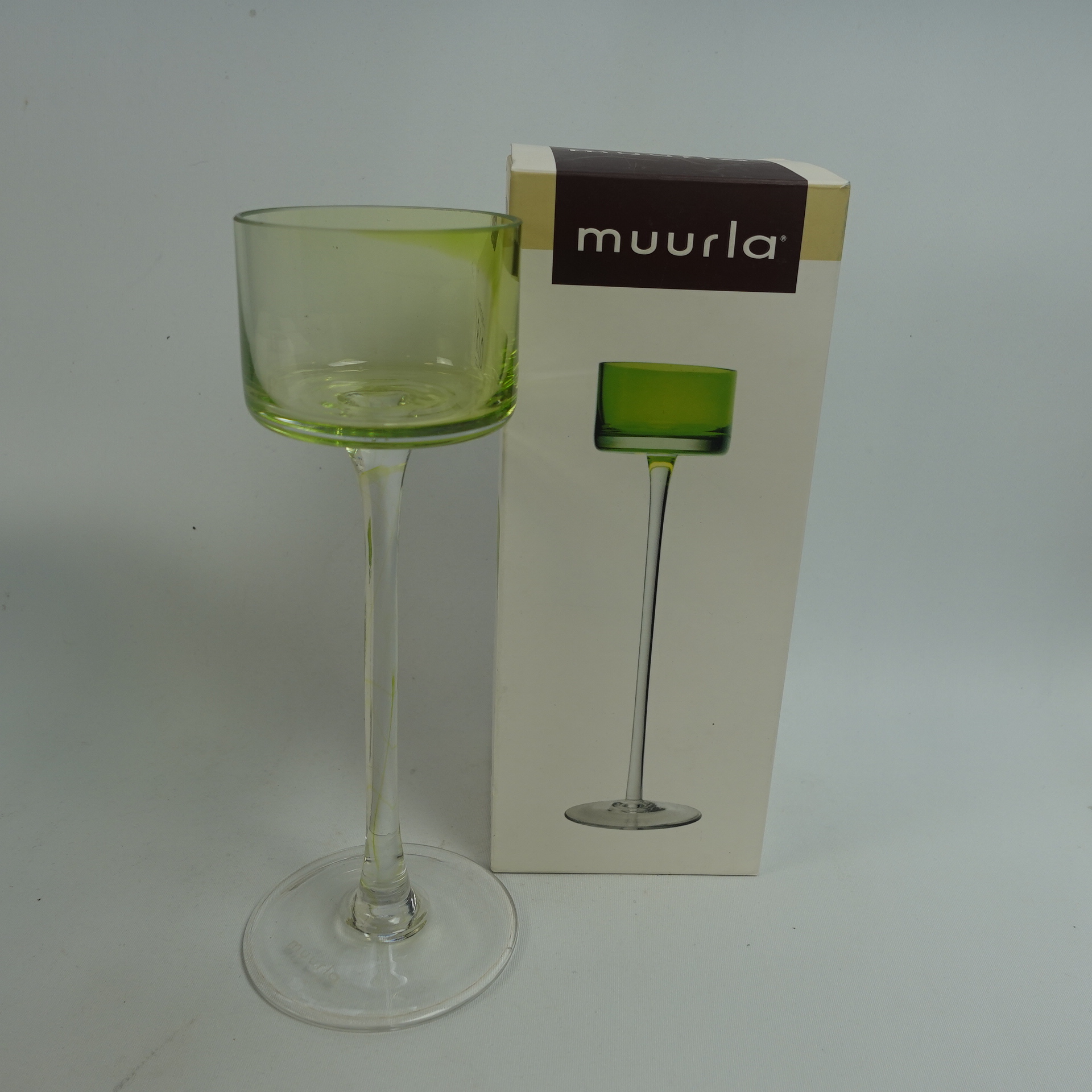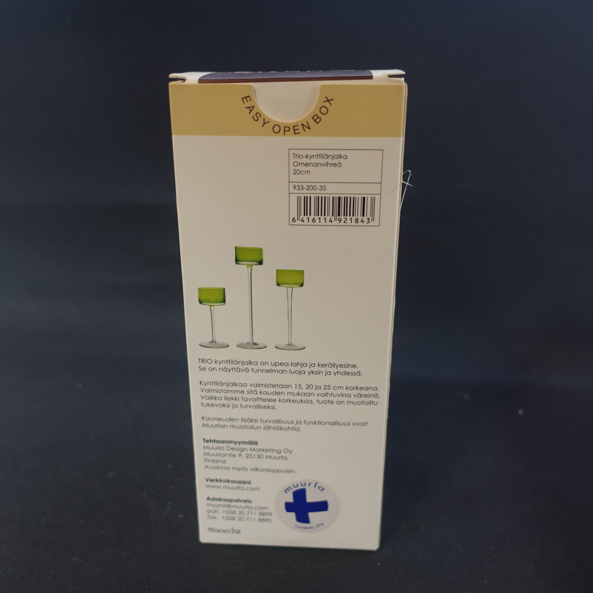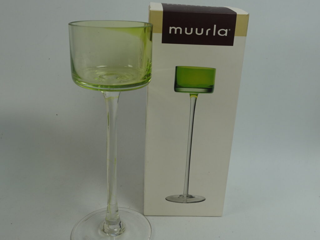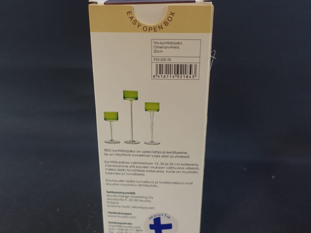 Muurlan valmistama omenanvihreä Trio kynttilänjalka. Kynttilänjalkoja valmistettiin 3 eri korkeutta useassa eri värissä. Myynnissä oleva kynttilänjalka on 20 cm korkea. Kynttilänjalka on käyttämätön ja se on alkuperäisessä myyntipakkauksessa.