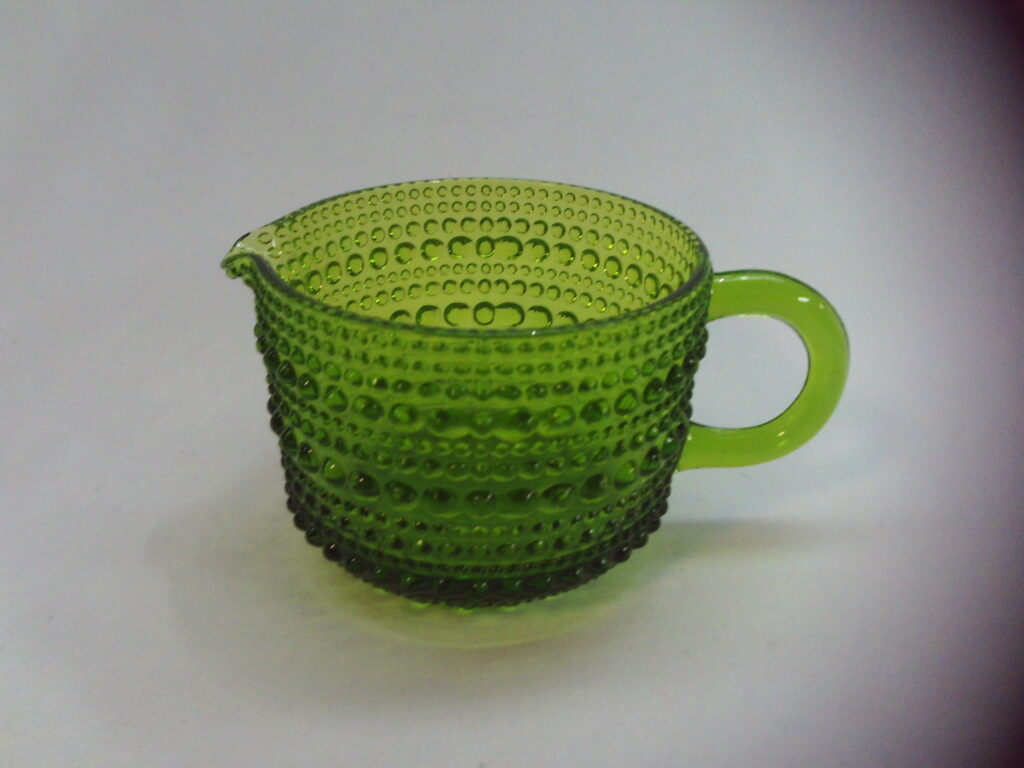 Oiva Toikan Nuutajärven lasille suunnitteleman Kastehelmi-sarjan (vanha)vihreä sokerikko ja kermakko.Väri oli tuotannossa 1960/70-lukujen vaihteessa. Sokerikon halkaisija on 11 cm, korkeus 5 cm ja tilavuus 23 cl. Kermakon korkeus on 5 cm, halkaisija 7 cm ja tilavuus 12 cl. Myynnissä olevat sokerikko ja kermakko ovat ehjiä ja muutenkin hyväkuntoisia. Ne myydään erillisinä tuotteina.